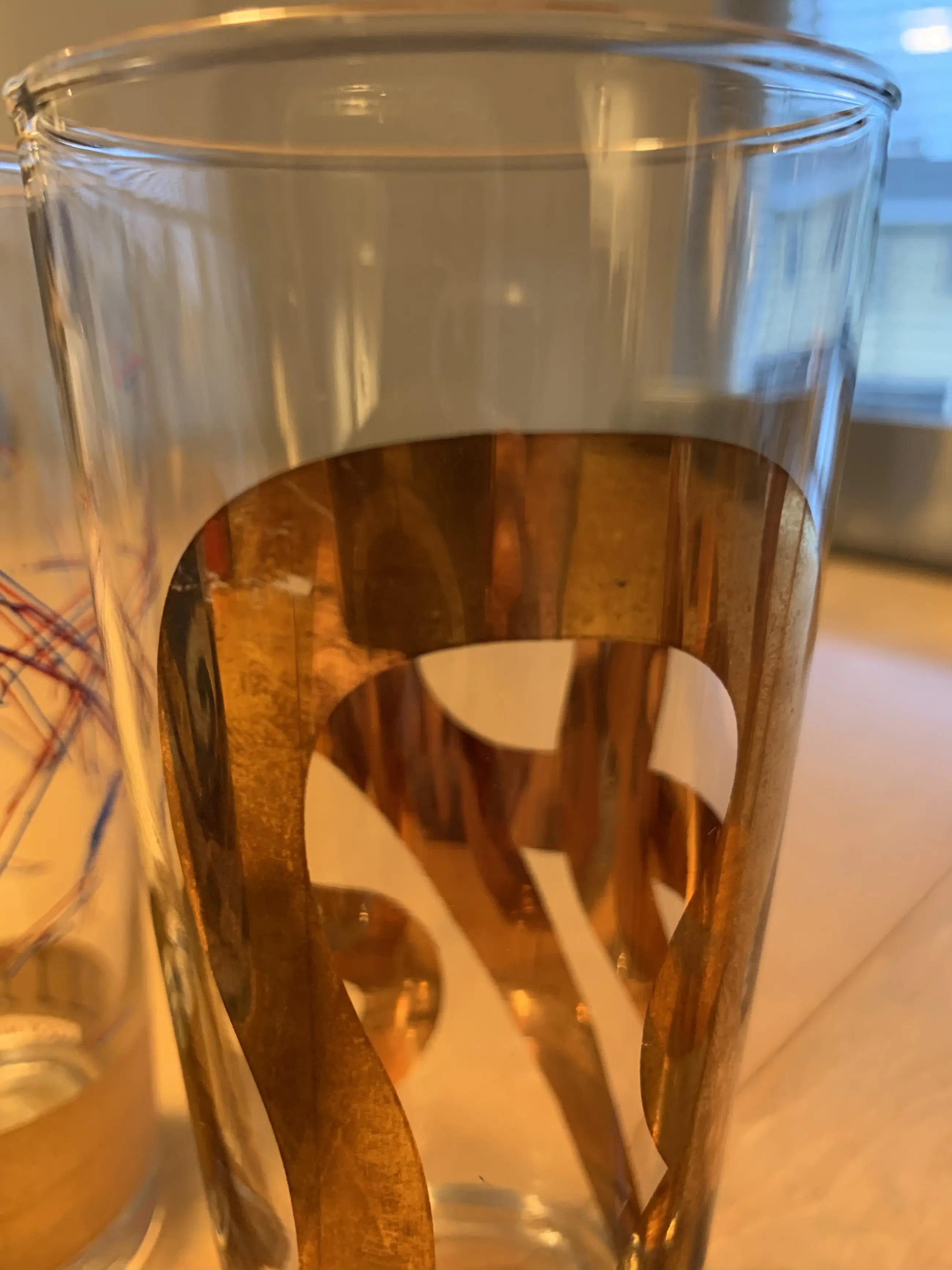 Eén glas van Röling heeft een kleine beschadiging in het gouden patroon.