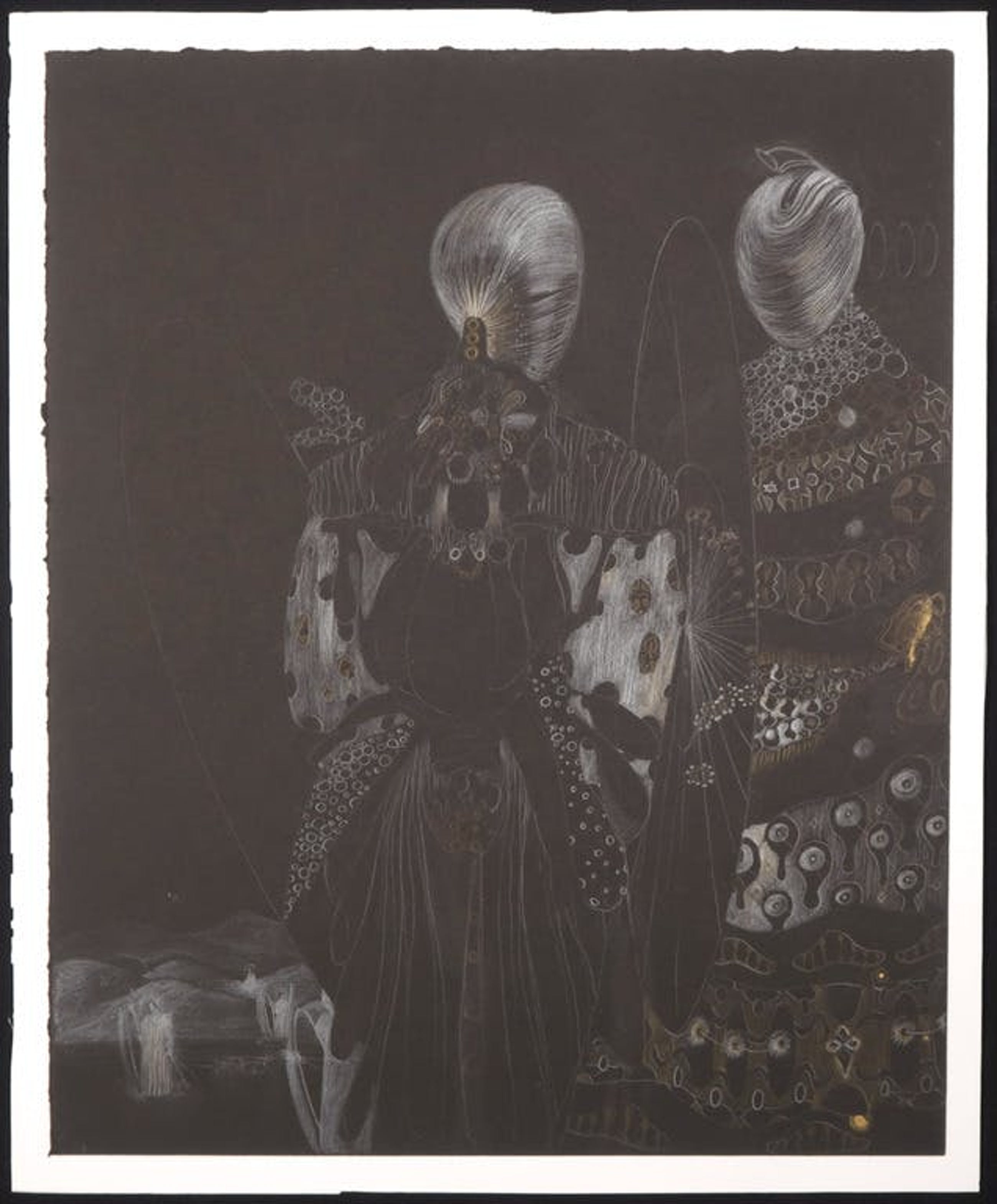 Materiaal: Potloodtekening op zwart papier, bevestigd op stevig onderblad