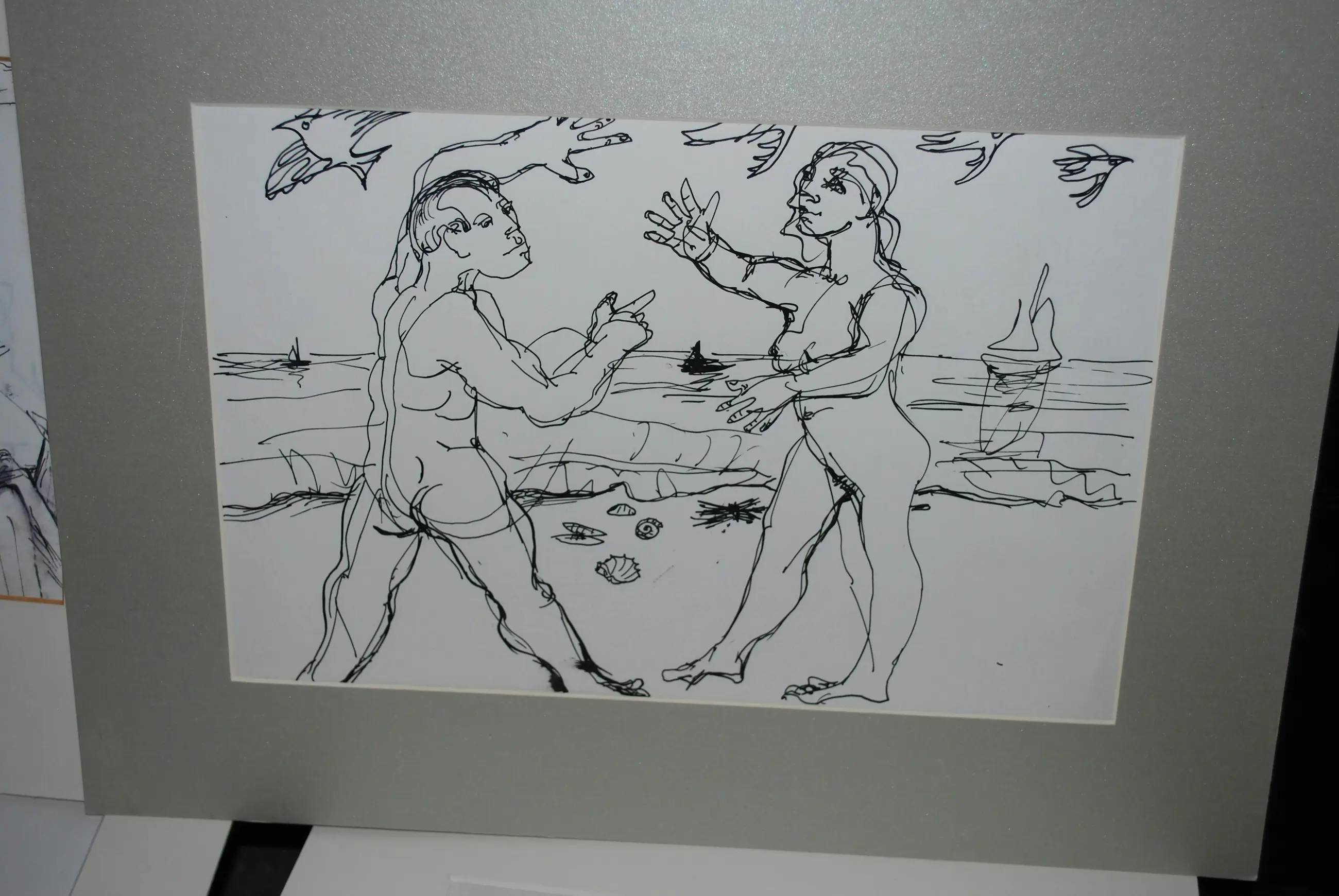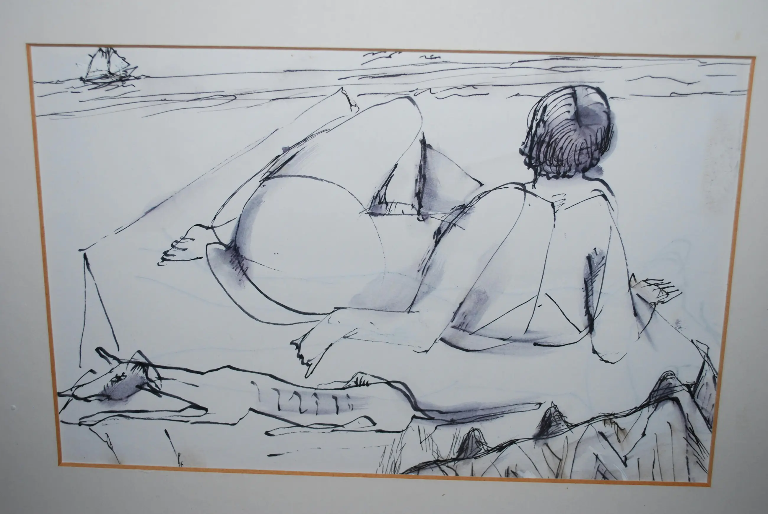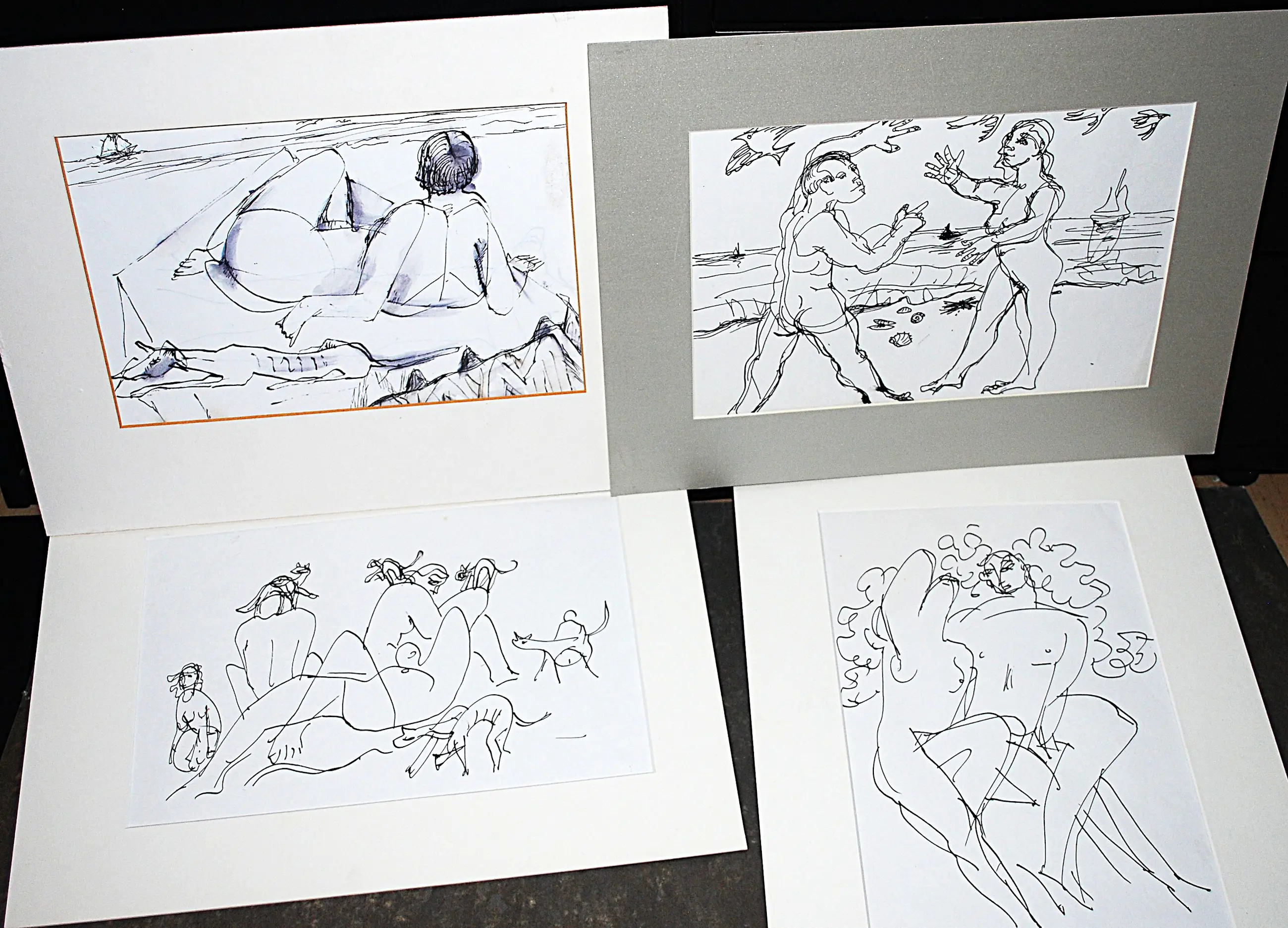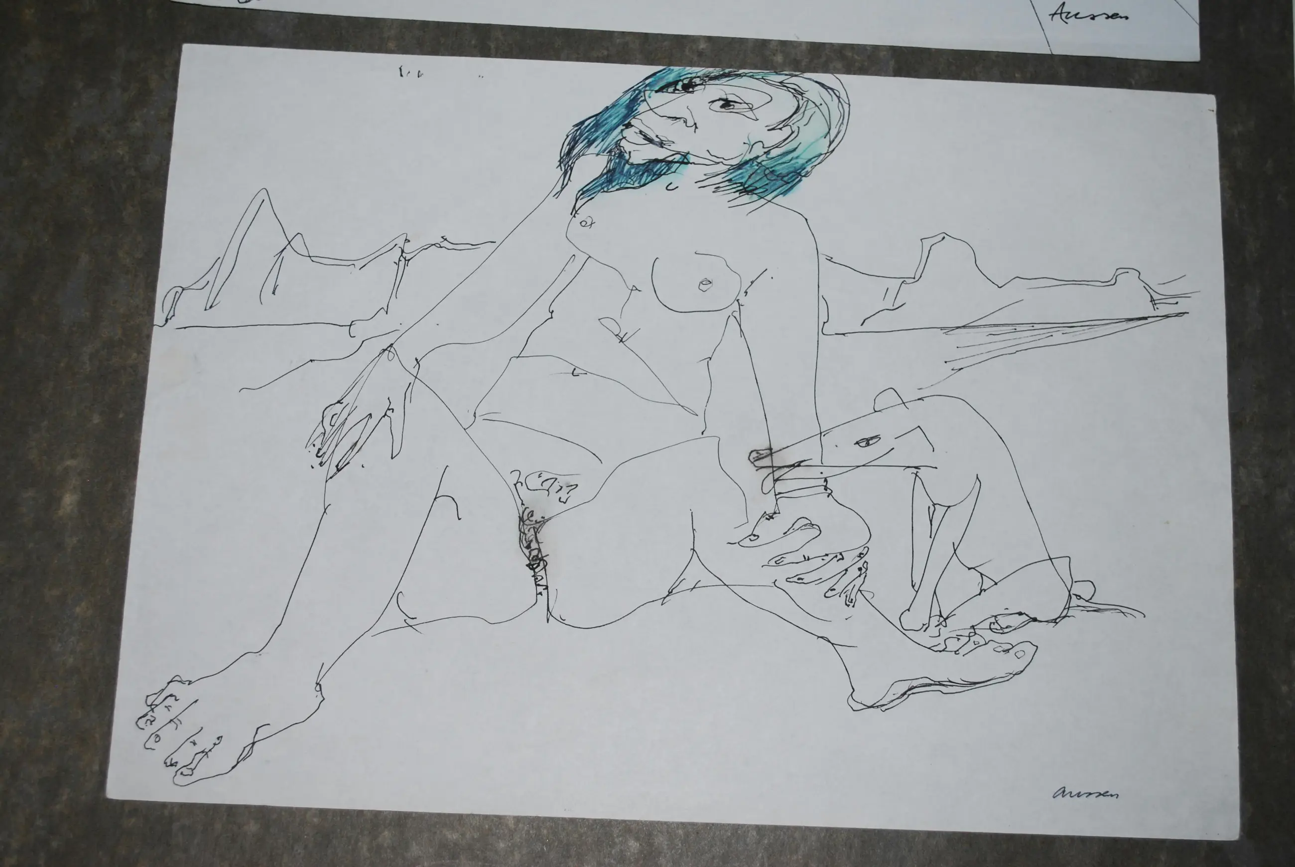 Uit de nalatenschap van Aussen: Met name strandscenes (ca. 1983) -4 inkttekeningen achter passepartout. Bladmaten ca 21x30 cm. 1 daarvan is gesigneerd (onder passepartout): de solitaire dame met de hond. - 5 losse inkttekeningen. Daarvan zijn er 3 gesigneerd.
