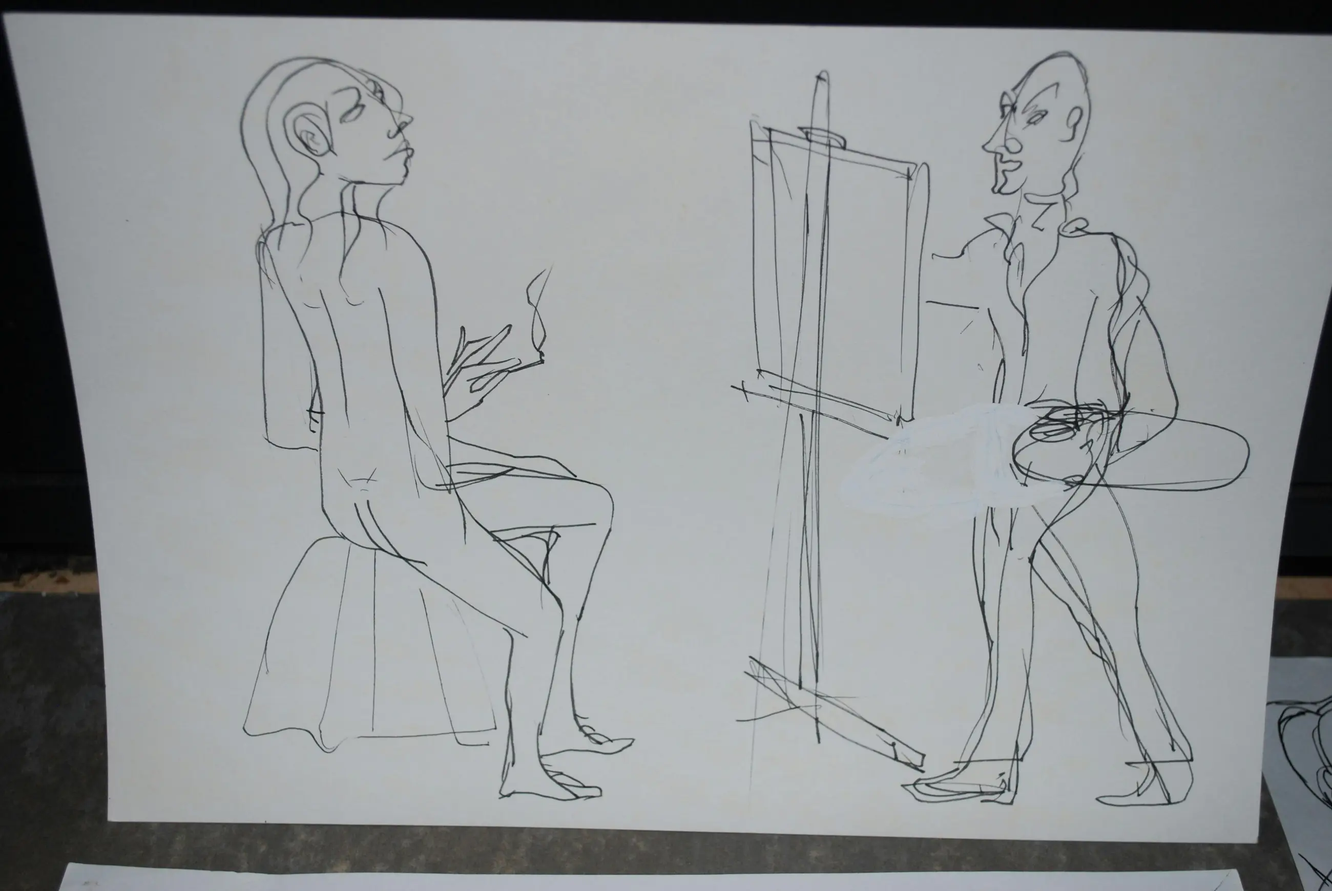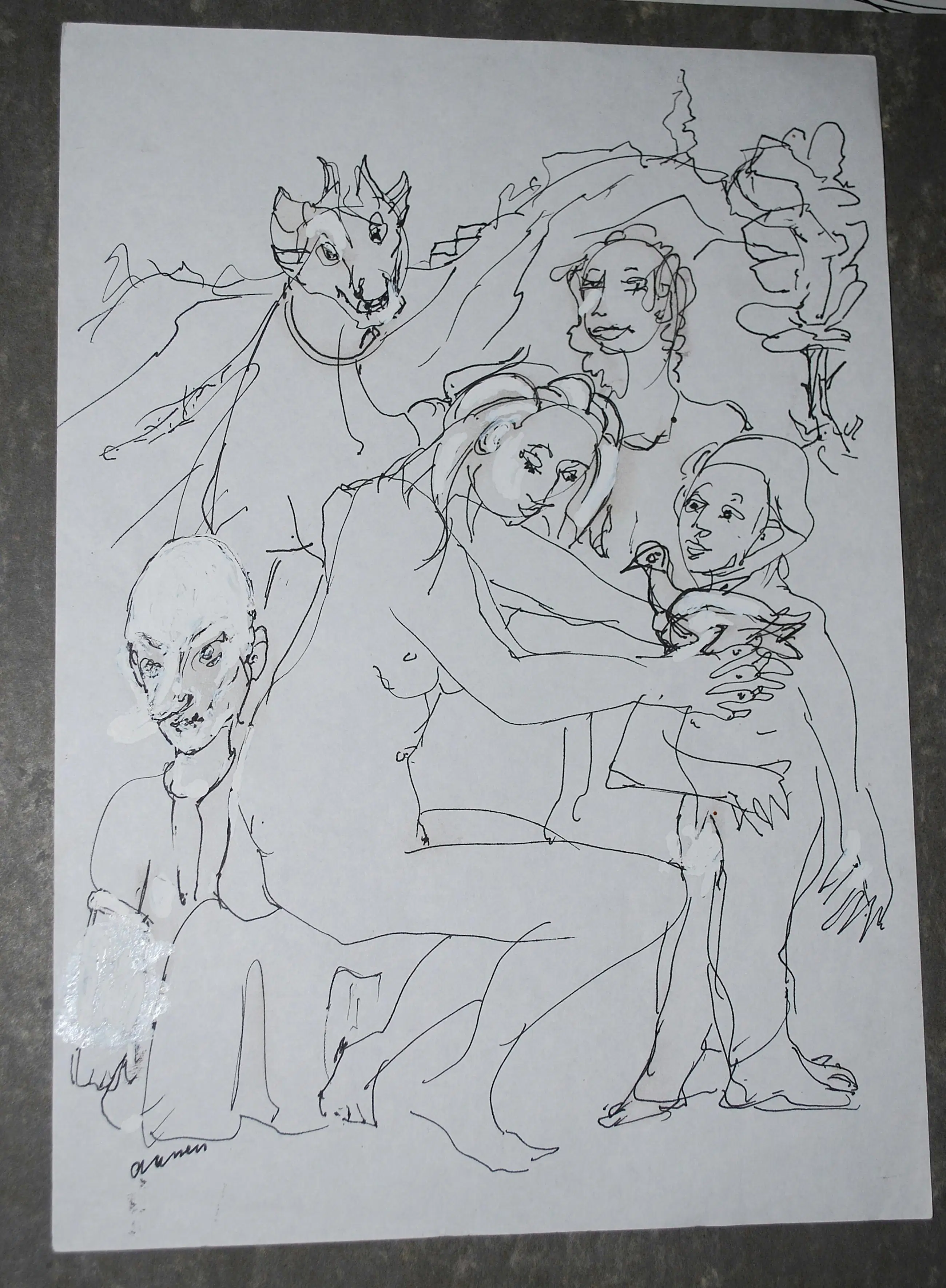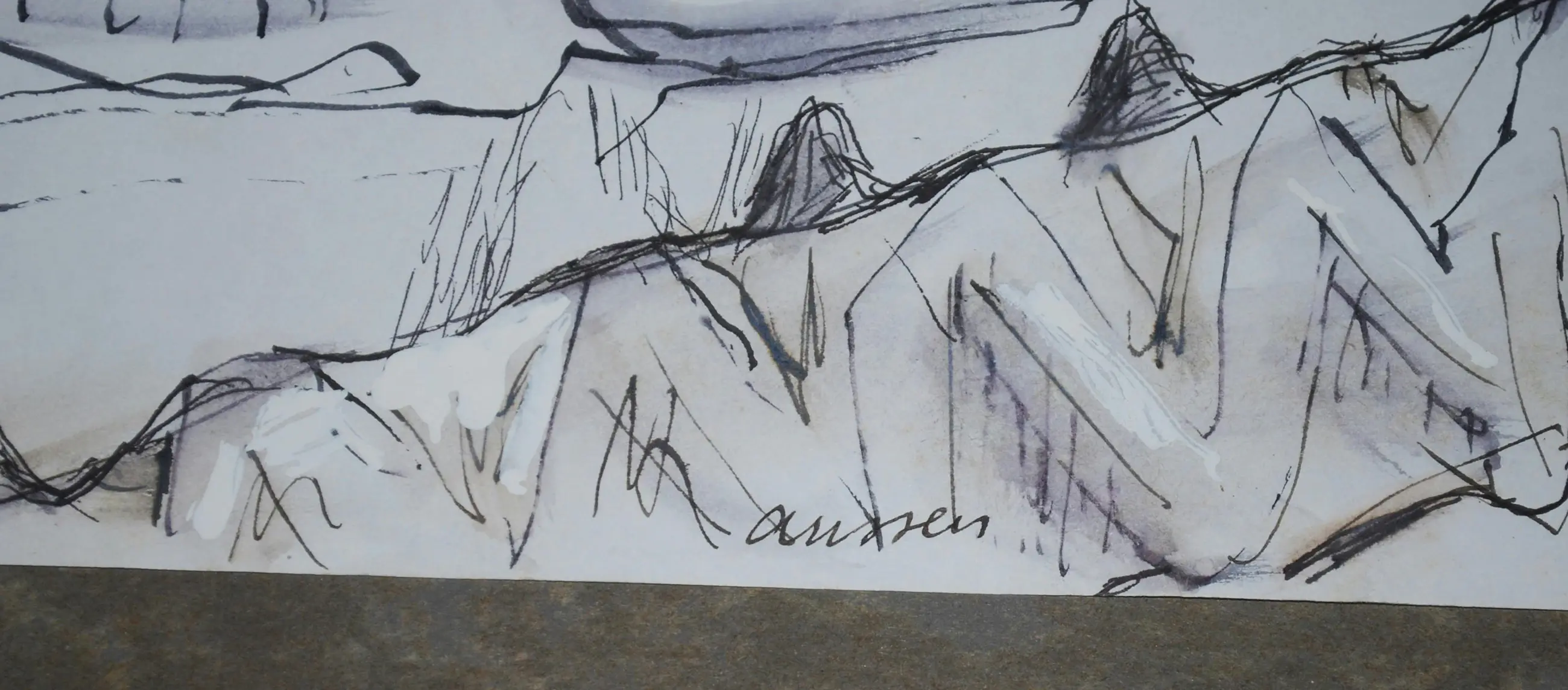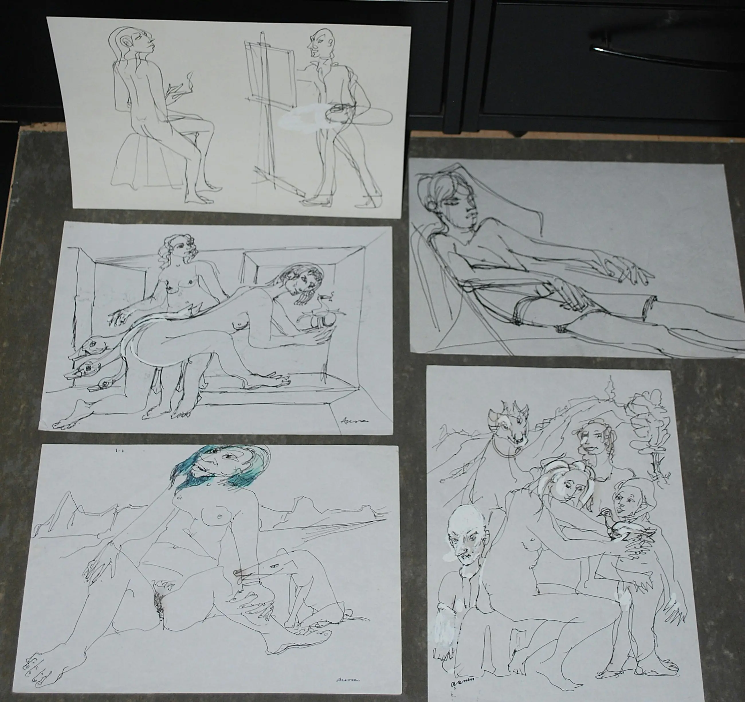 Uit de nalatenschap van Aussen: Met name strandscenes (ca. 1983) -4 inkttekeningen achter passepartout. Bladmaten ca 21x30 cm. 1 daarvan is gesigneerd (onder passepartout): de solitaire dame met de hond. - 5 losse inkttekeningen. Daarvan zijn er 3 gesigneerd.