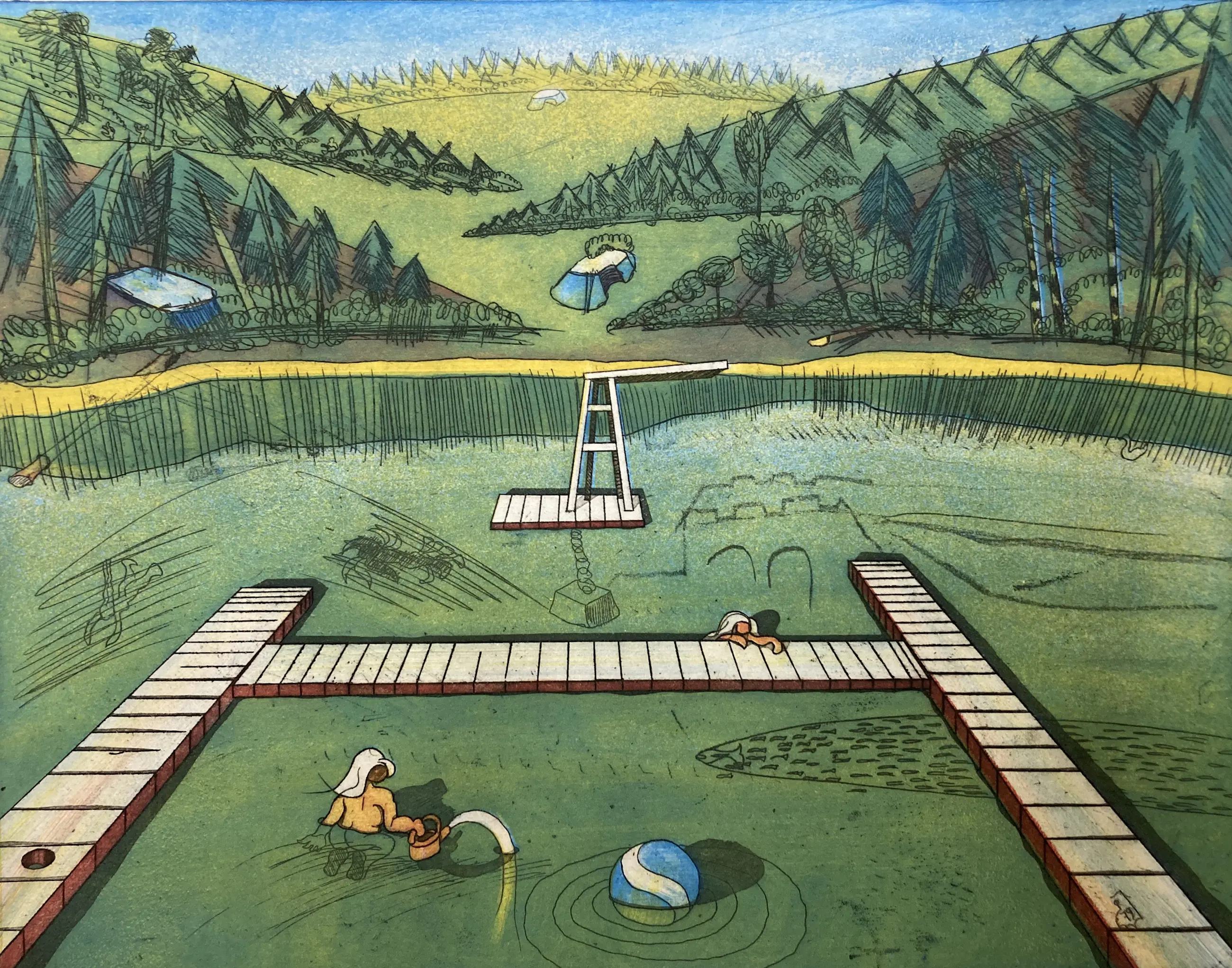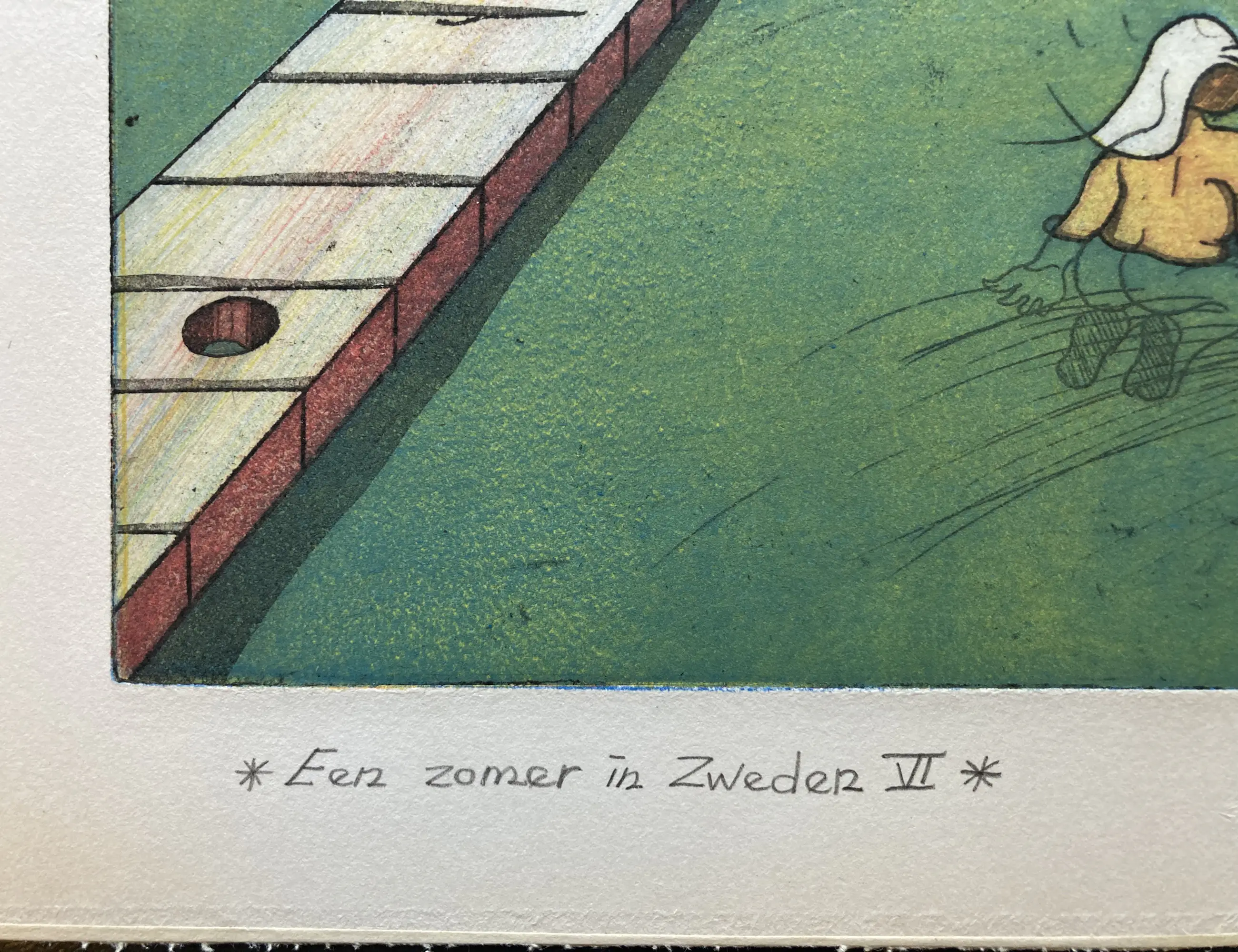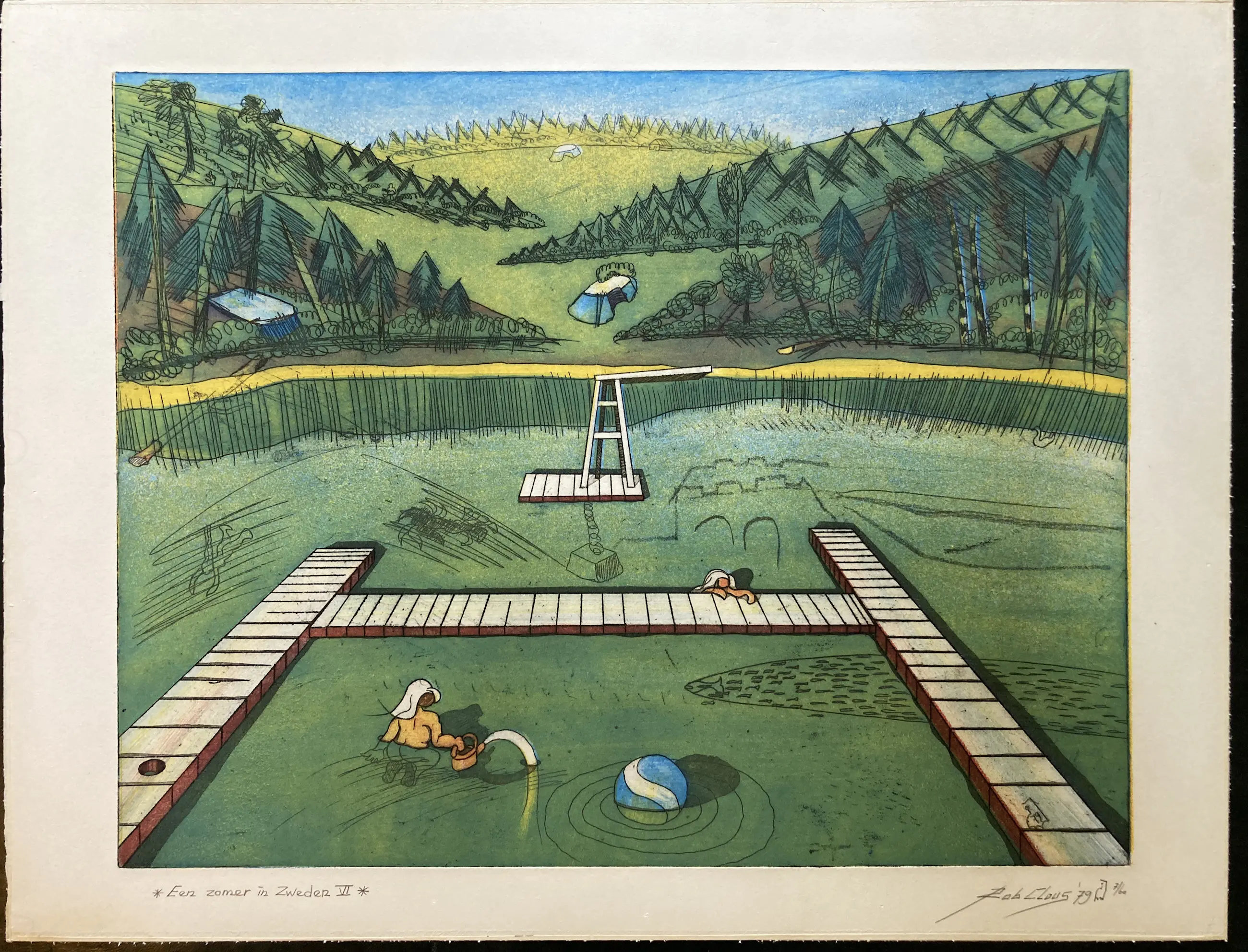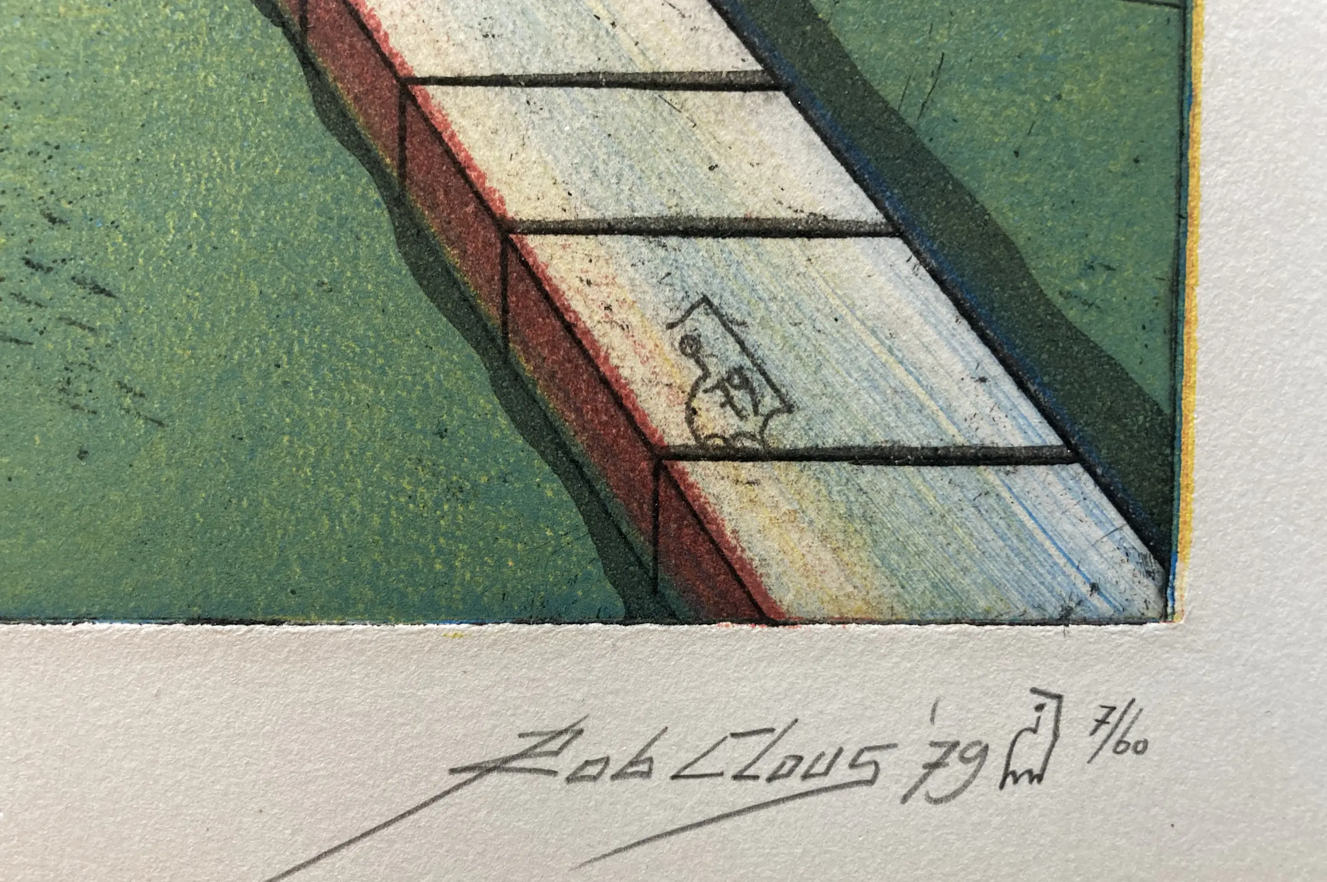 Karakteristieke kleurets van de Haarlemse kunstenaar Rob Clous. Jaar: 1979. Oplage: 7/60. Gesigneerd en gedateerd met potlood. Niet ingelijst. Afmeting werk: 42 x 54 cm; blad: 50 x 65 cm.