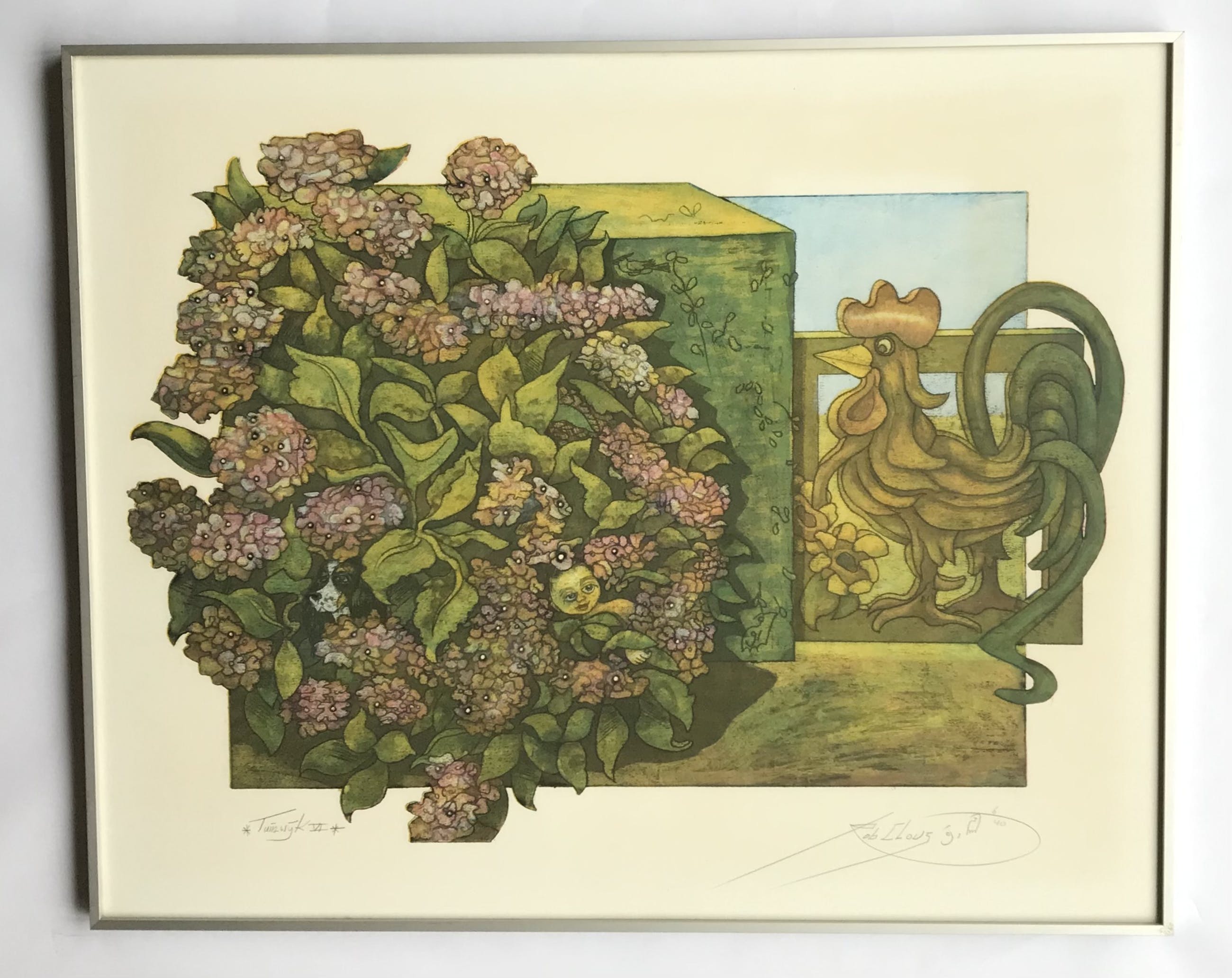 Mooie ets/aquatint van Rob Clous. Noem het romantisch / surrealistisch of anders, de stijl is typerend voor deze kunstenaar. Netjes ingelijst in een aluminium lijst. Ophalen heeft de voorkeur ivm grote glasplaat.
