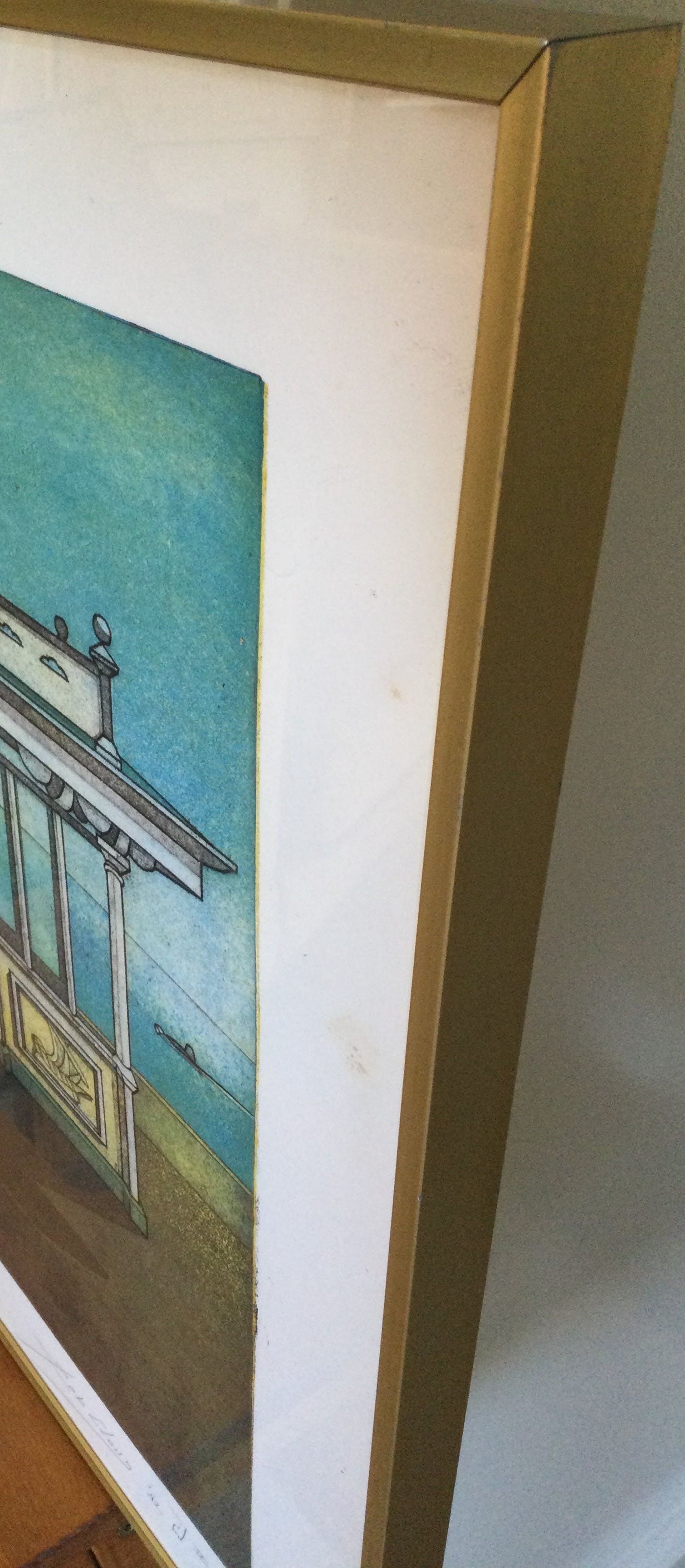 In goede conditie in goudkleurige metalen wissellijst met enige ouderdomssporen. Voorzien van ophangdraad.