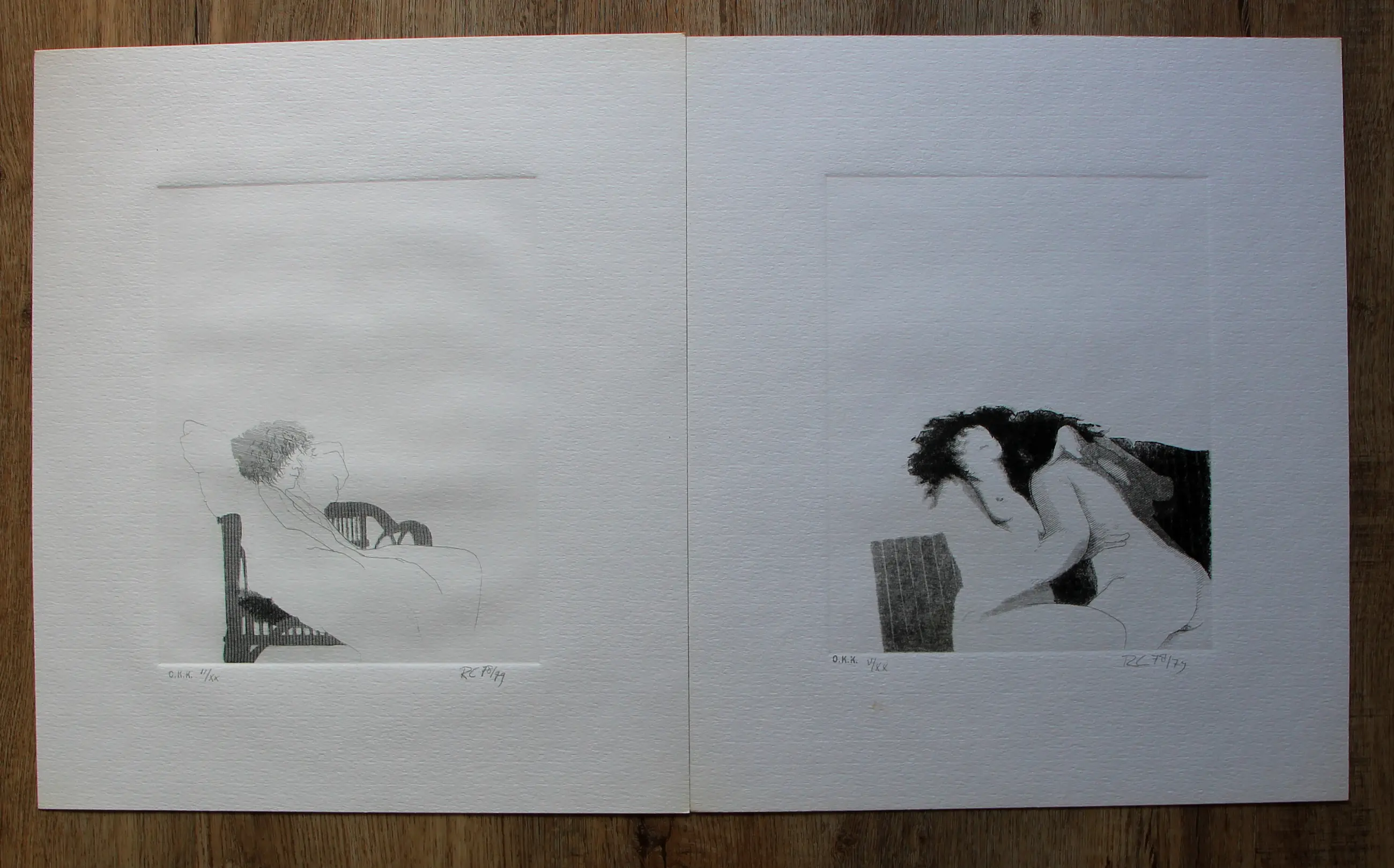 2 etsen van Rob Cox, Titel: grafiek erotiek. Jaartal 1978/1979. Oplage: V/XX en 11/XX . Uitgave van O.K.K.