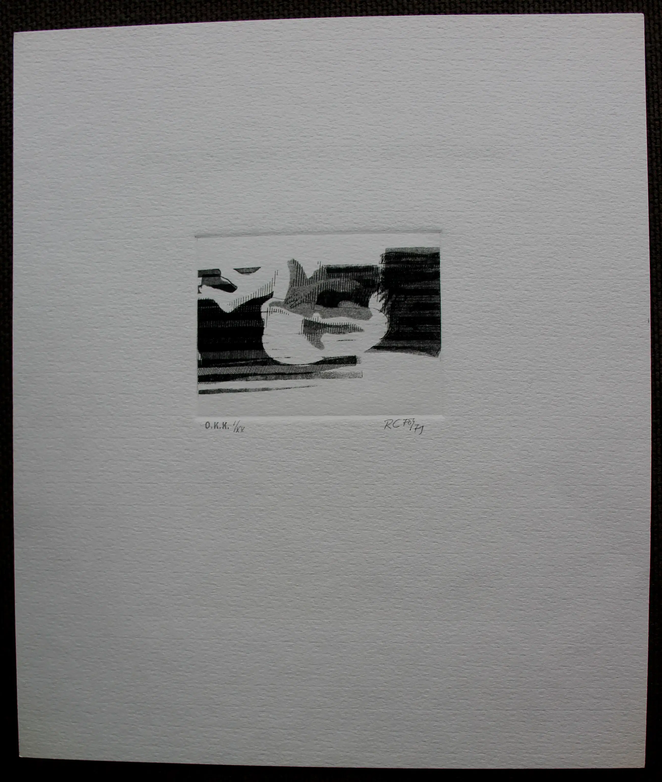 Ets van Rob Cox, Titel: onbekend. Jaartal 1978/1979. Oplage: 1/XX. Afmetingen blad: H50 x B42 cm, Afmetingen voorstelling: H12 x B16.5 cm. Het werk is, rechtsonder, met potlood gesigneerd door de kunstenaar. De authenticiteit van dit werk wordt volledig gegarandeerd. Een certificaat van echtheid kan, op aanvraag, worden gemaild.