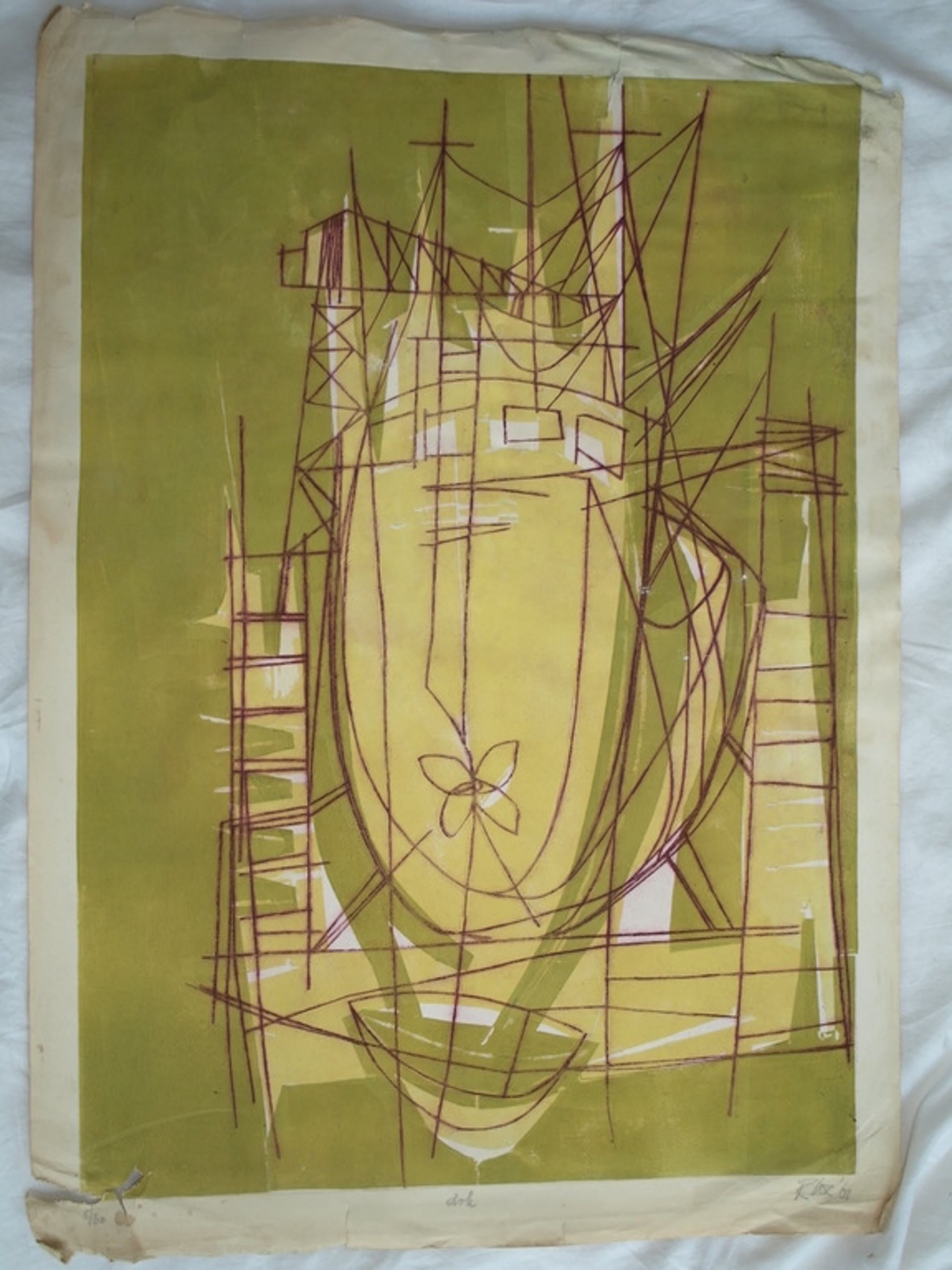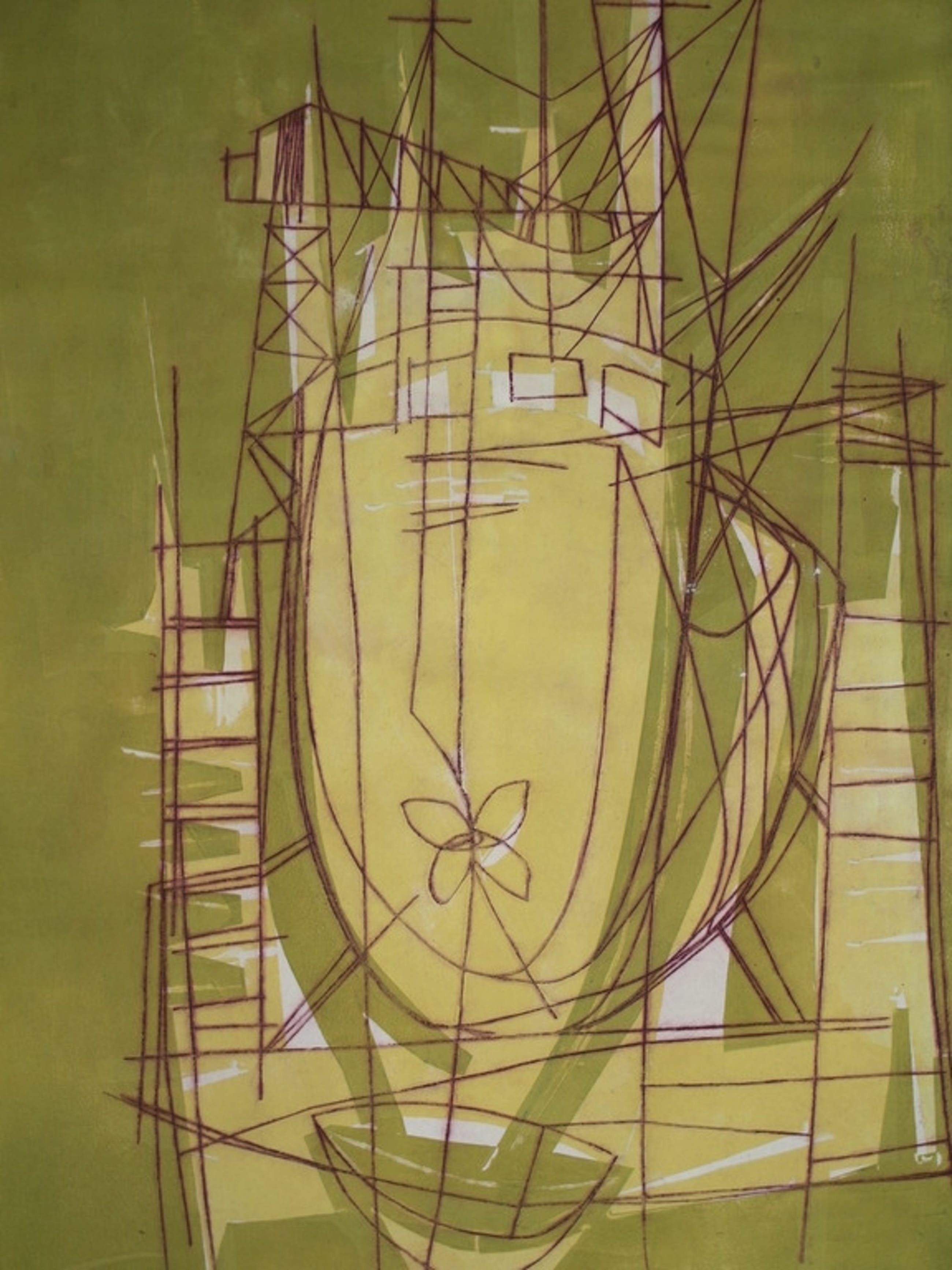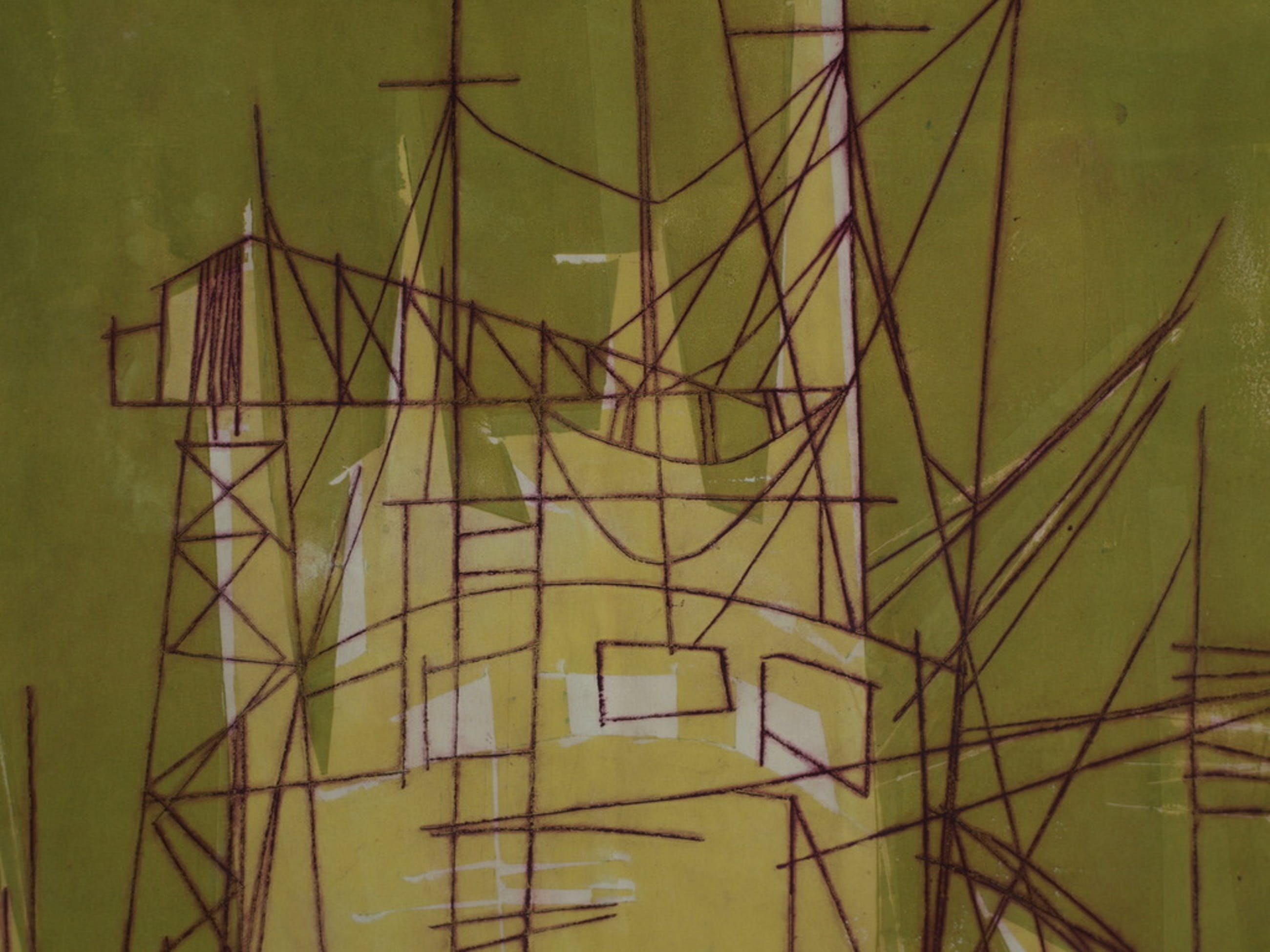 Een kleurenets uit 1961 van de kunstenaar Rob Cox met een afbeelding van een dok in de haven.
