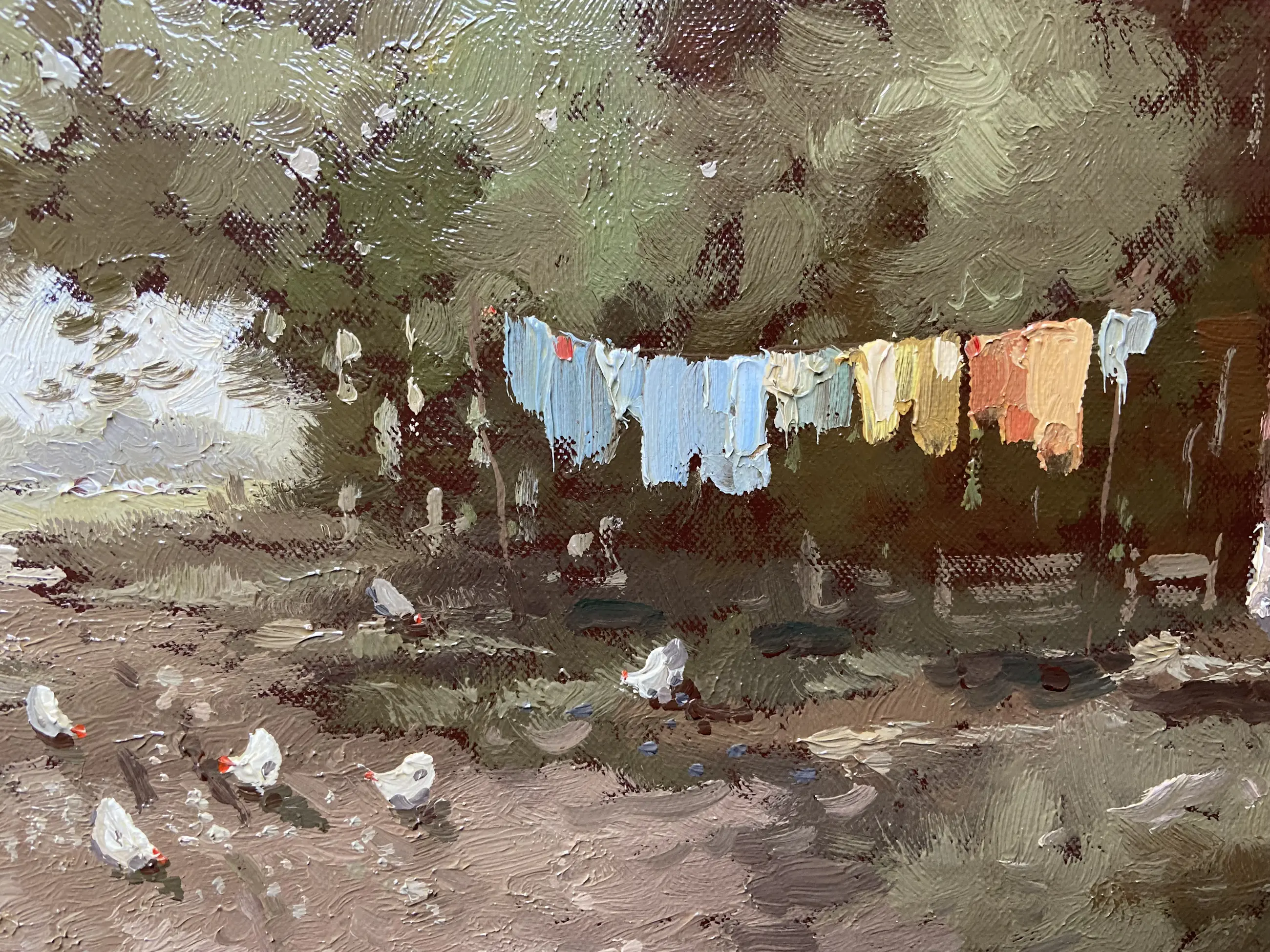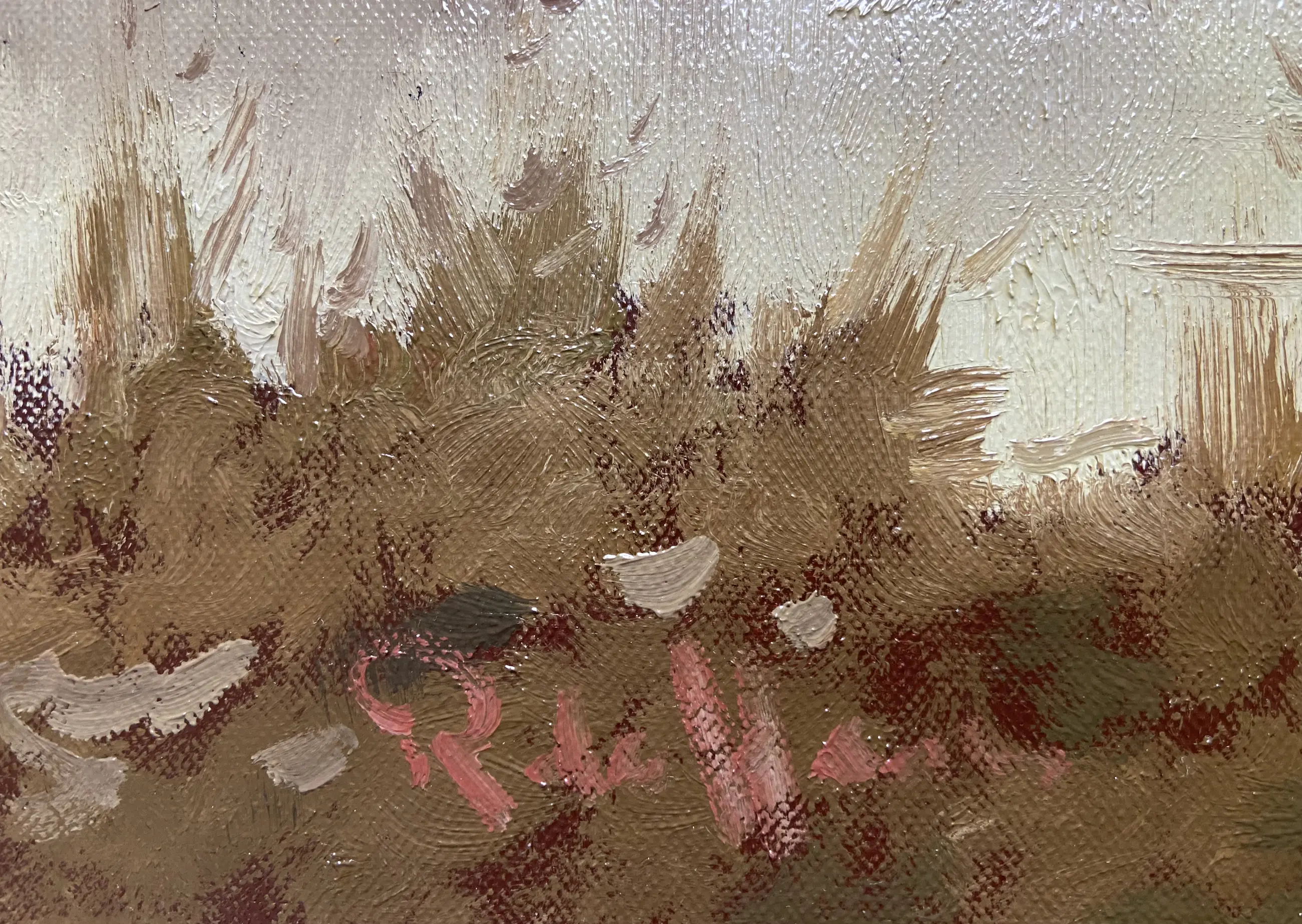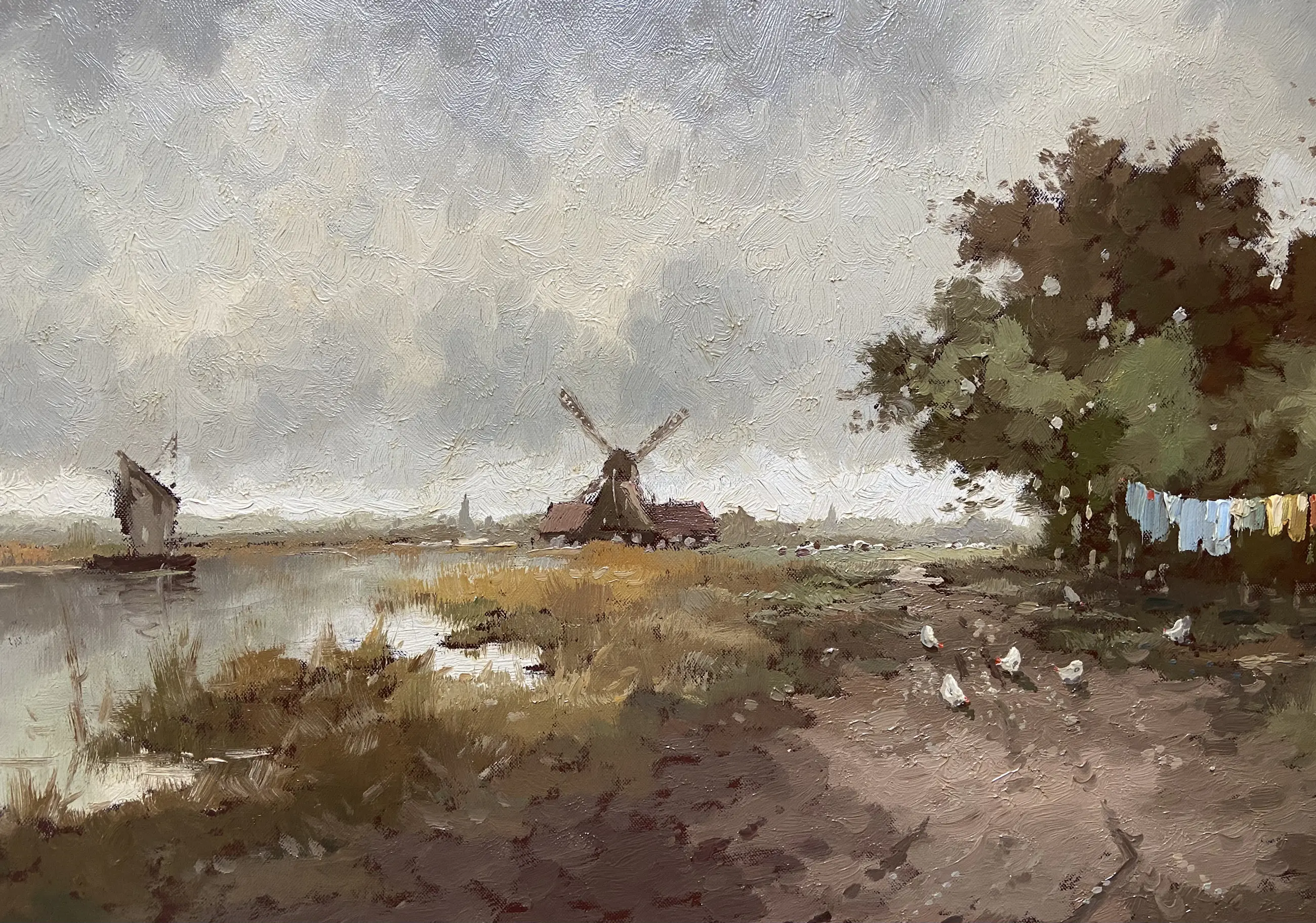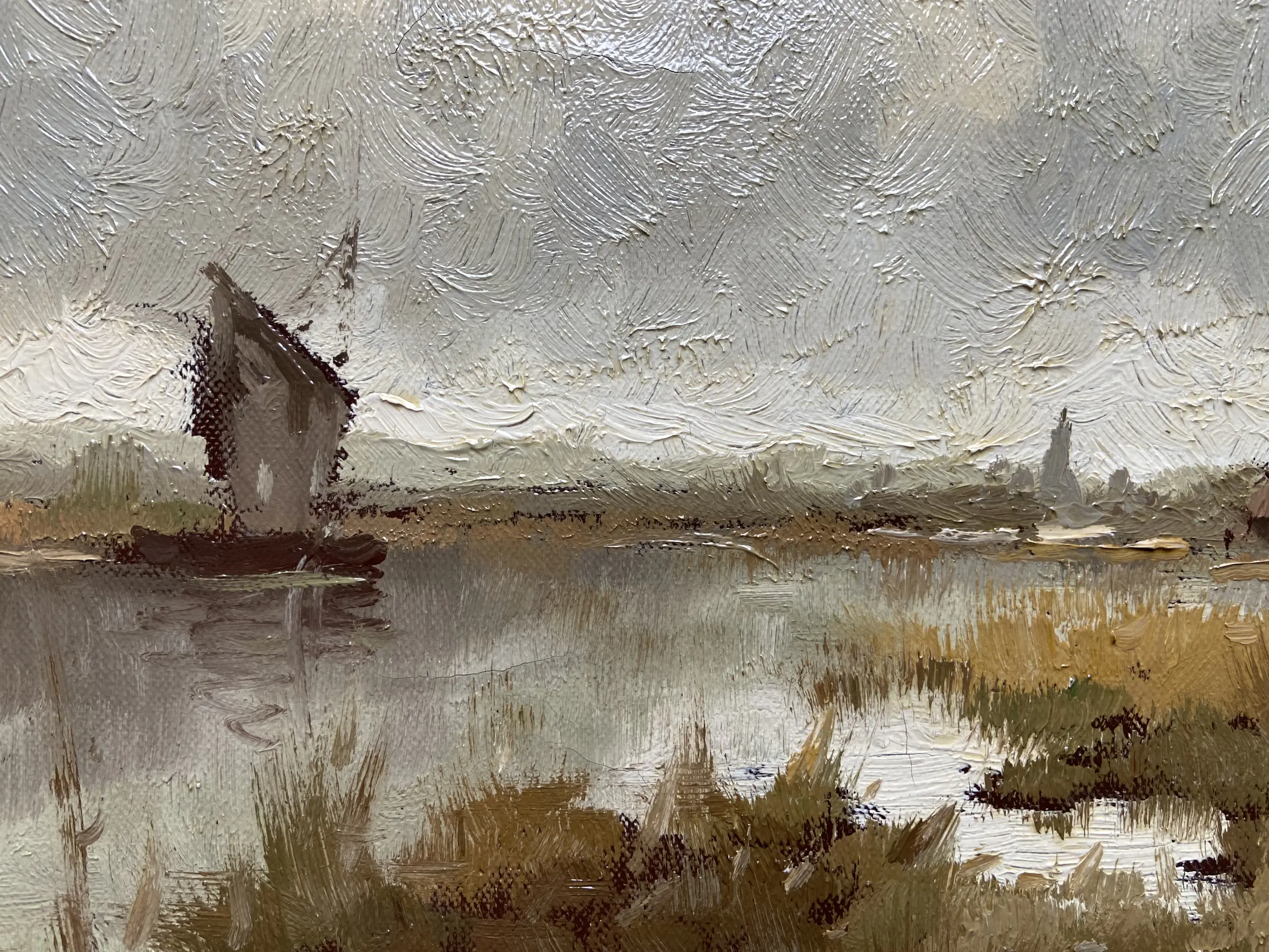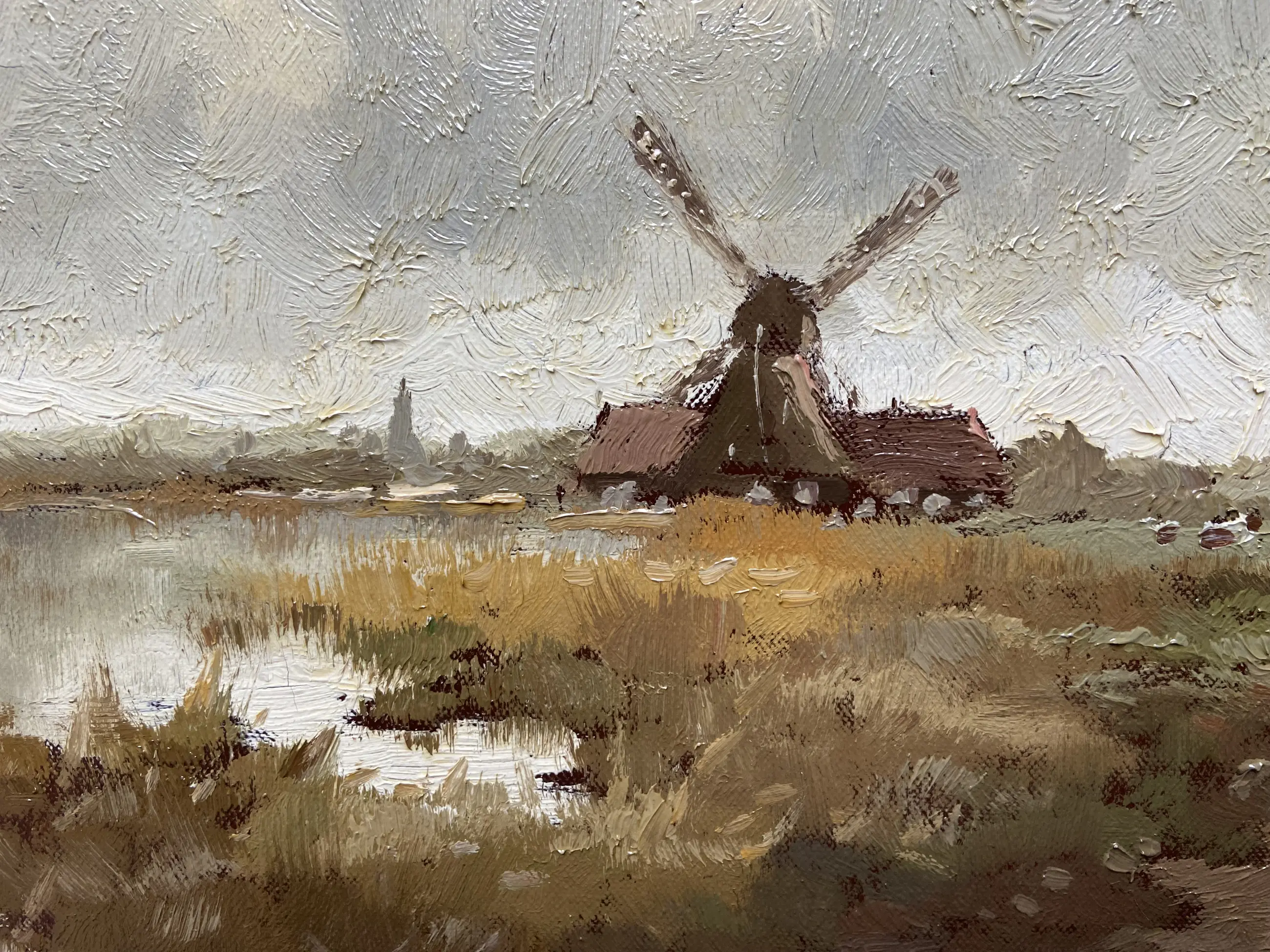 Olieverfschilderij op doek in de stijl en naar een ets van Rembrandt. Warm van kleur. Vlot van toets.