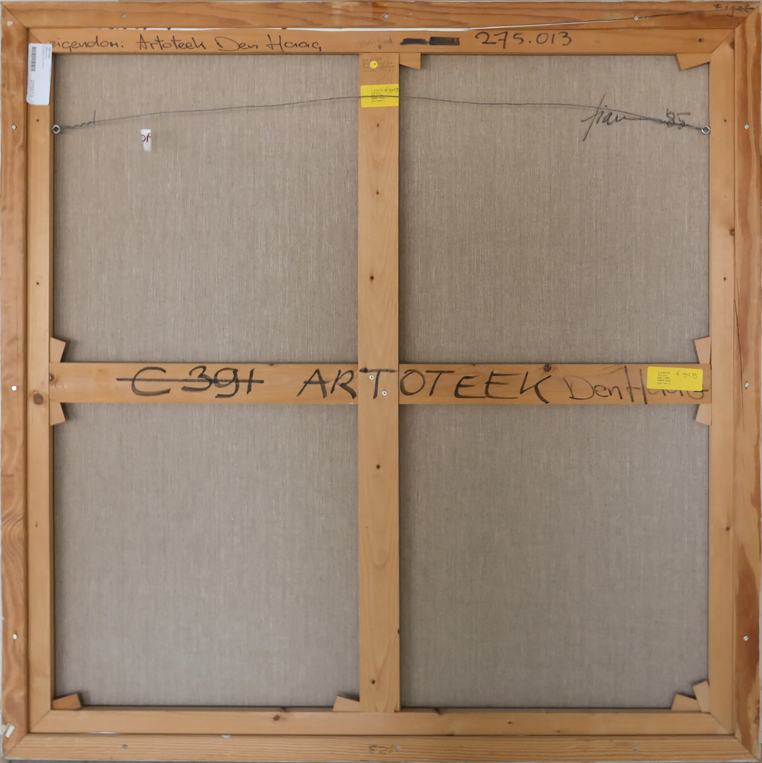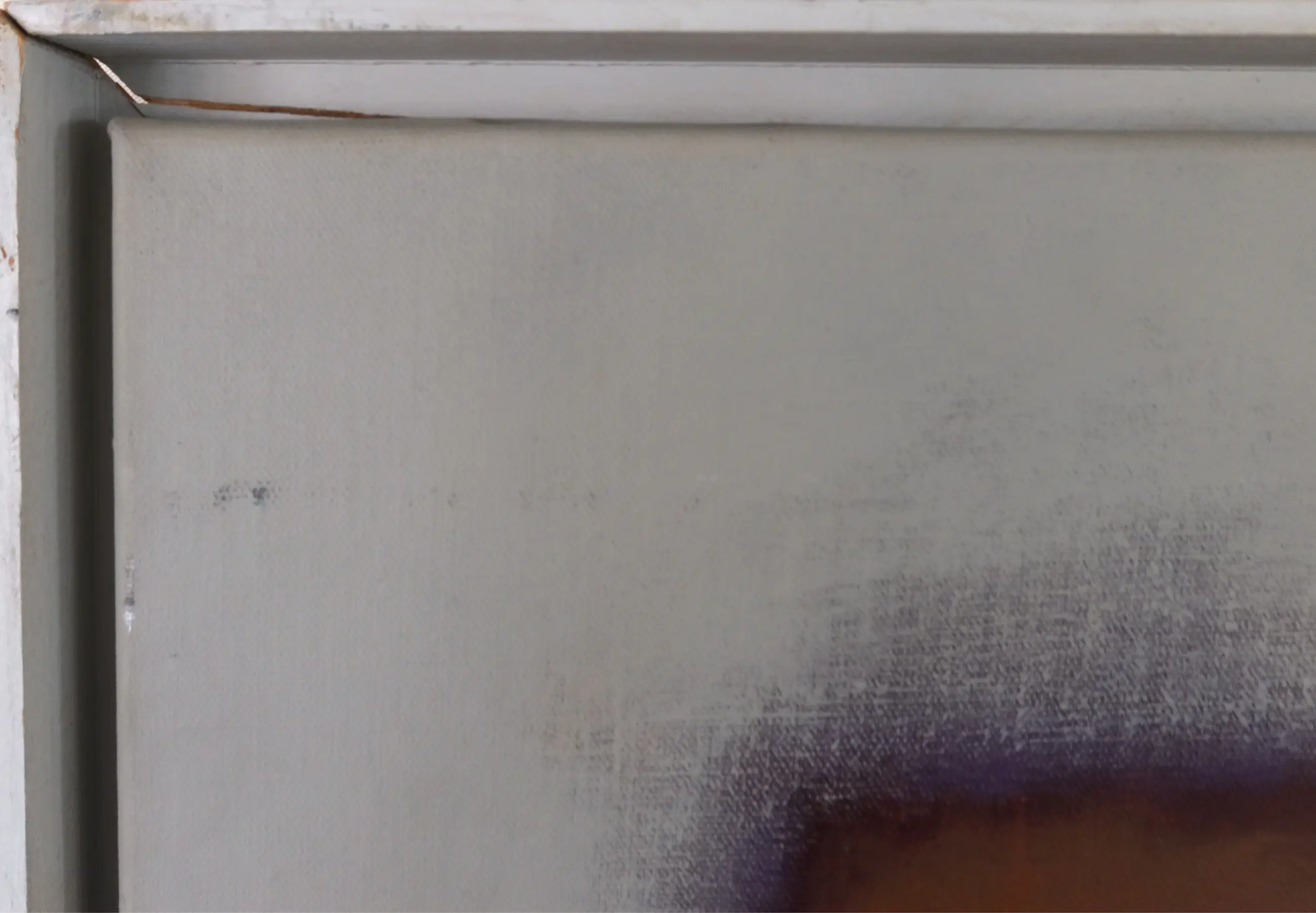 Verfschade, aan de achterzijde is bovenin een breuk in de lijst te zien. | |