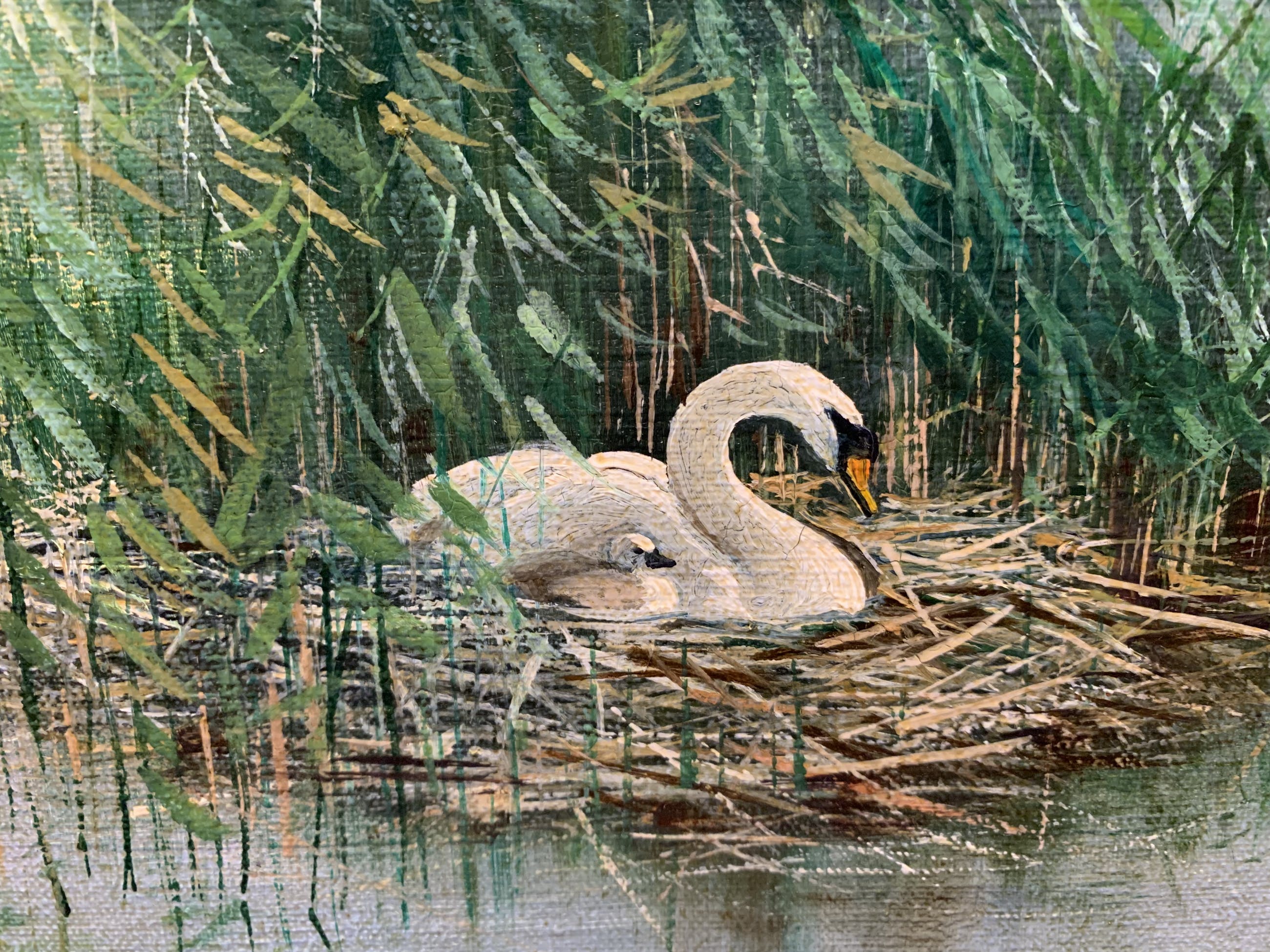 Een werkelijk schitterend olieverf schilderij van de kunstenaar Rob Hessels Het laat een prachtig landschap in het voorjaar zien met een broedend zwanenpaar bij een ondergaande zon. Mooie lucht en wolkenpartijen. Het waardevolle doek is in schone staat en is gesigneerd door de kunstenaar. Tevens is er de rekening uit 1988, en dus bewijs van echtheid bijgeleverd ,en gesigneerd door Rob Hessels zelf.
