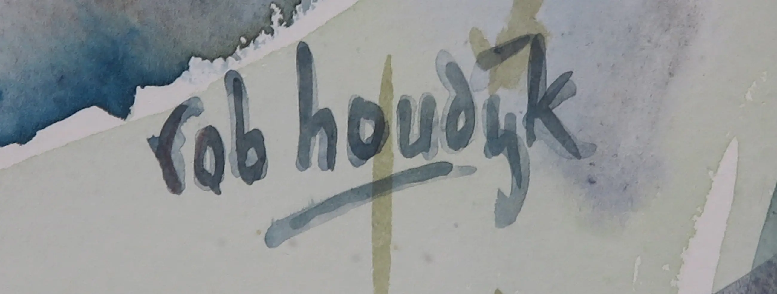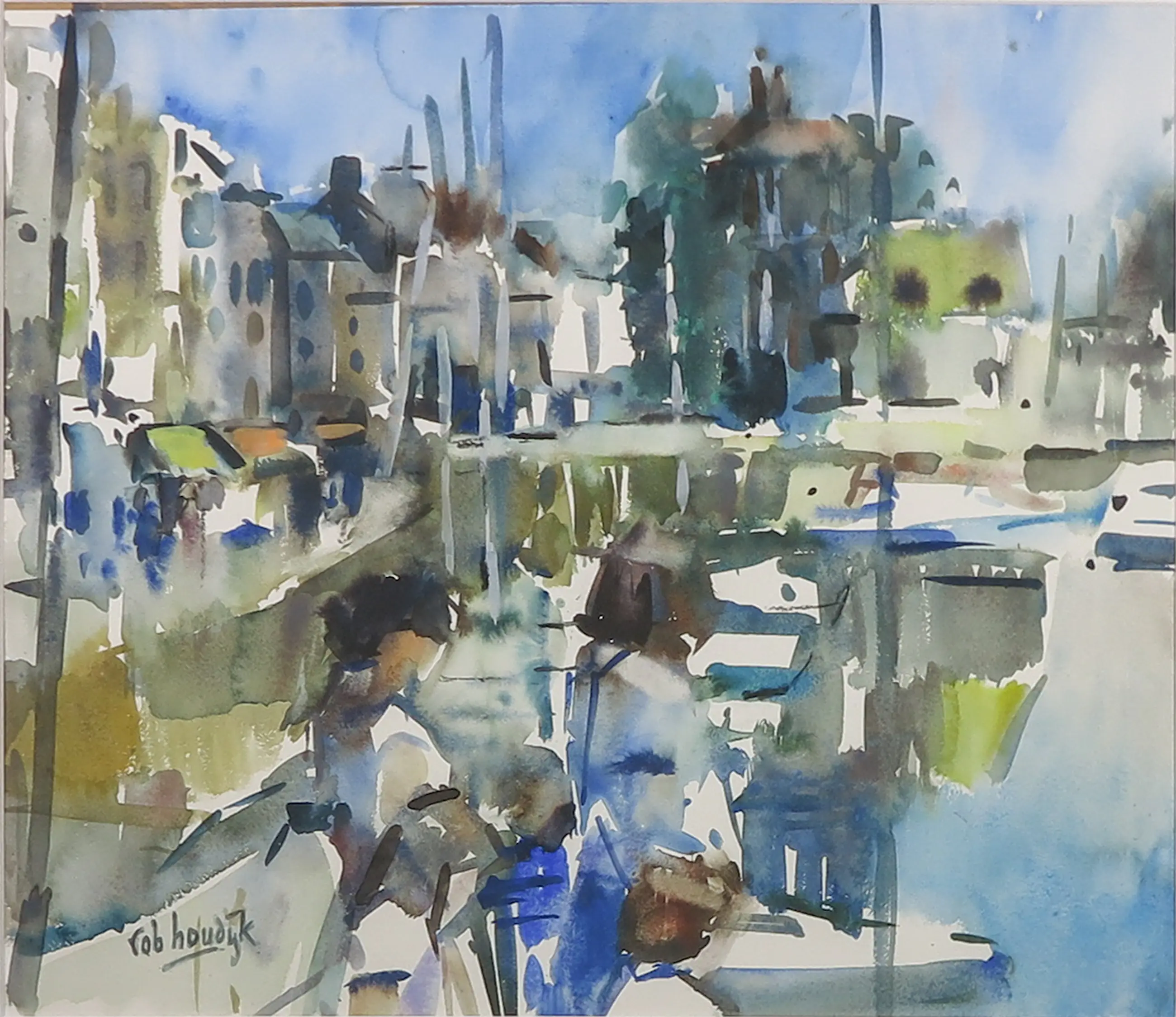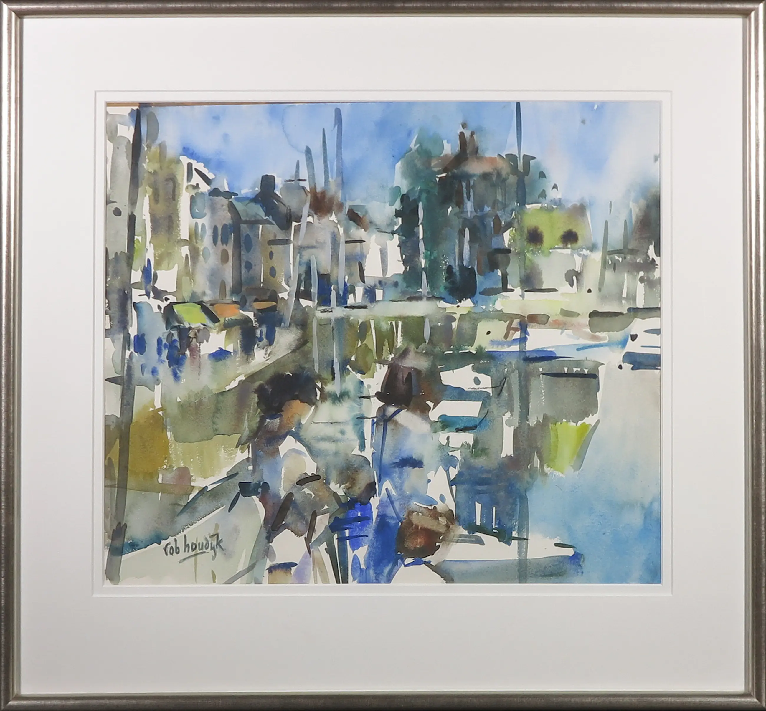 Rob Houdijk is een Nederlands kunstenaar gevestigd in Alkmaar. Voor zijn kunst gebruikt Houdijk meerdere media, waaronder aquarel zoals dit werk. Dit werk laat een haventje zien bij een stad, en heeft zoals Houdijk werken vaker hebben; een lichte abstractie. Het werk heeft een rustige uitstraling en een zomerse kwaliteit. Het werk is handgesigneerd door de kunstenaar.