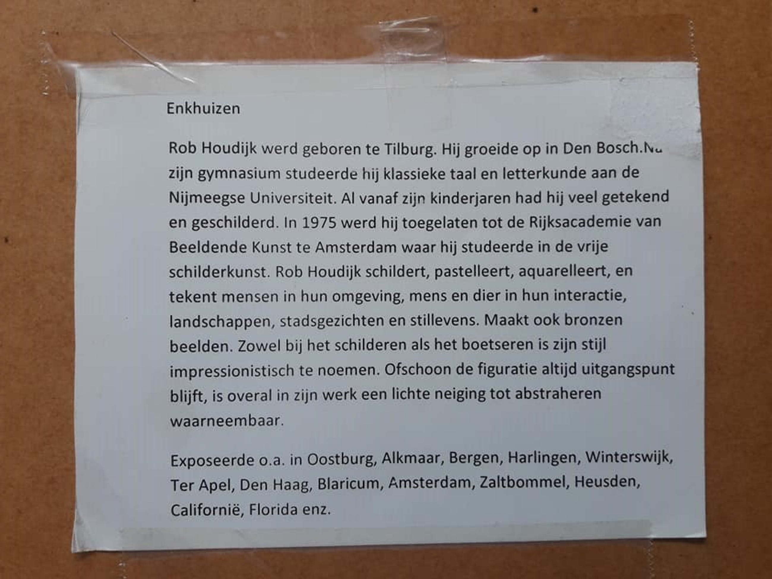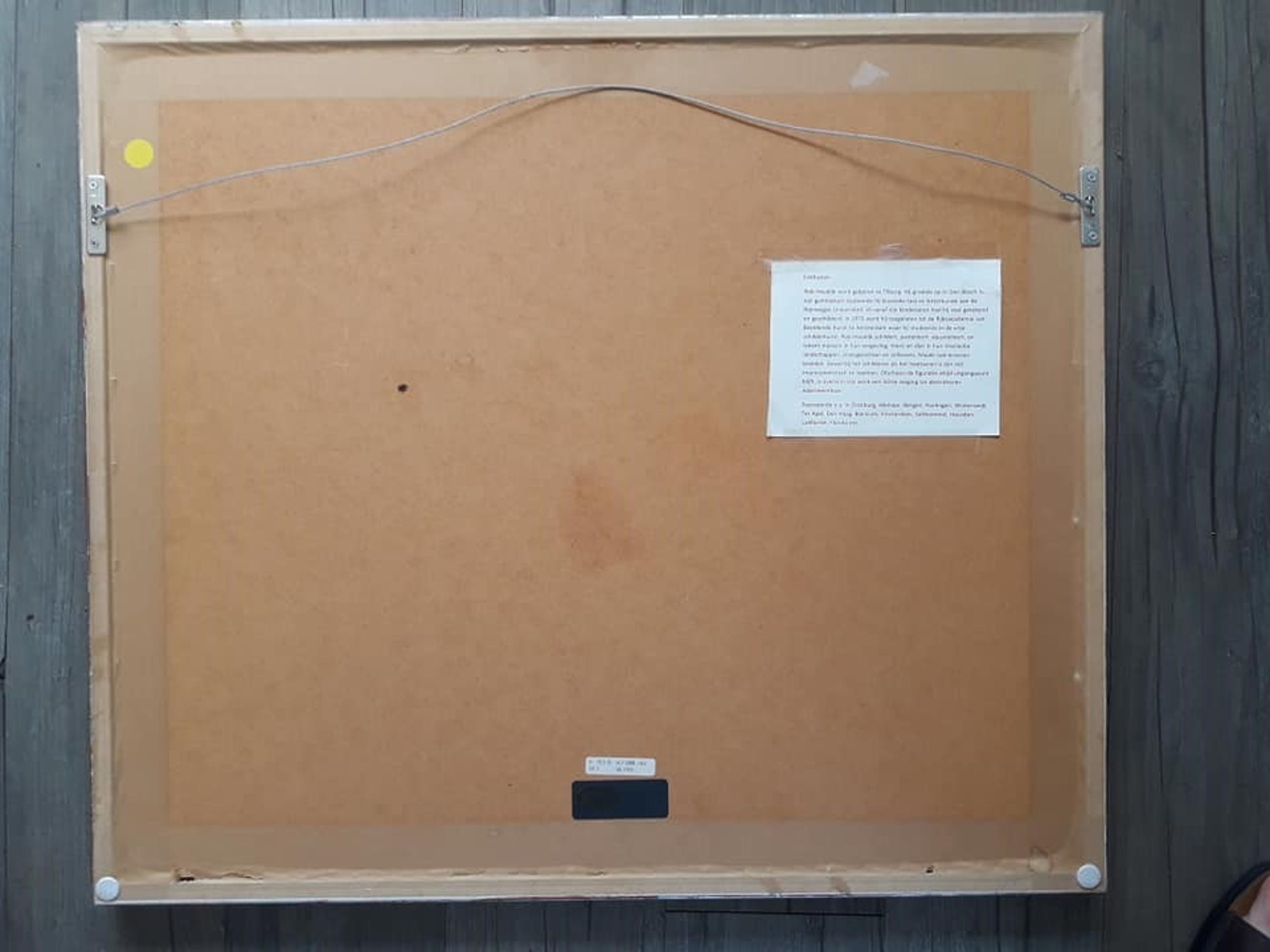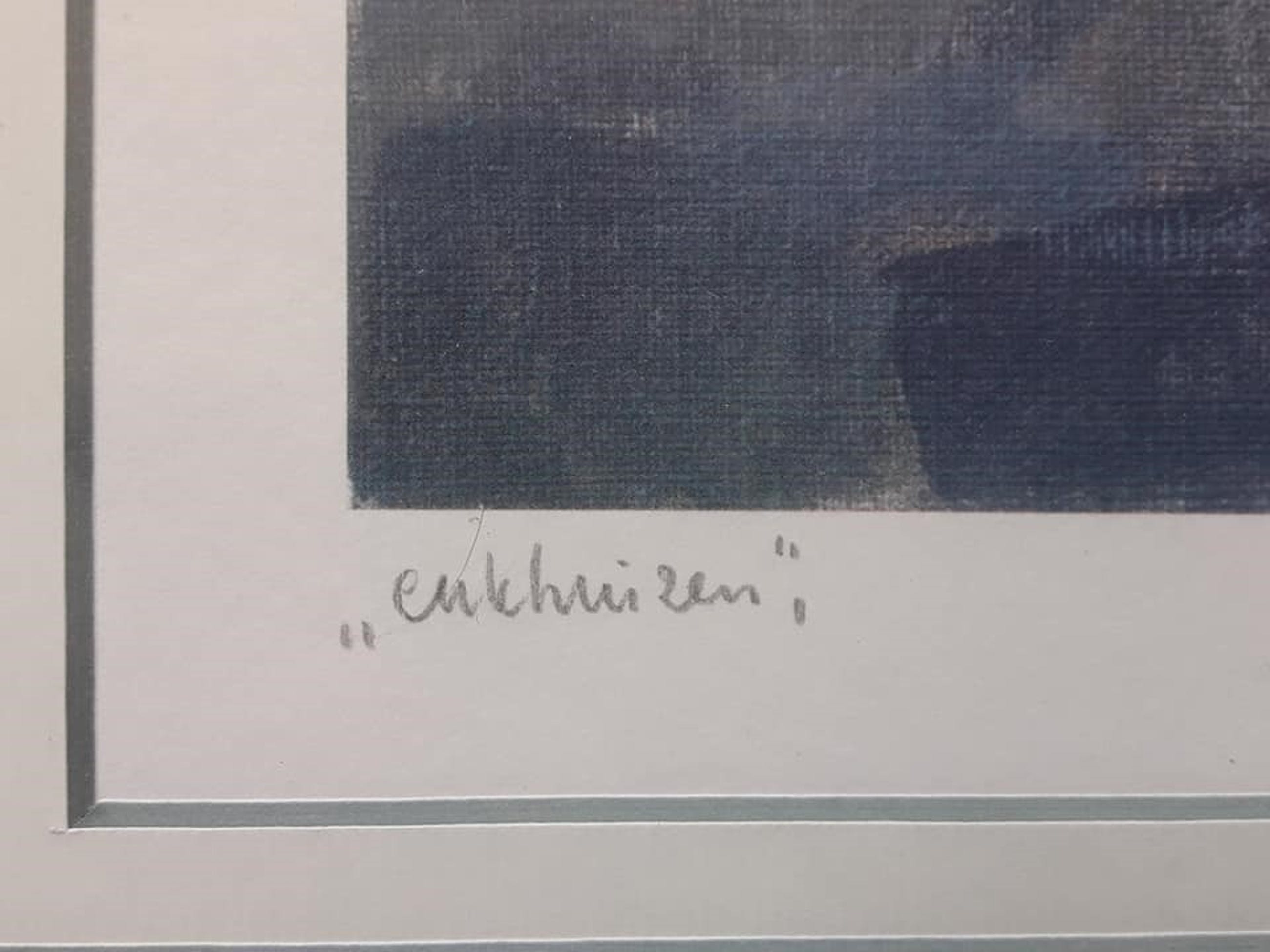 Offset litho van een stadsgezicht van Enkhuizen met op de achtergrond de bekende dromedaris. Door het nogal grote formaat stuur ik dit liever niet op. Het kan wel maar glasbreuk blijft risico koper. Het zal worden verpakt in een op maat gemaakte houten kist om beschadiging te voorkomen.
