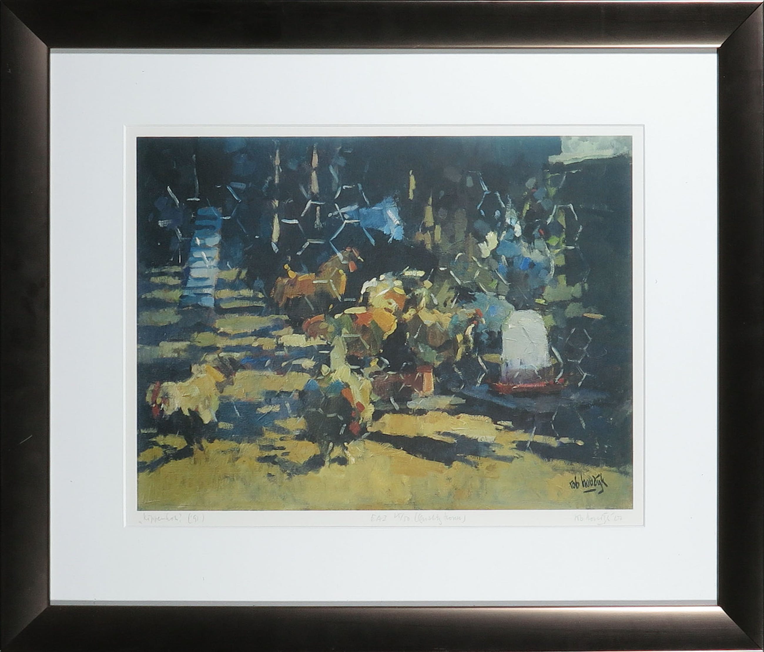 Passe-partout/lijsten: Beschadigingen aan lijsten worden niet beschreven. Indien een werk achter glas is ingelijst en het glas kapot is, zal dit wel vermeld worden. Passe-partouts worden op geen enkele manier gegarandeerd en ook niet altijd meegezonden. Alleen als een werk niet uit het passe-partout te halen is, zal dit vermeld worden.