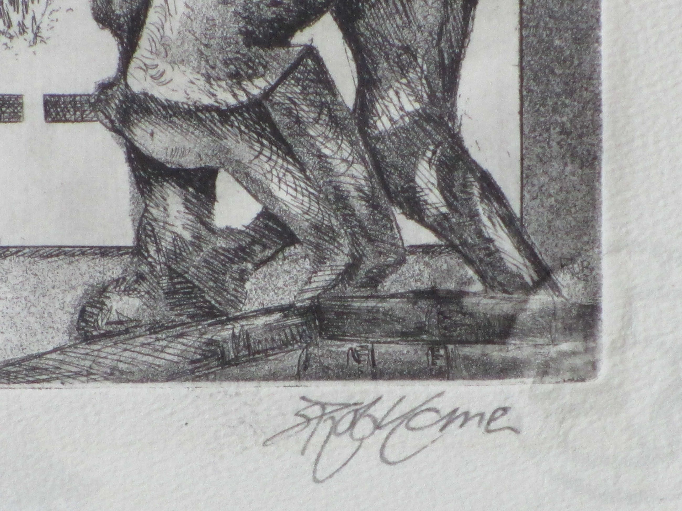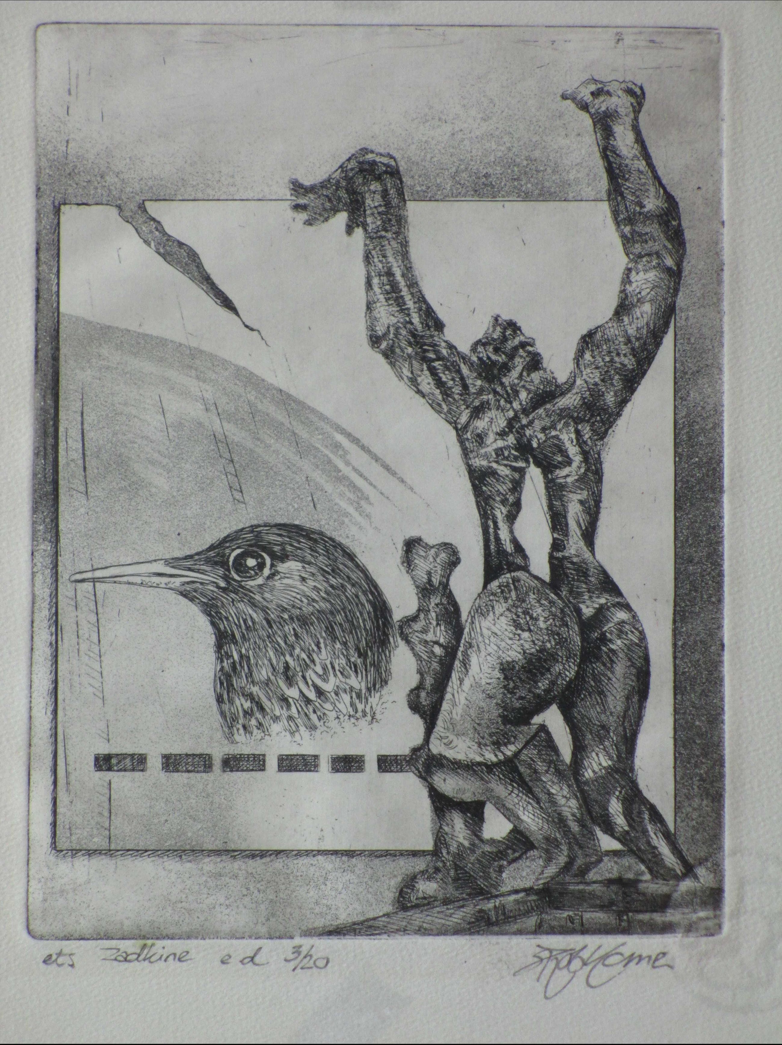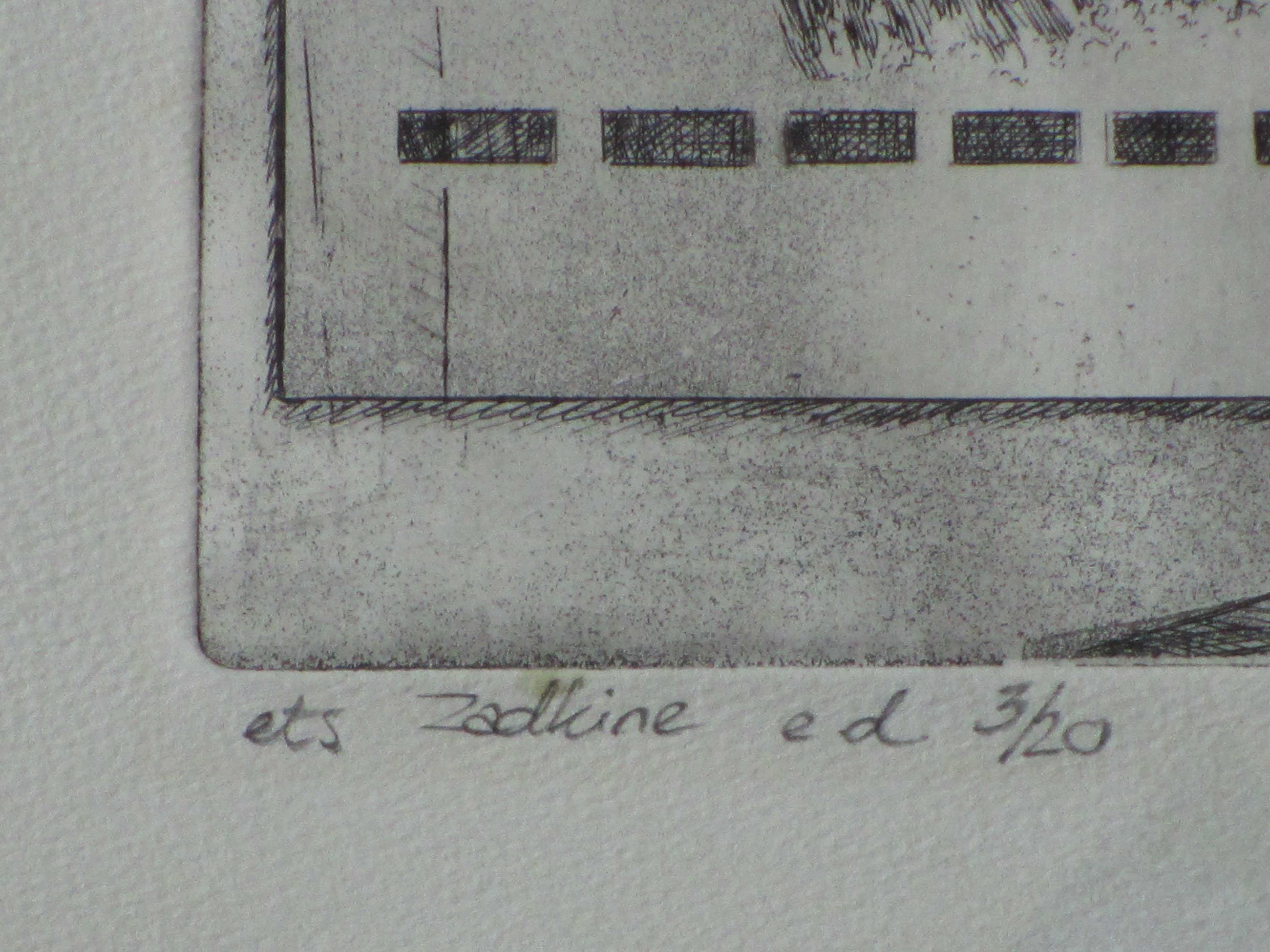 Ets door Rob Komen. Voorstelling van 'De Verwoeste Stad' van Zadkine. Losbladig, beeldmaat 17x13, bladmaat 21x17 Gesigneerd in potlood rechtsonder Getiteld 'Zadkine' en annotatie 'ed' en nummering '3/20' linksonder