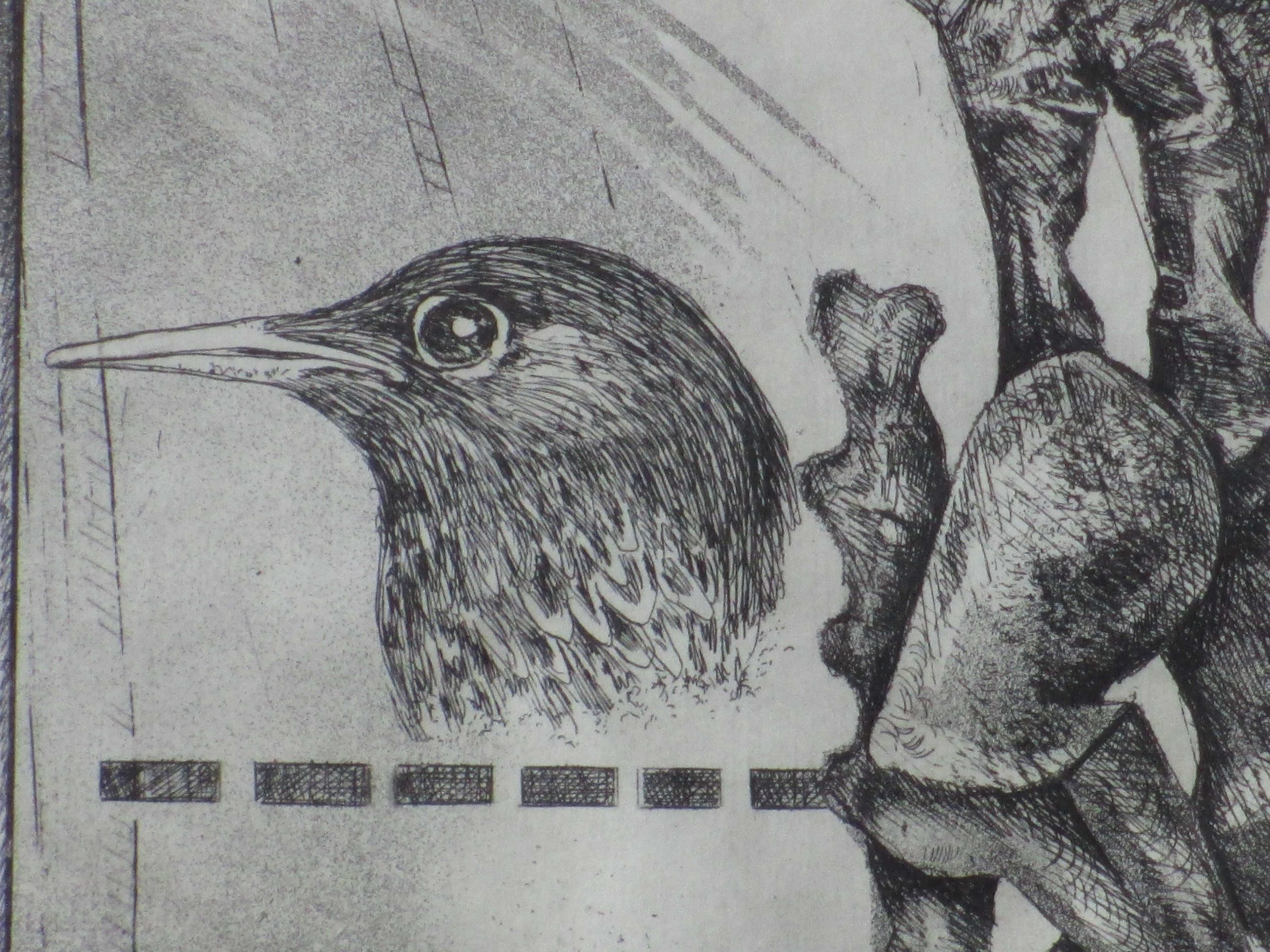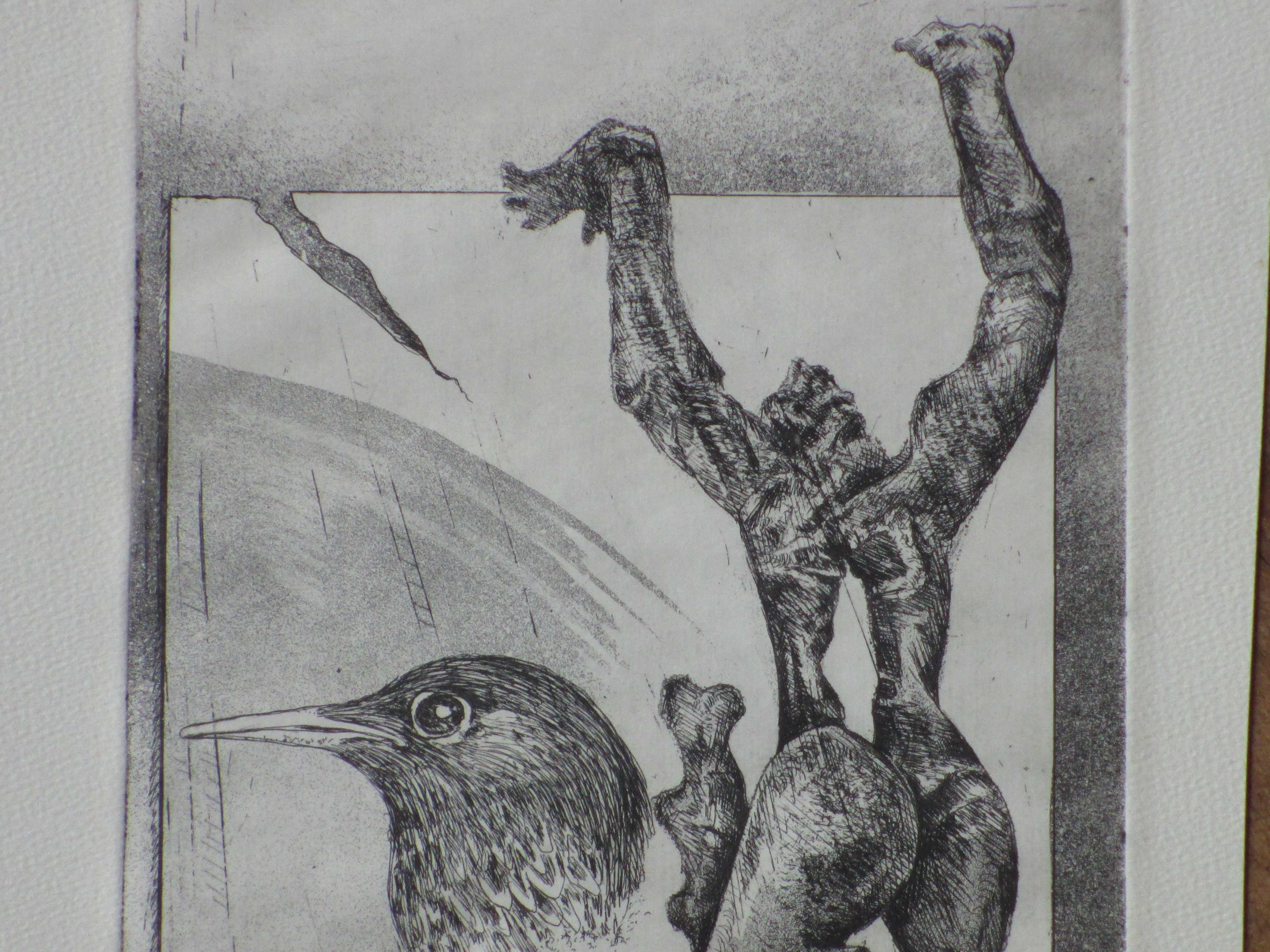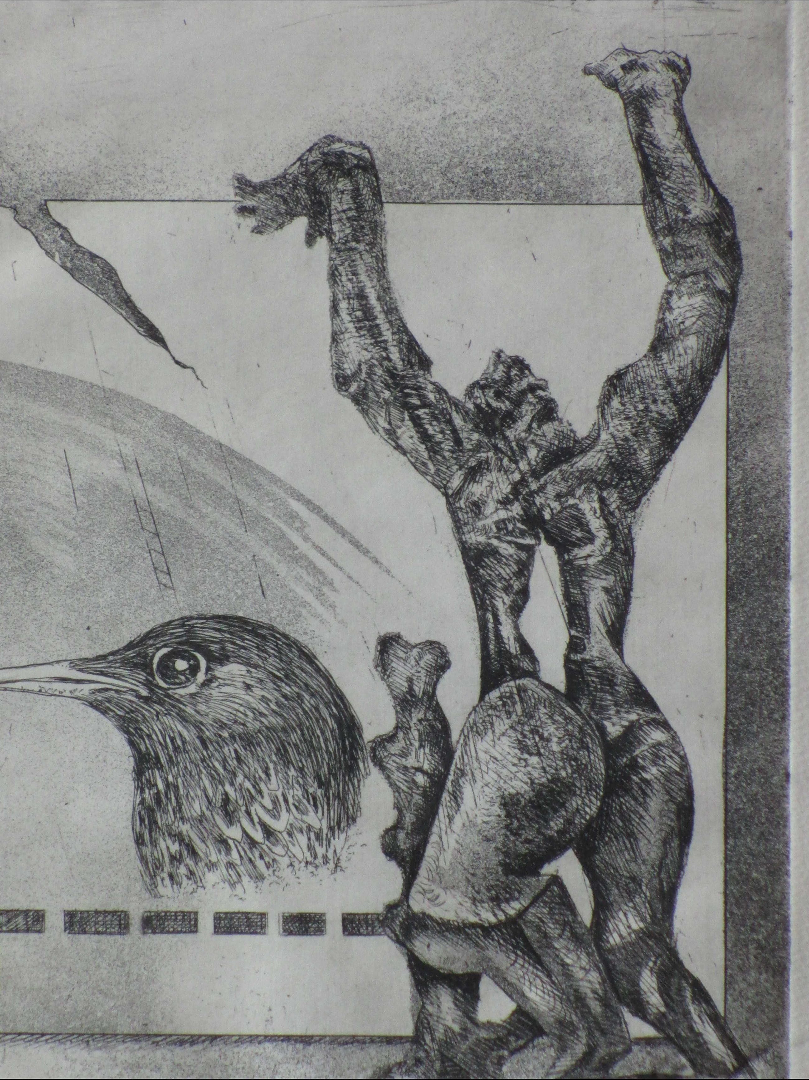 Ets door Rob Komen. Voorstelling van 'De Verwoeste Stad' van Zadkine. Losbladig, beeldmaat 17x13, bladmaat 21x17 Gesigneerd in potlood rechtsonder Getiteld 'Zadkine' en annotatie 'ed' en nummering '3/20' linksonder