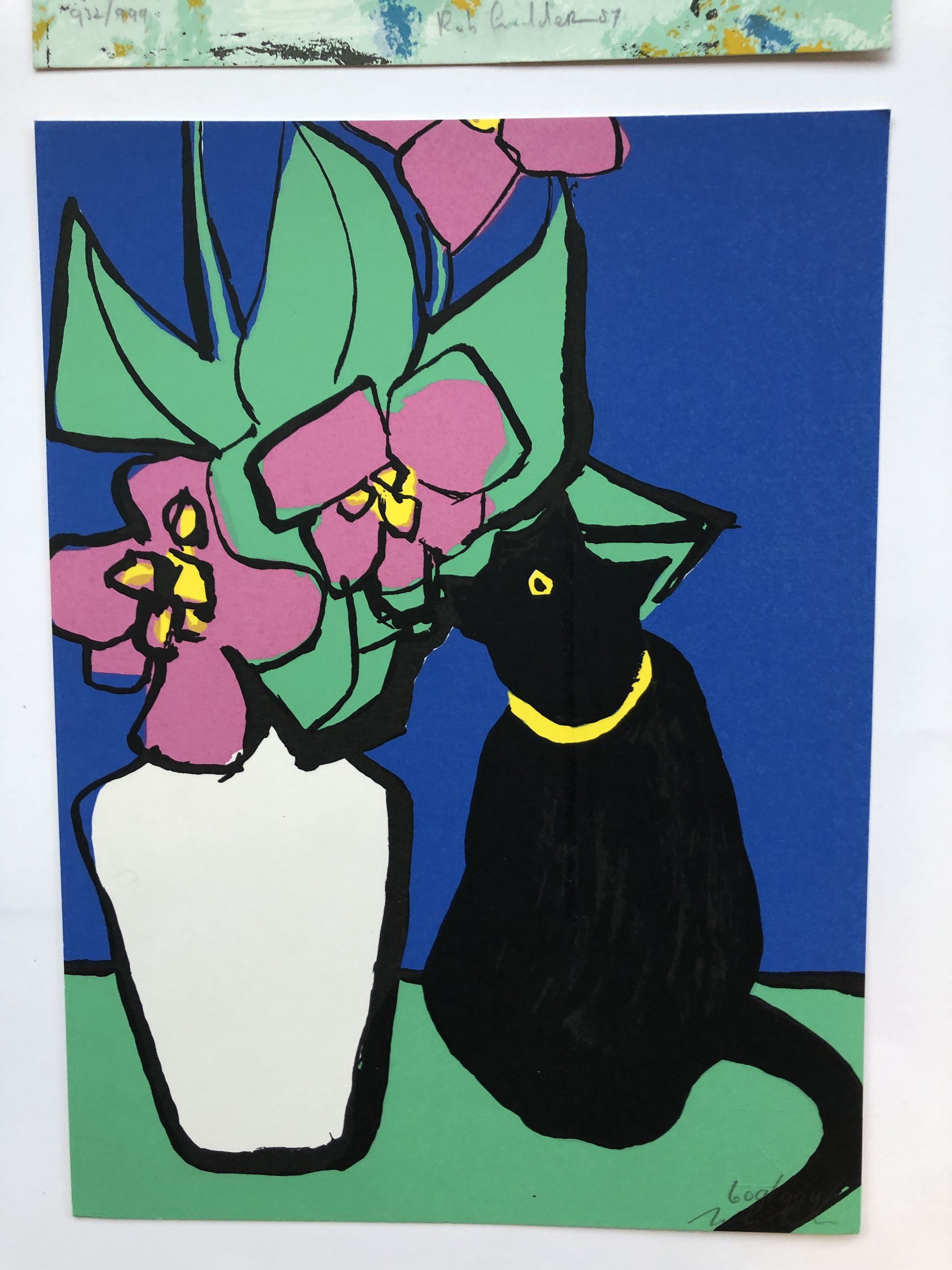 Twee werkjes. Eén van Rob Lodder en een kat met een vaas bloemen waarvan de signatuur voor mij niet leesbaar. Komt uit een serie van zeefdrukjes allemaal gesineerd en genummerd. U kunt het werk vooraf komen beoordelen in de schatkamer van galerie Rotor in Gorinchem.