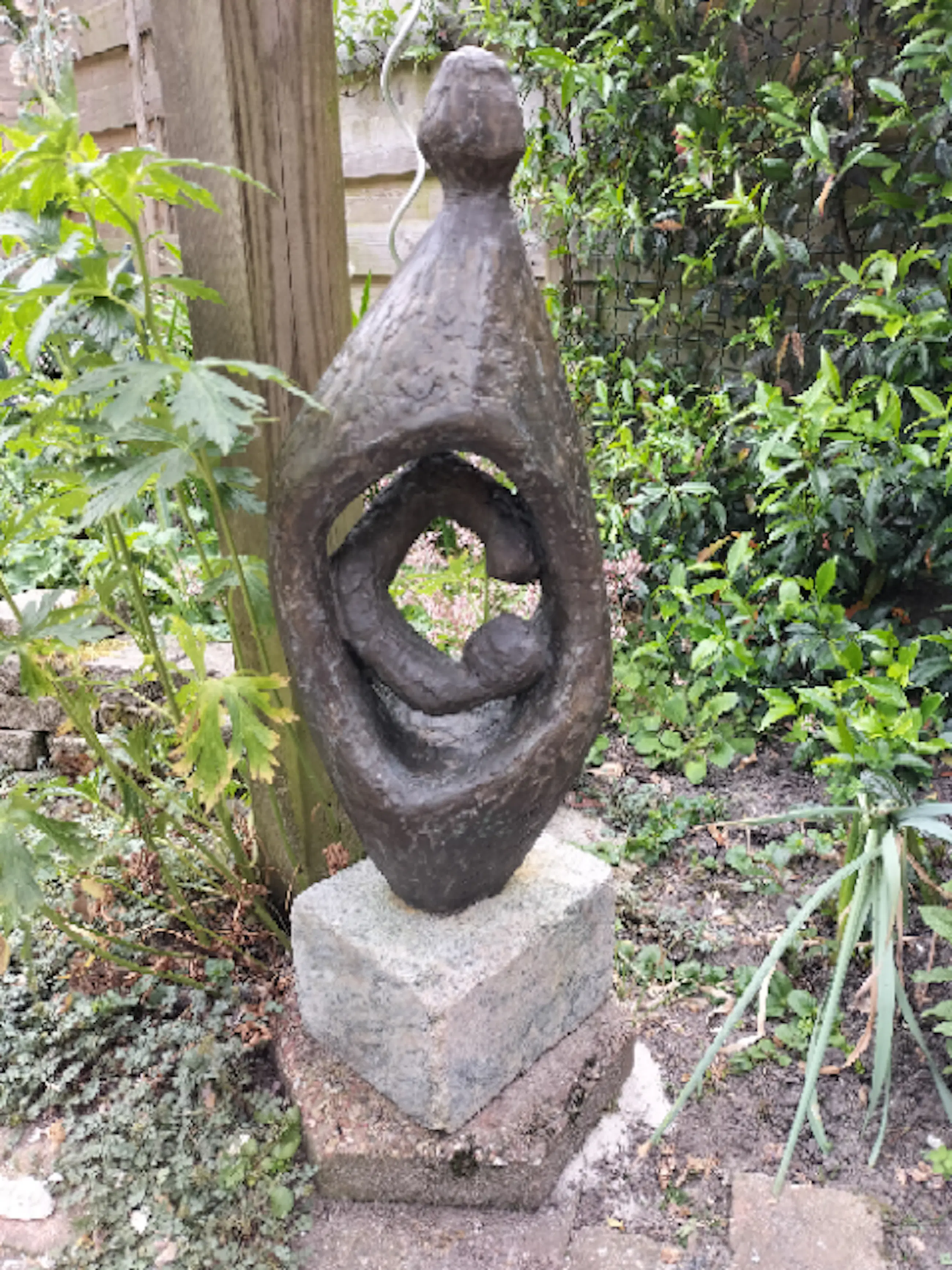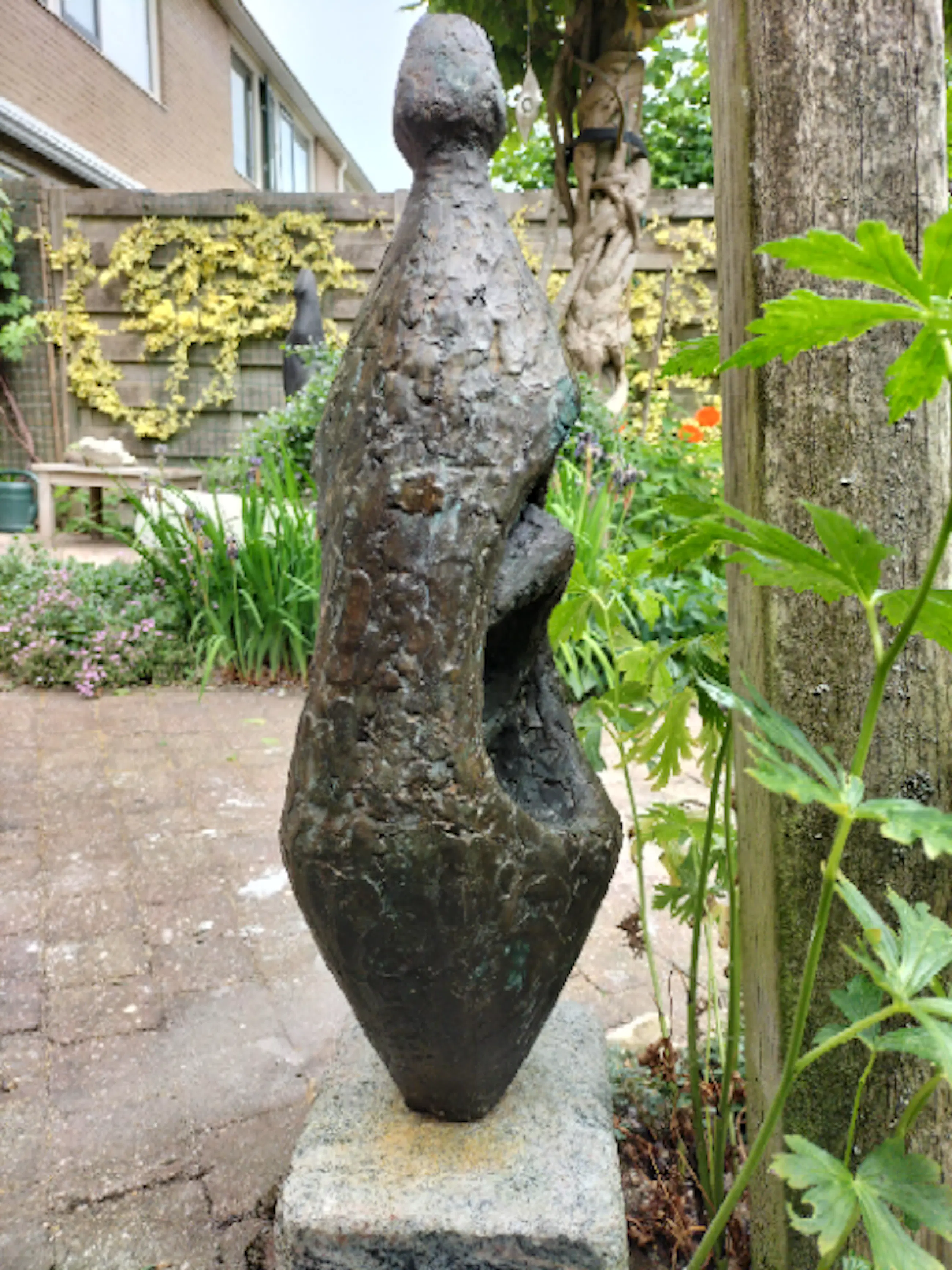 Bronzen beeld, een vroeg werk van Rob Maingay. Beeld staat los op een ruwe granieten sokkel waar een dook in zit bevestigd Beeld kan eventueel zonder sokkel. Gewicht: beeld 13 kg, sokkel 10 kg - afmeting beeld: 68x22x19 - afmeting sokkel: 20x12x7