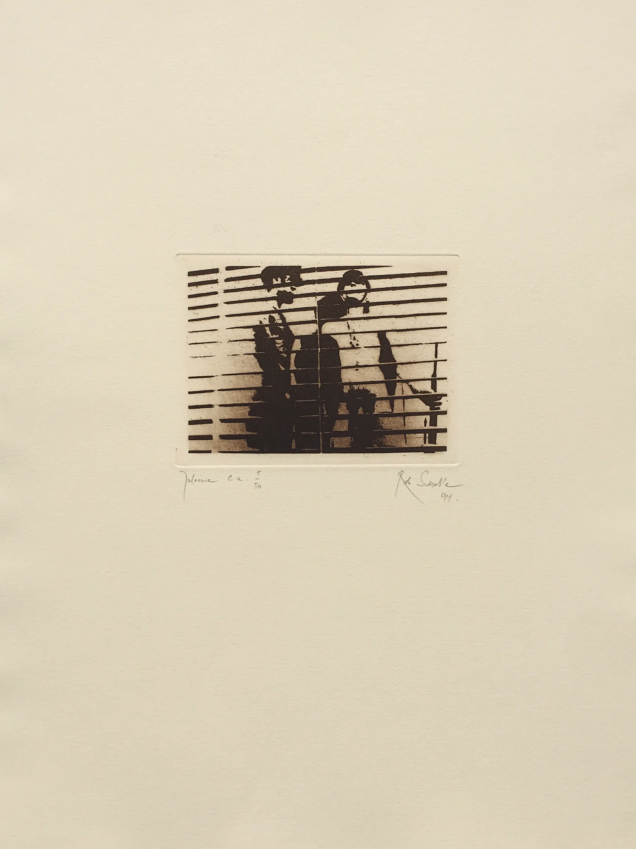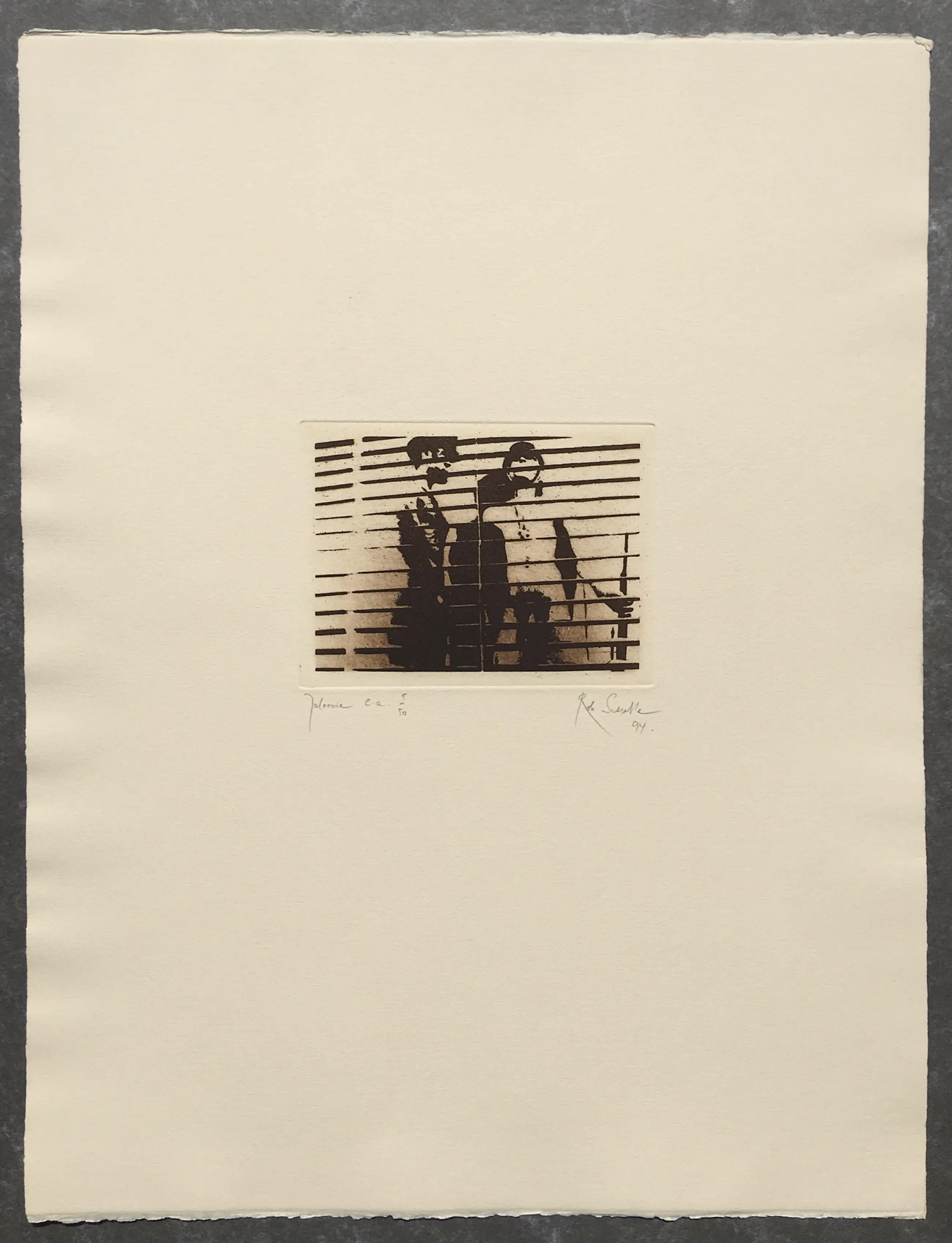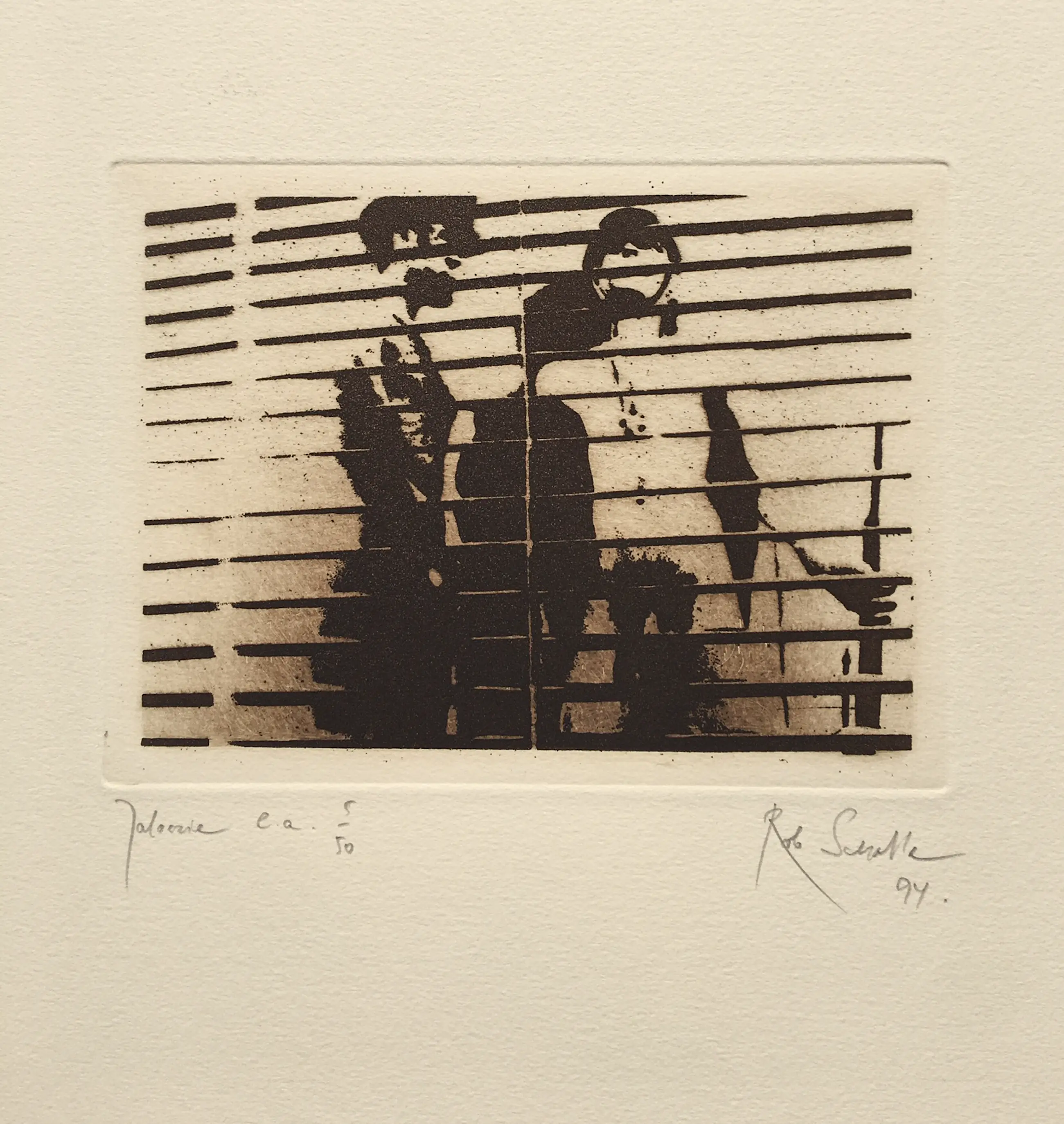 De bekende ets van Rob Scholte ‘Jaloezie’ uit 1994. Het werk is gesigneerd en genummerd, oplage EA 5/50. De papierkleur is als origineel uitgegeven afkomstig uit de map ‘AMC Grafiek’, een uitgave ter gelegenheid van het 325-jarige jubileum van academische geneeskunde in Amsterdam met litho’s van verschillende kunstenaars. De litho’s werden gedrukt door P. Clement in Amsterdam.