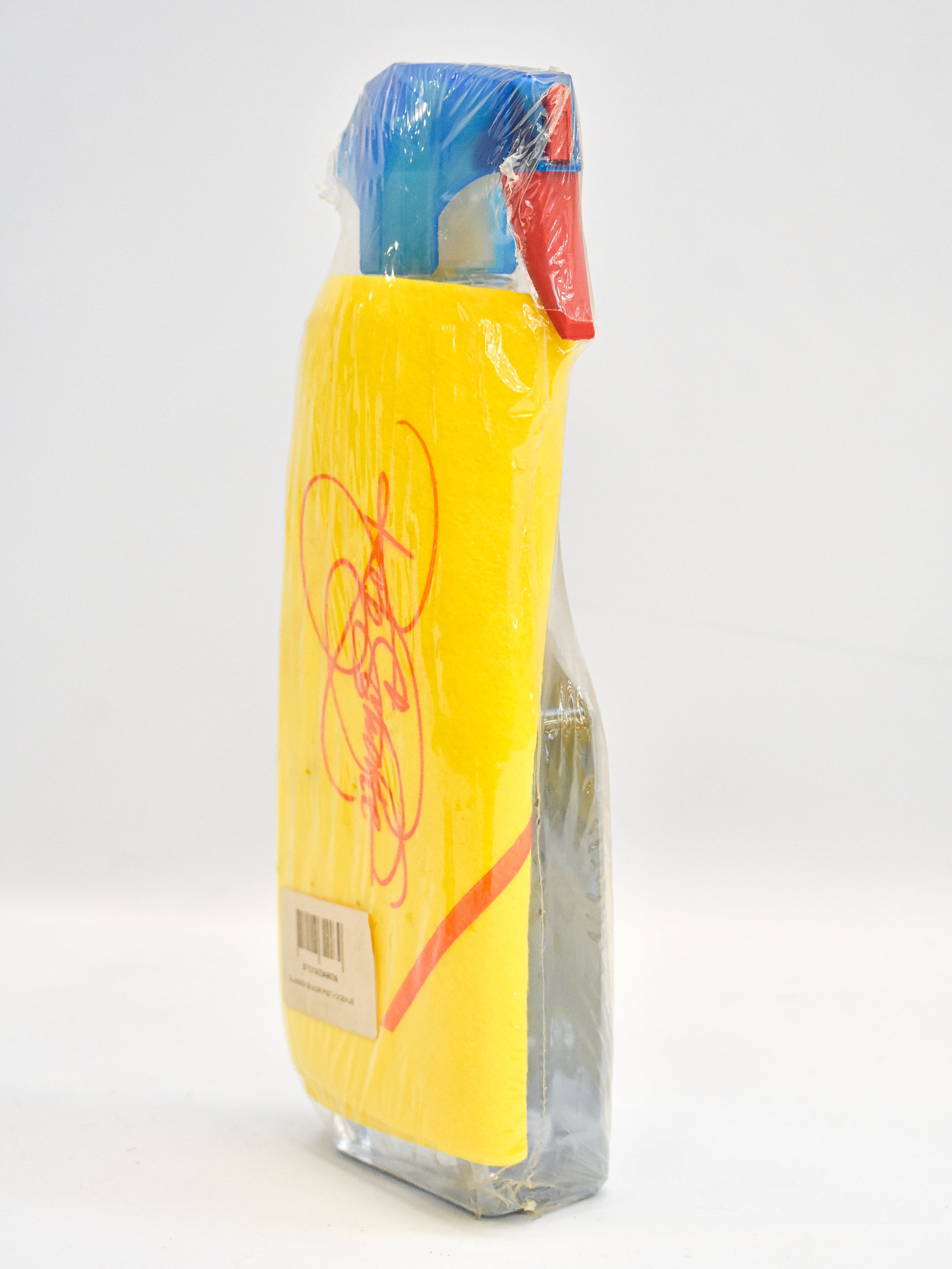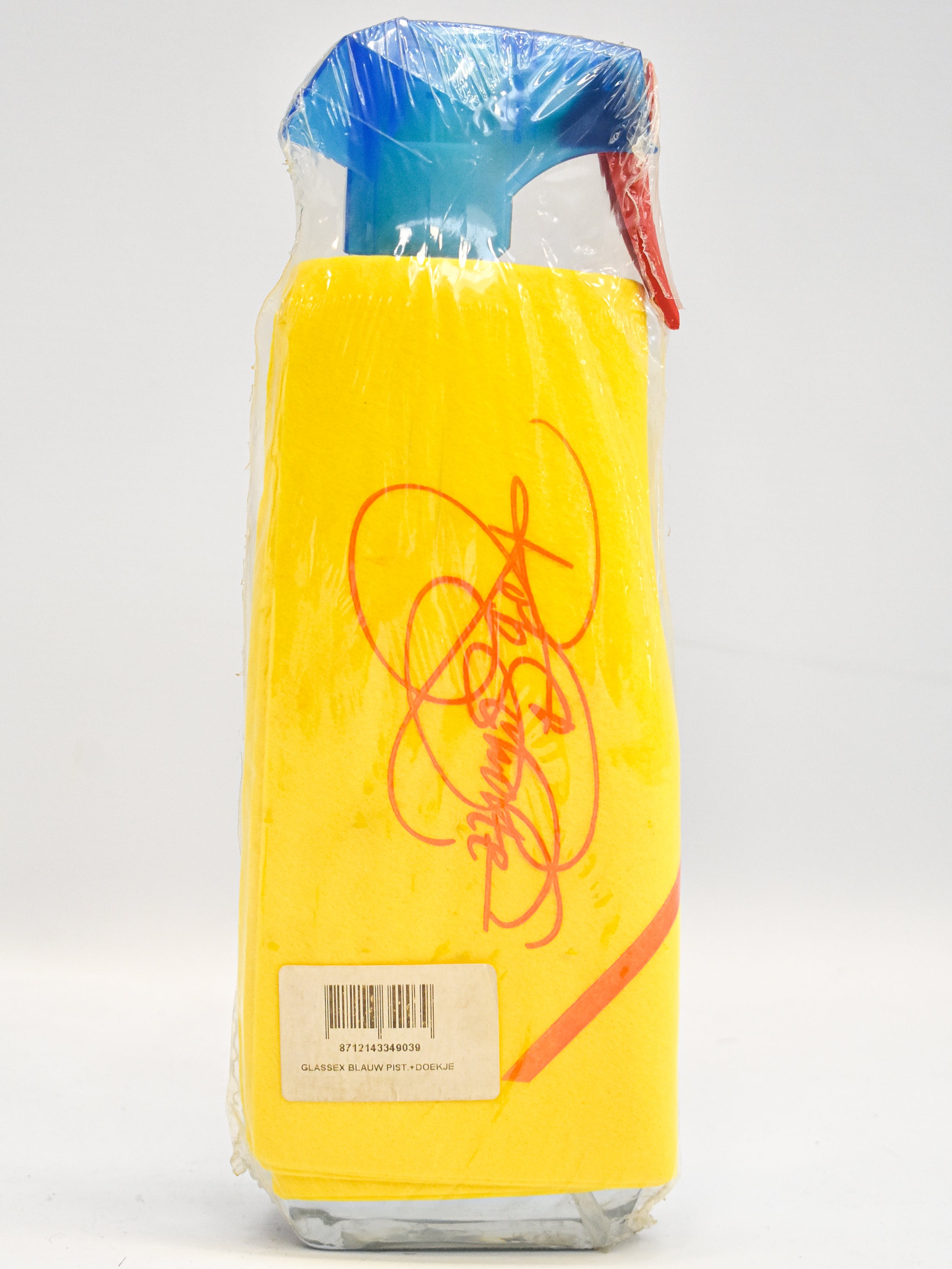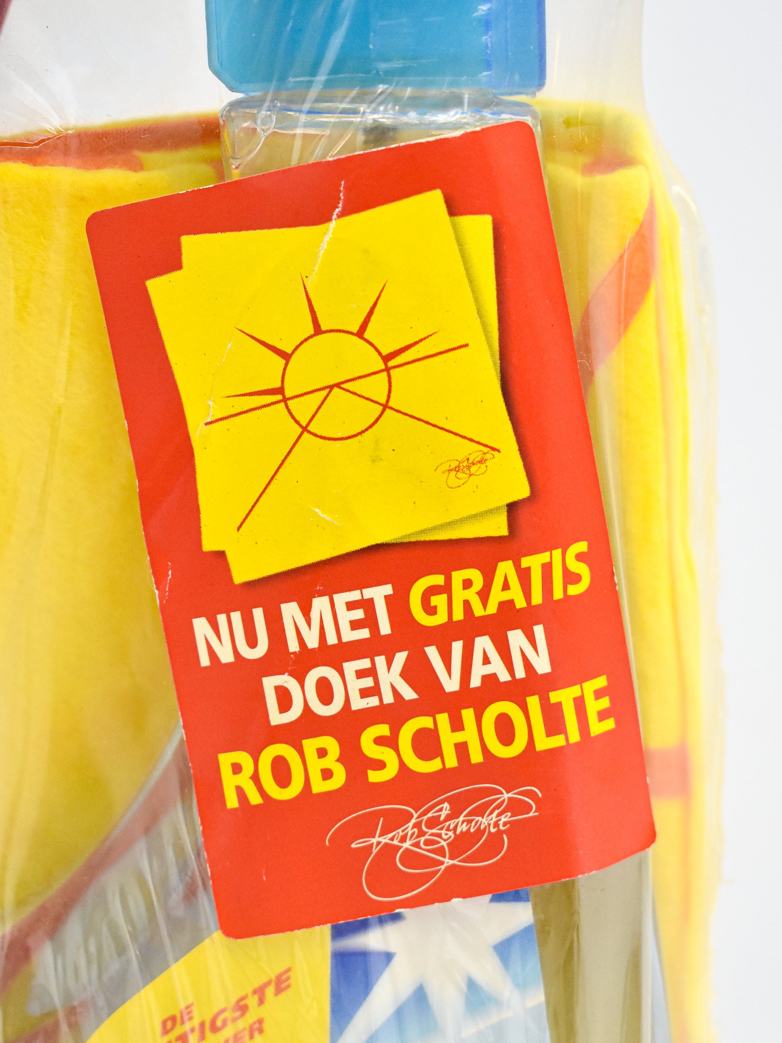 Het doekje is voorzien van een afbeelding van een opkomende zon en signatuur Rob Scholte, signatuur is in het doekje mee gedrukt. Fles en doekje zitten nog in de originele verpakking.
