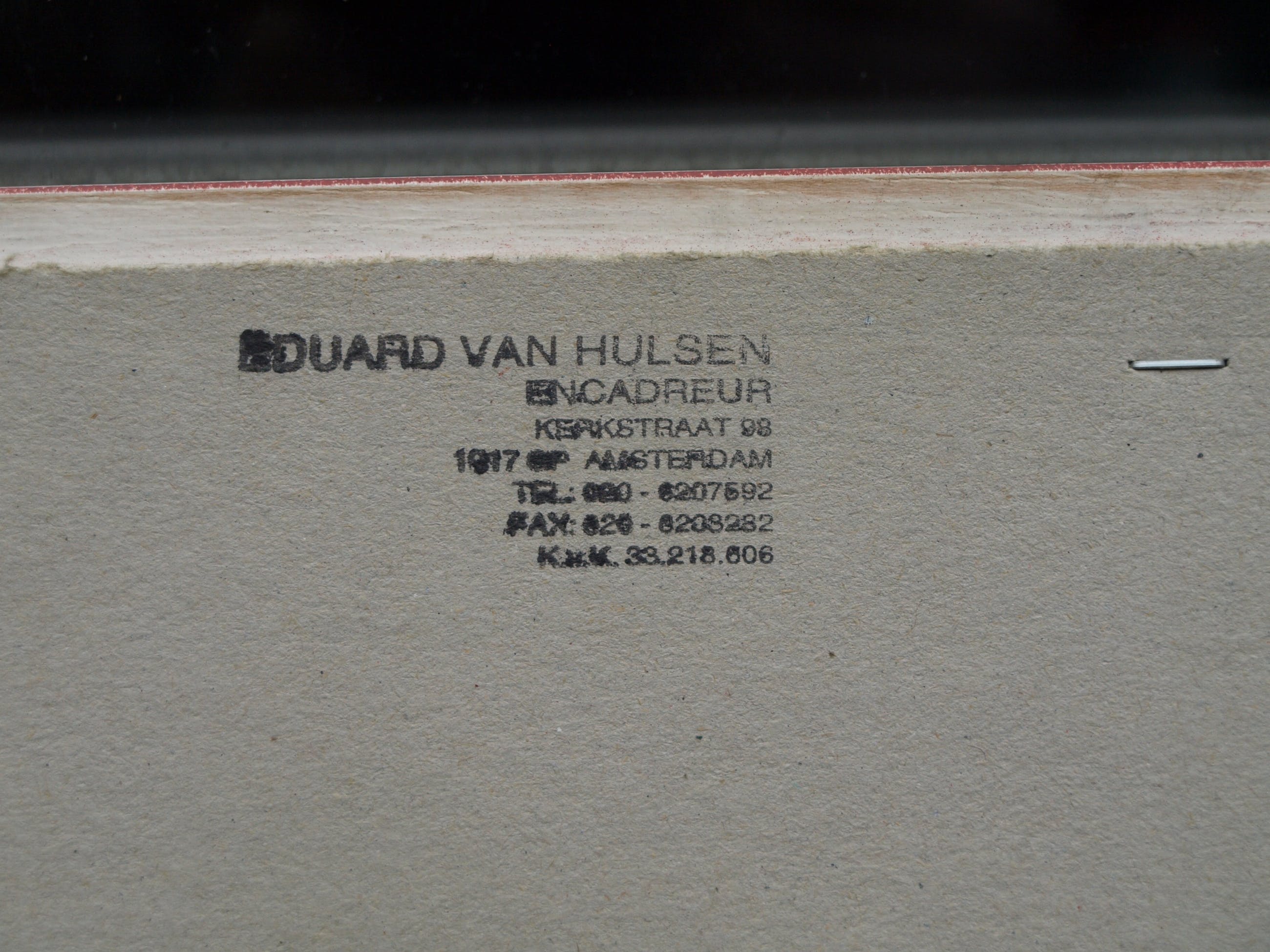 Afhandeling: Let op A.U.B. -Het ingelijste werk kan opgehaald worden in Amsterdam. Ophalen heeft onze zeer sterke voorkeur. Vanwege het formaat en de kwetsbaarheid van de glasplaat kan het werk niet per post verzonden worden. Het afhalen heeft voor ons geen haast, dus het kan wanneer het u schikt om naar Amsterdam te komen. -U kunt in Nederland en België eventueel gebruikmaken van de gespecialiseerde koeriersdienst van Kunstveiling: “Swift koeriers”. (zie ook de info onderaan deze pagina onder het kopje “Koeriersdienst”). Binnen Nederland zijn de bezorgkosten van Swift Koeriers voor dit werk: € 45,50.