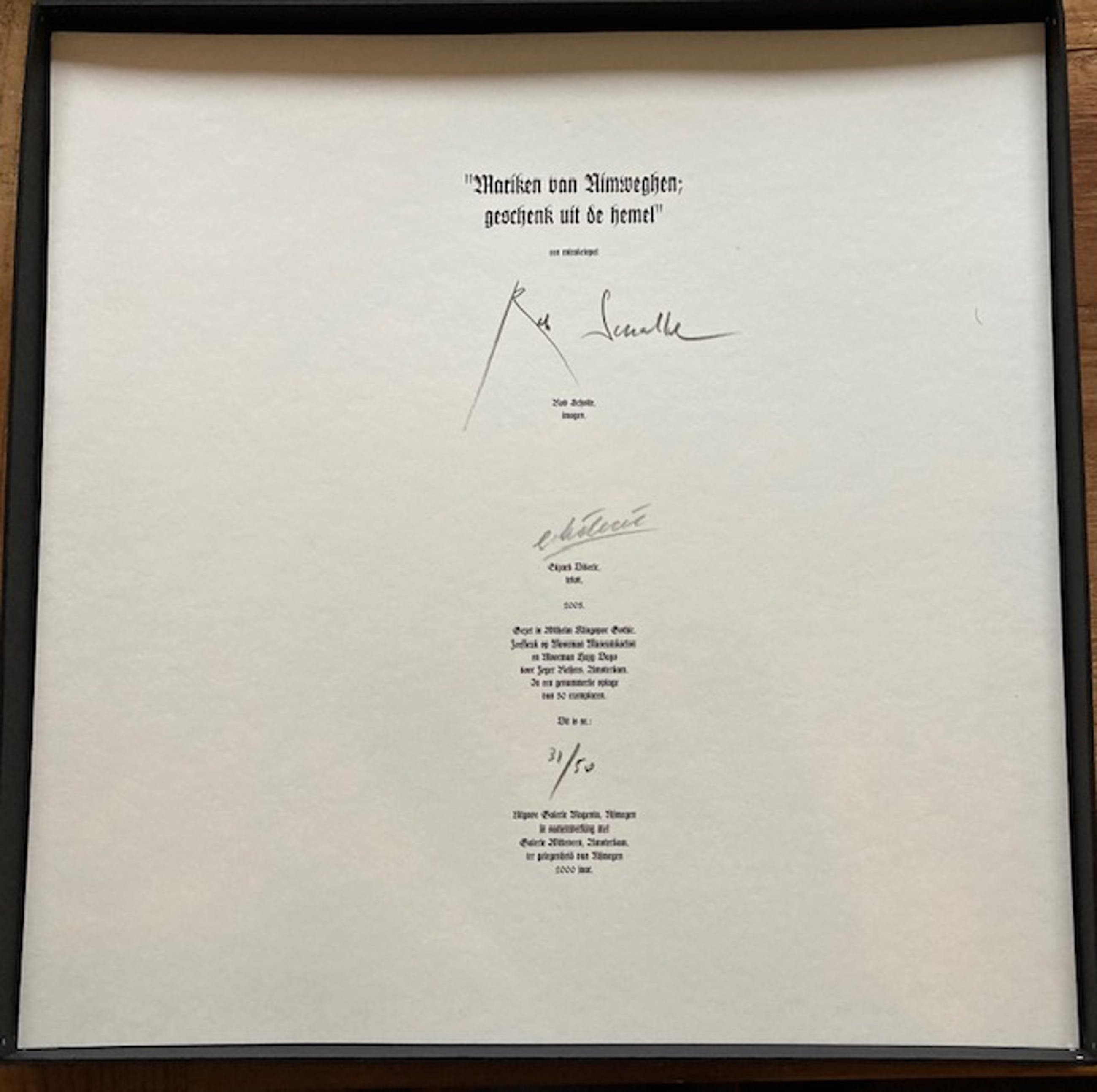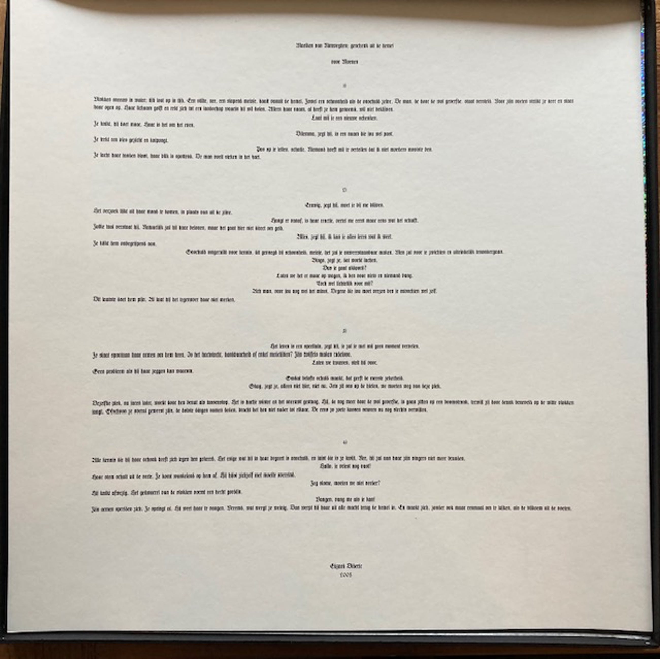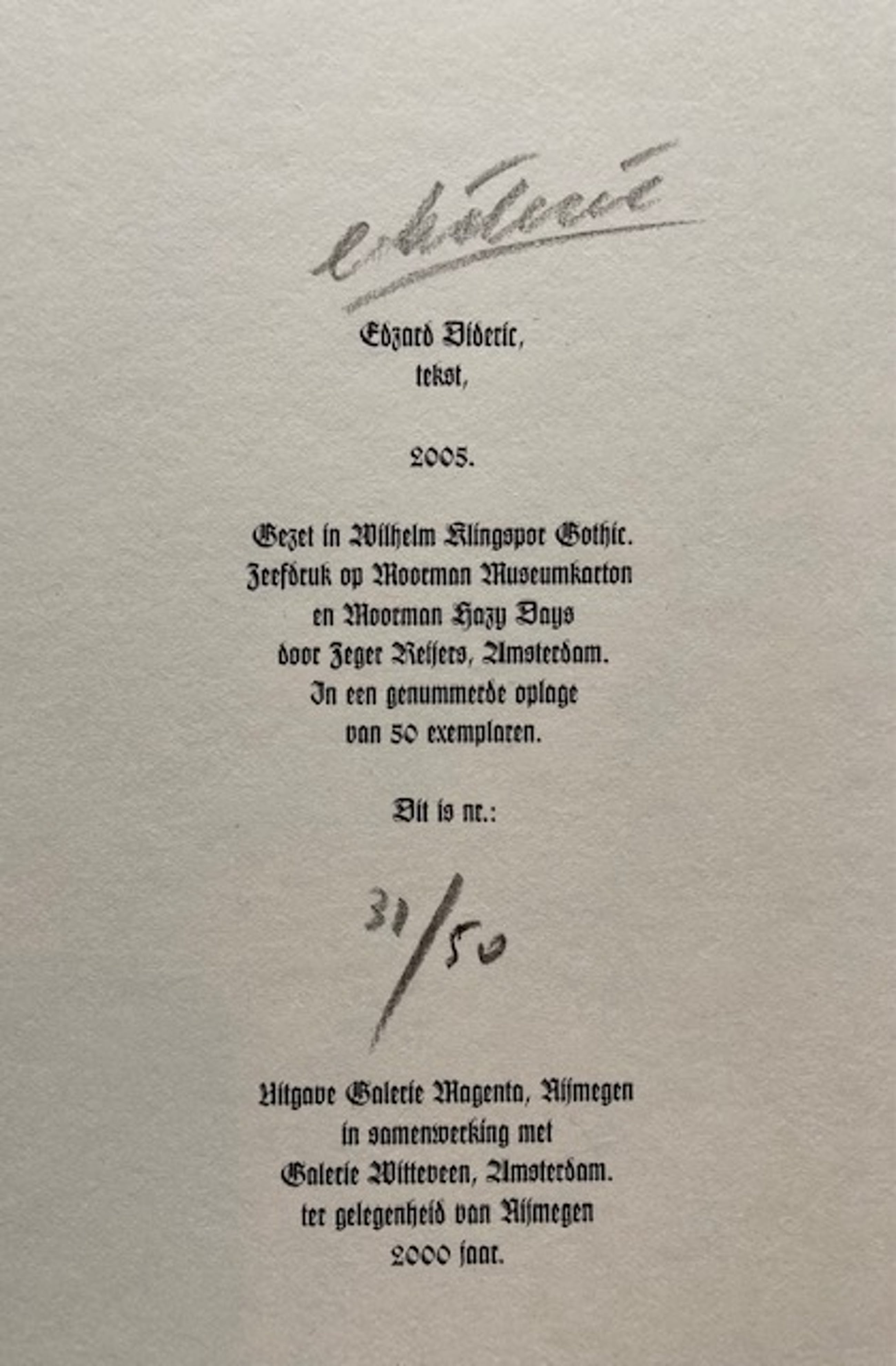 Serie van 4 zeefdrukken op zilverprint, Rob Scholte in samenwerking met de dichter Edzard Dideric, in originele box. Hierin titelvel, vel met dichtregels en een door beide kunstenaars gesigneerd colofon. Elke zeefdruk gesigneerd en genummerd door Rob Scholte 31/50