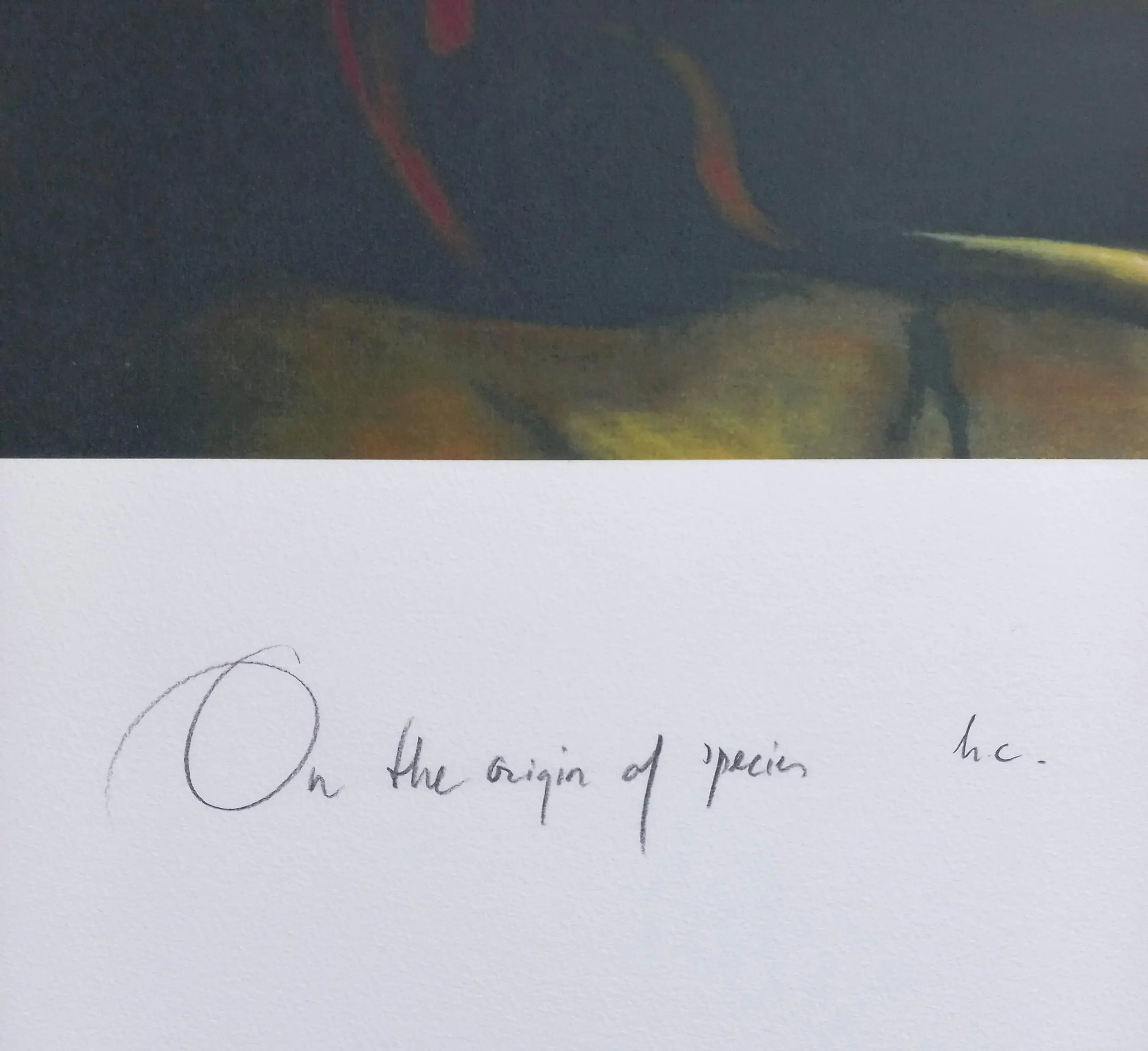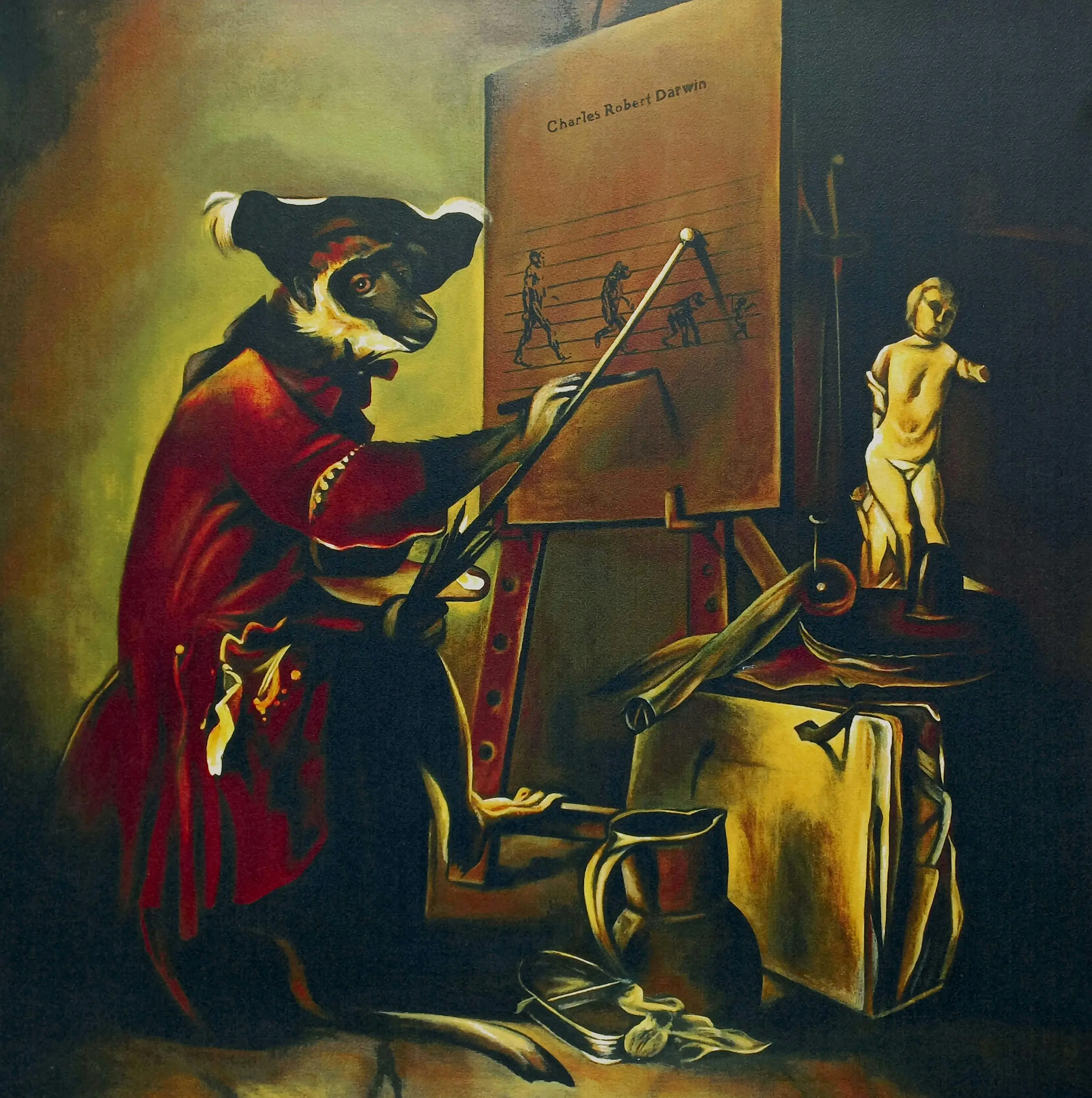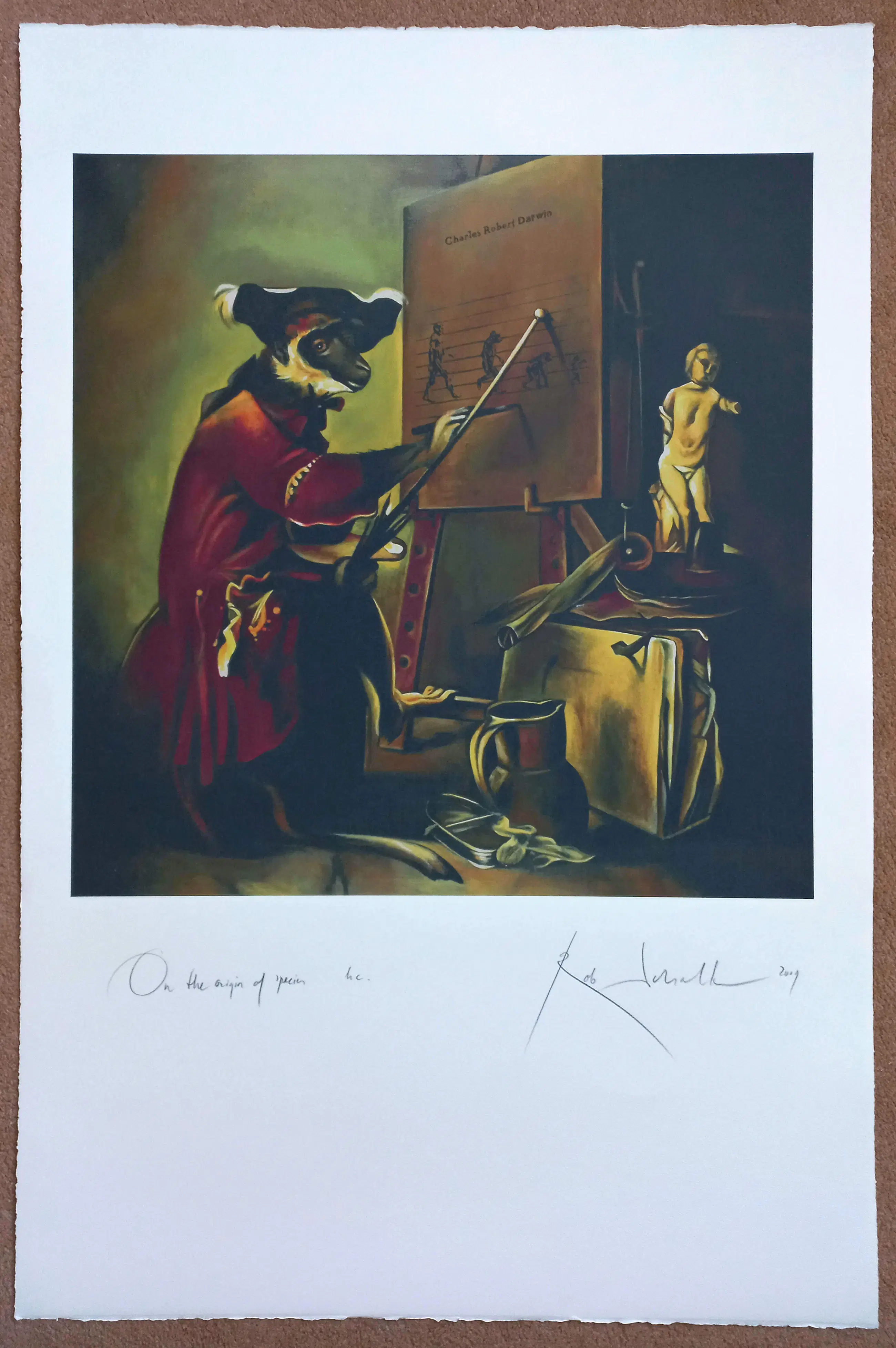 Groot en grappig werk van Rob Scholte, een persiflage op het beroemde boek over de evolutietheorie van Charles Darwin. Zeefdruk op Arches papier, met potlood gesigneerd, gedateerd (2009) en getiteld, een Hors Commerce (HC) exemplaar. In uitstekende conditie. Herkomst: Rob Scholte Museum. Galeriewaarde: 850 euro of meer, zie internet.