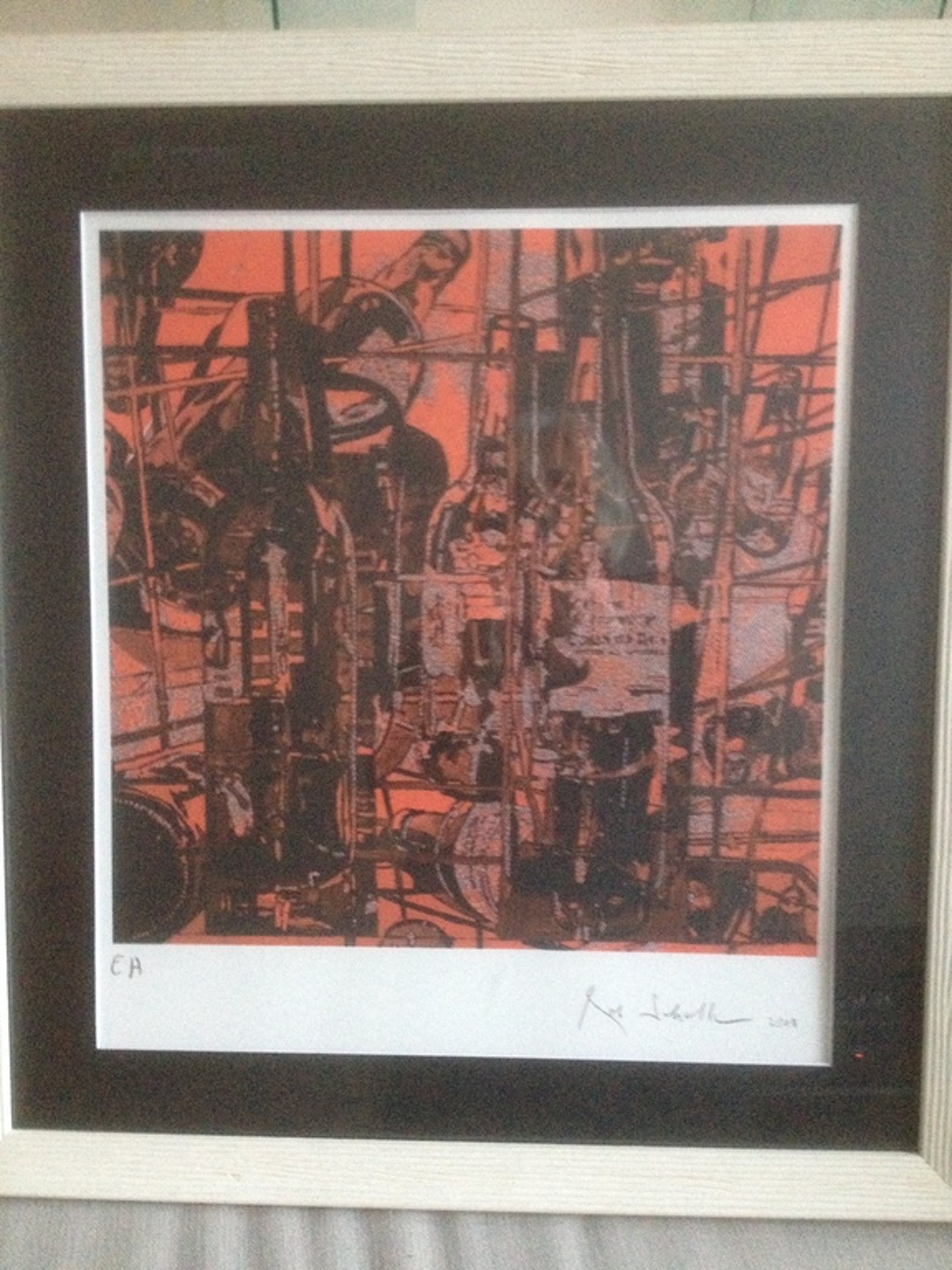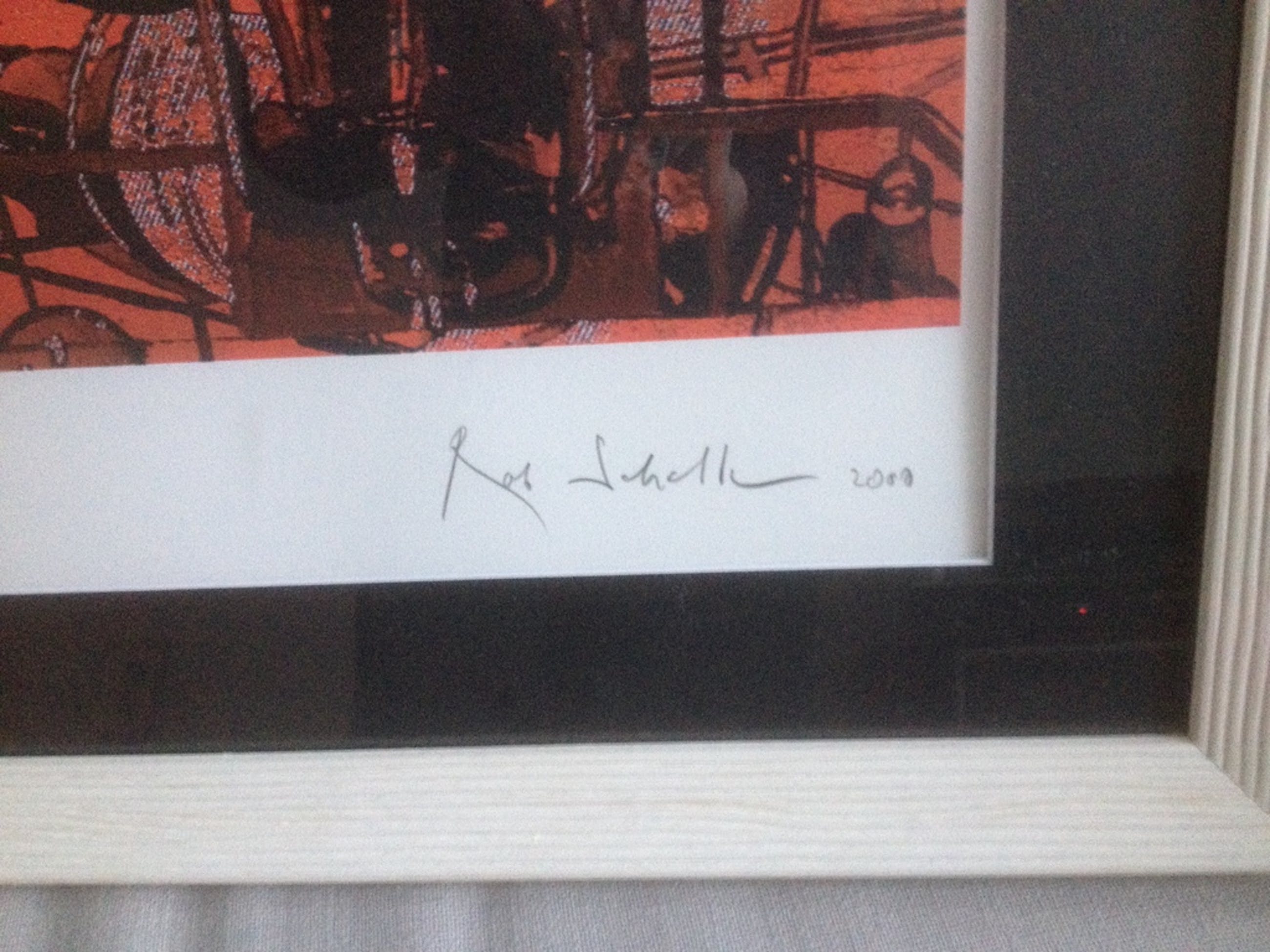 Prachtige zeefdruk in warme roodtinten. Eerste afdruk en gesigneerd in 2000.