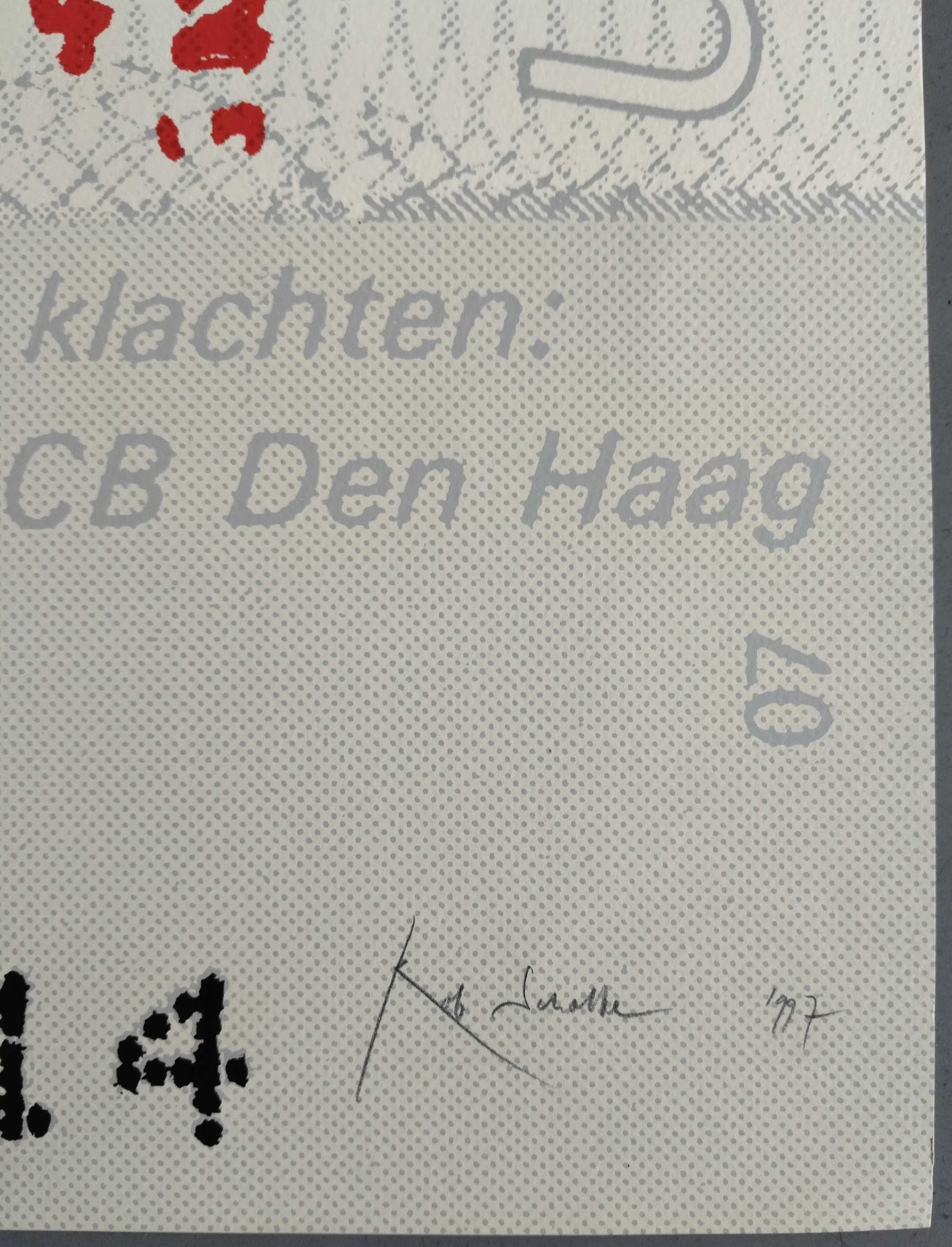 Gesigneerde zeefdruk uit 1997 van de kunstenaar Rob Scholte (1958) Rechts onder is het werk gesigneerd in potlood en links onder Voor Hugo. Het werk is niet genummerd. Papiermaat 80 x 59 cm. De zeefdruk is in prima staat en is nooit ingelijst geweest.
