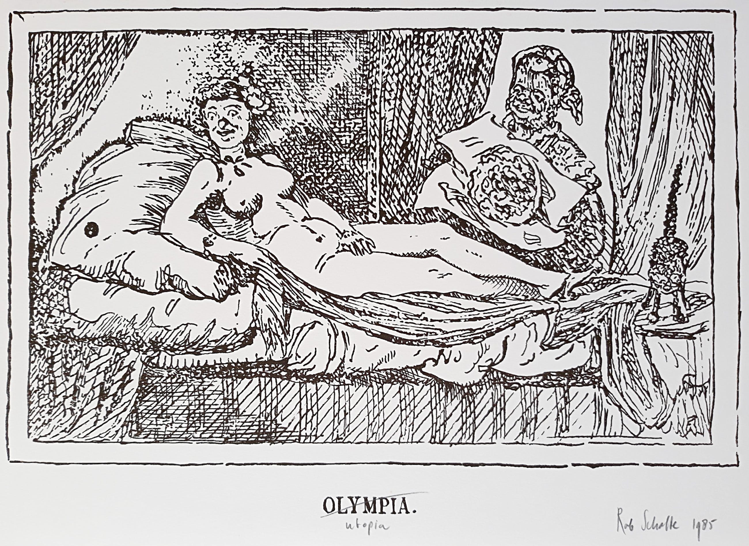 Bekend werk van Ron Scholte, naar een schilderij van Manet uit 1863; “Olympia” (wordt niet meegeleverd). Zeefdruk op papier, met potlood gesigneerd, gedateerd (1985) en getiteld. In uitstekende conditie.