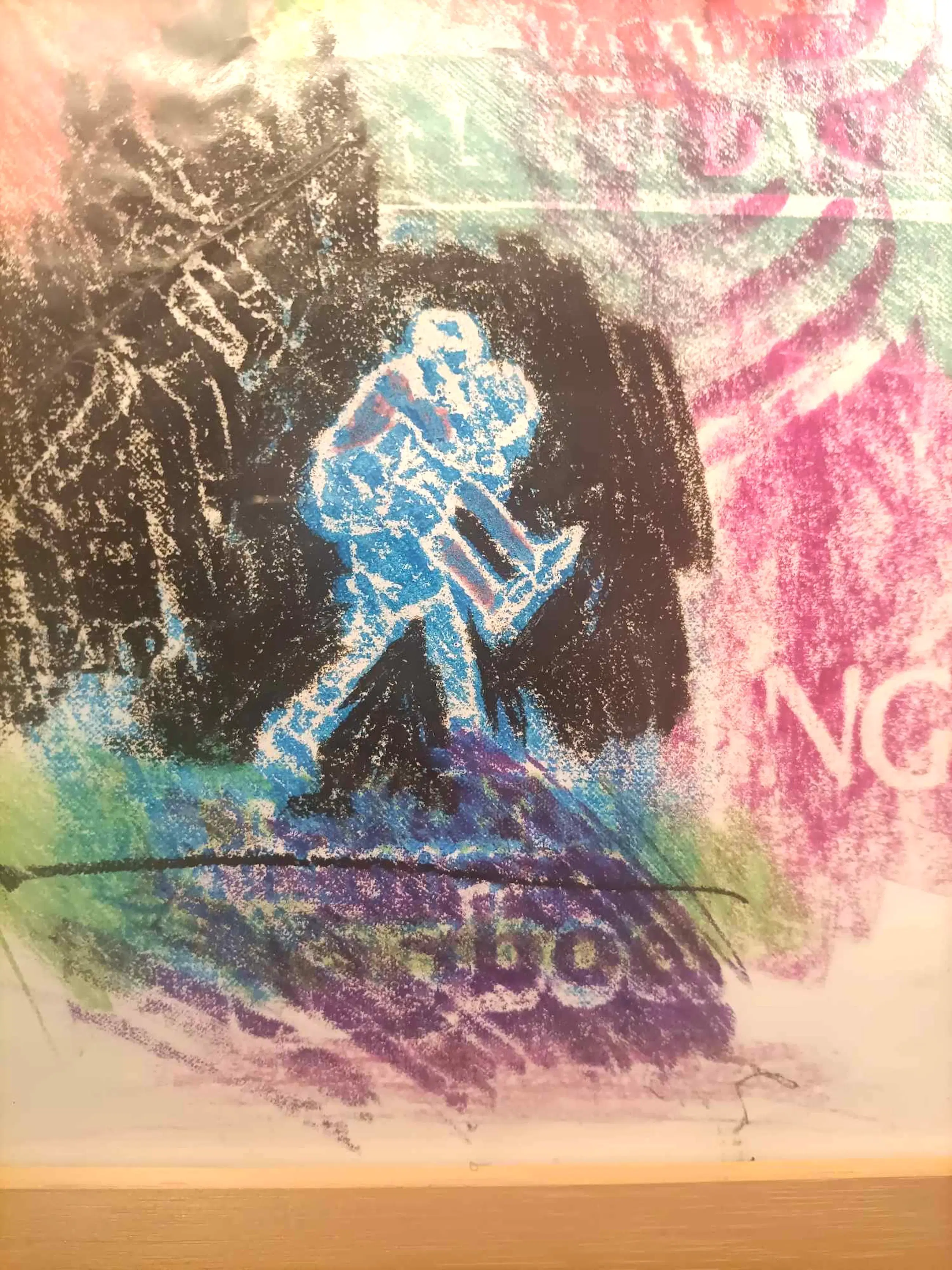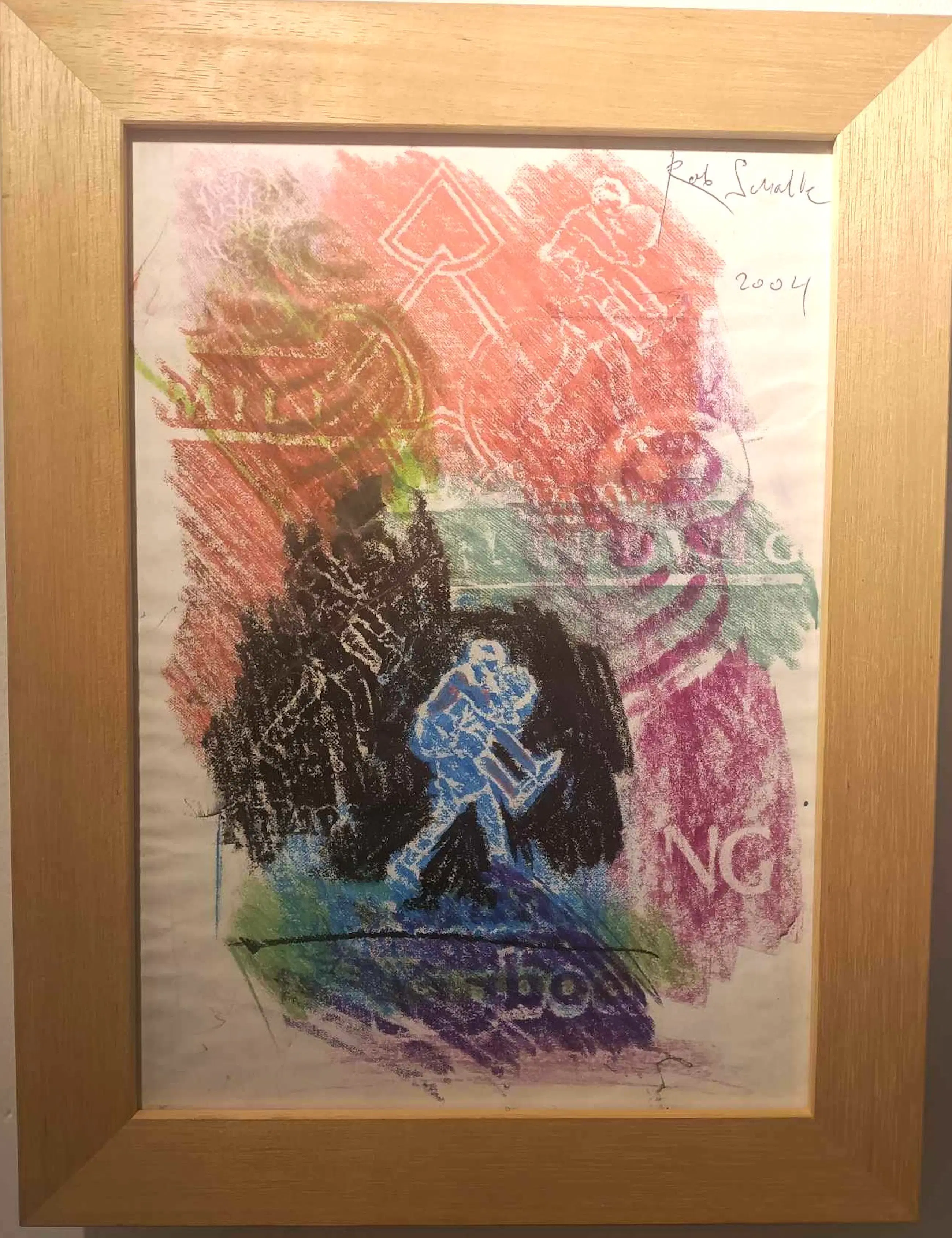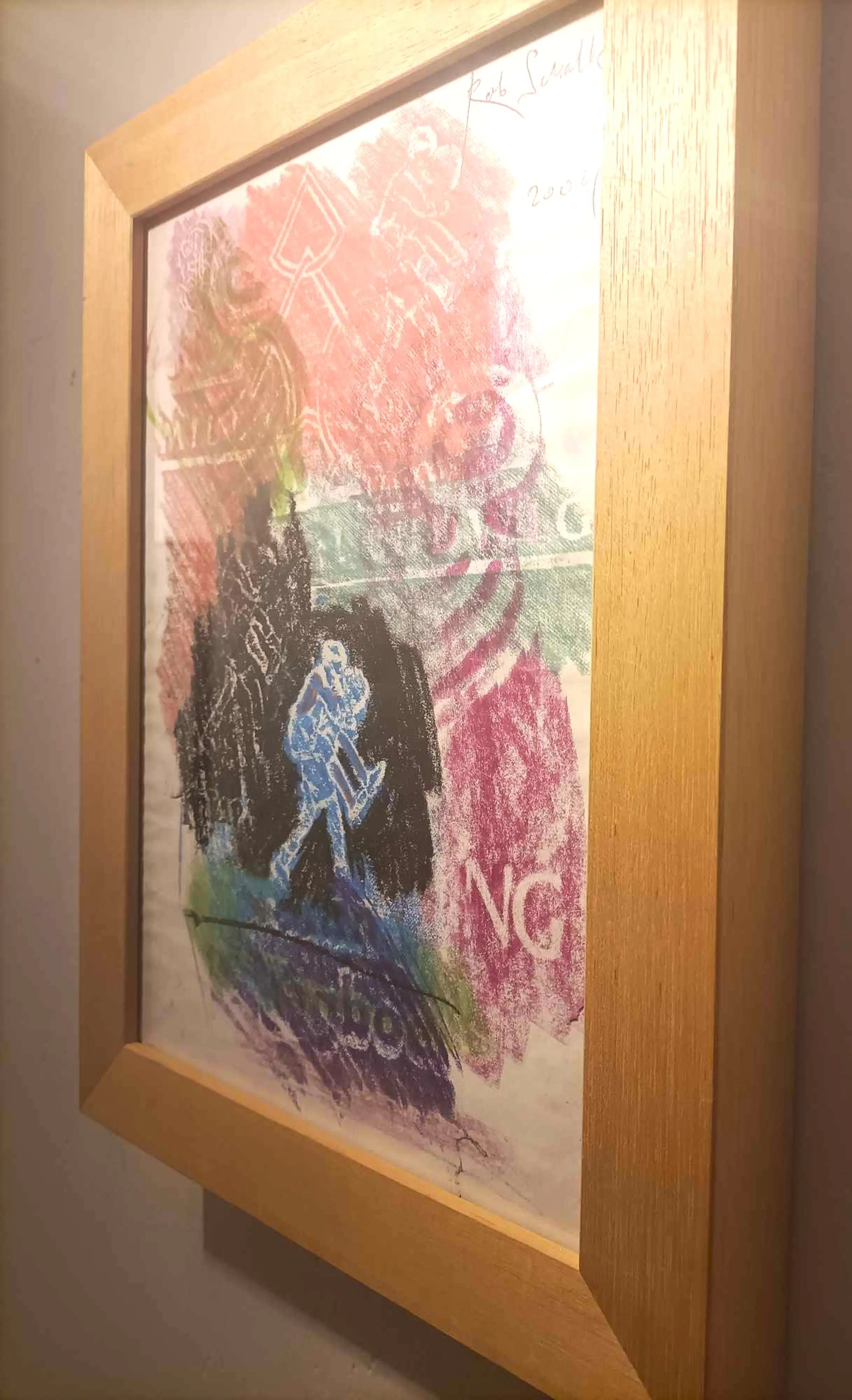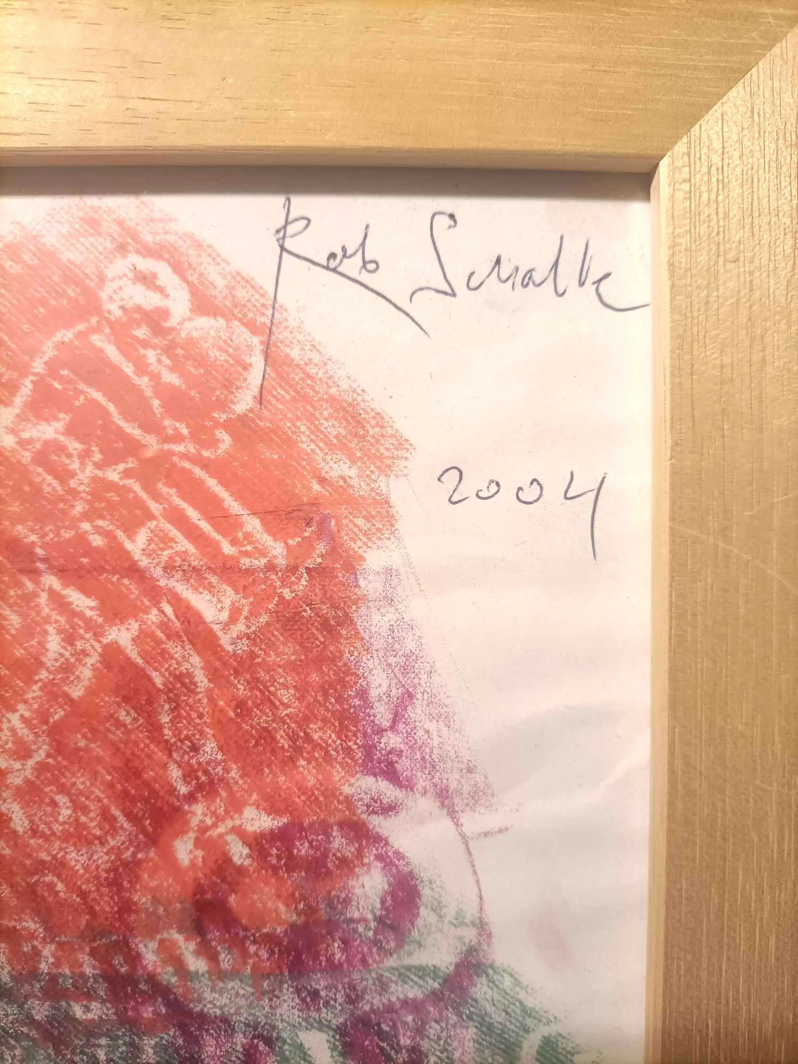 Met vetkrijt heeft Rob Scholte allerlei logo´s, zoals bijv. van I Tjing, ING en de Vrijmetselaars op papier overgenomen. Met balpen handgesigneerd in houtenlijst. Zeer goede conditie.