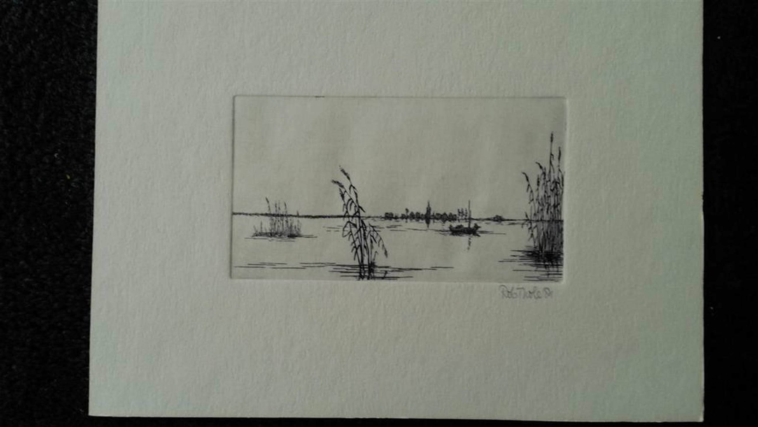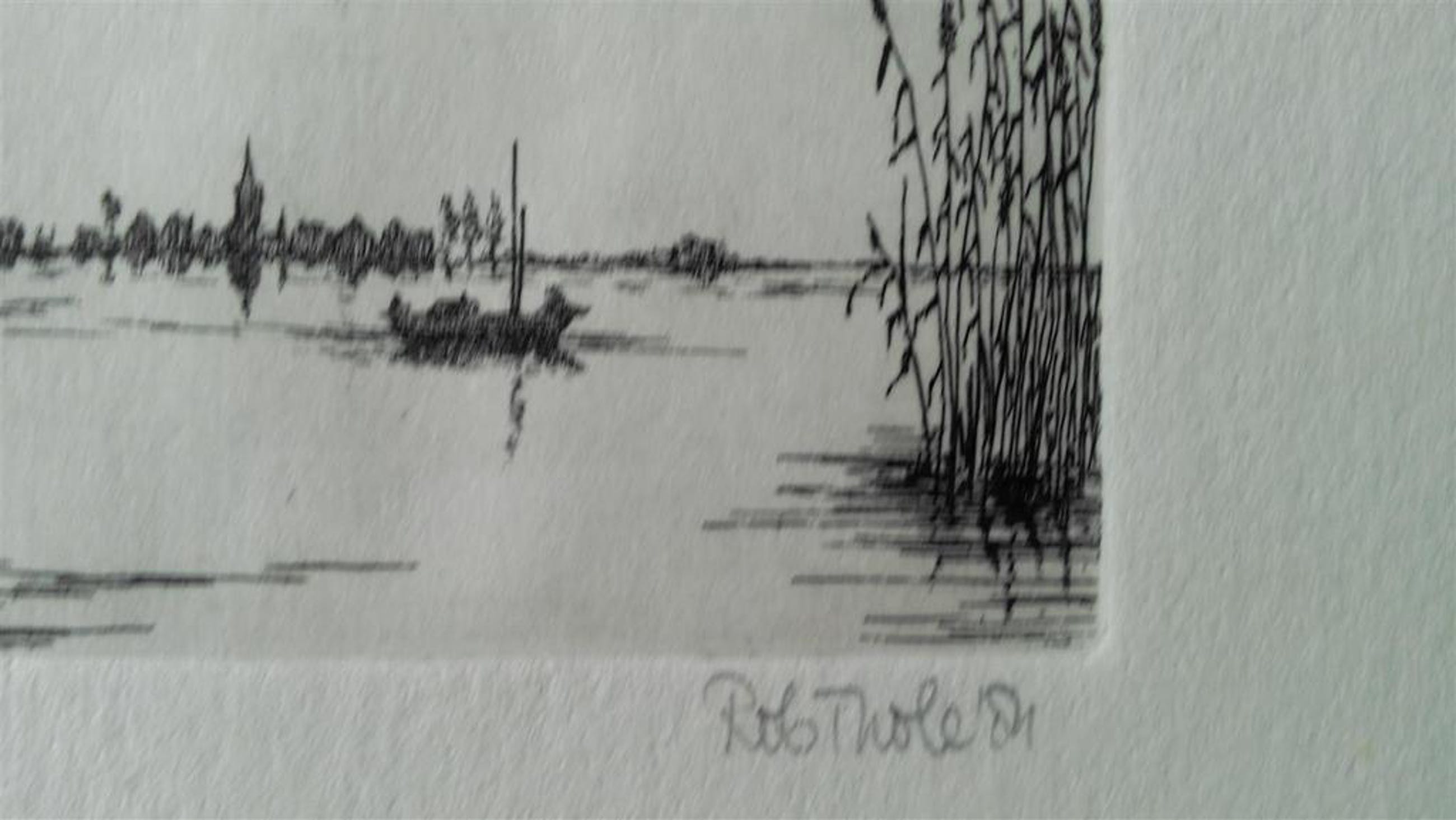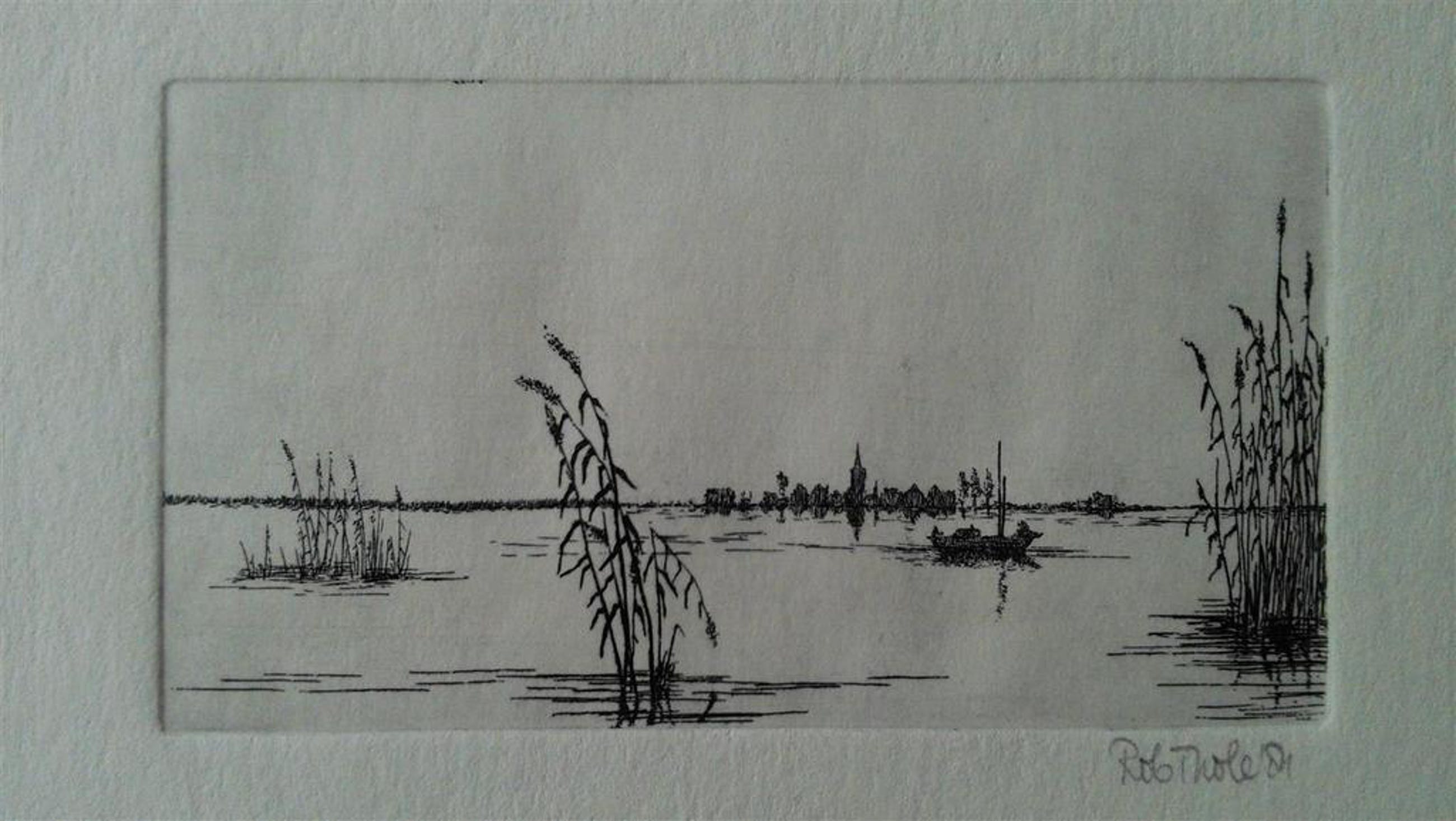 Klein maar fijn en o zo sfeervol, Ets van Rob Thole gesigneerd en jaartal met vissresbootje op een kalm meer. met kerktoren aan de horizon