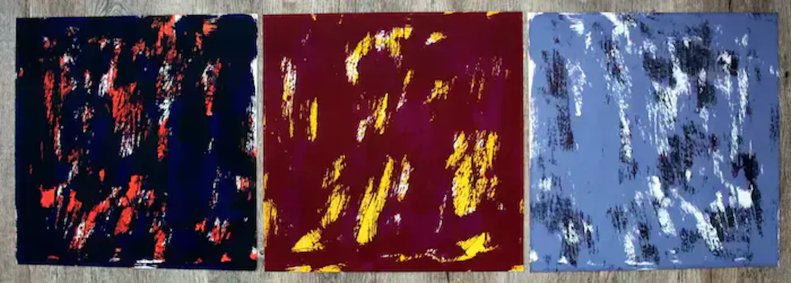 Drieluik van zeefdrukken van Rob van Koningsbruggen. Abstracte compositie. Afmetingen: H44 x b44 cm. Gesigneerd: op achterzijde van 1 van de drie zeefdrukken, zoals uitgegeven. De authenticiteit van het aangeboden werk wordt volledig gegarandeerd. Een certificaat van echtheid kan, op aanvraag, worden gemaild.