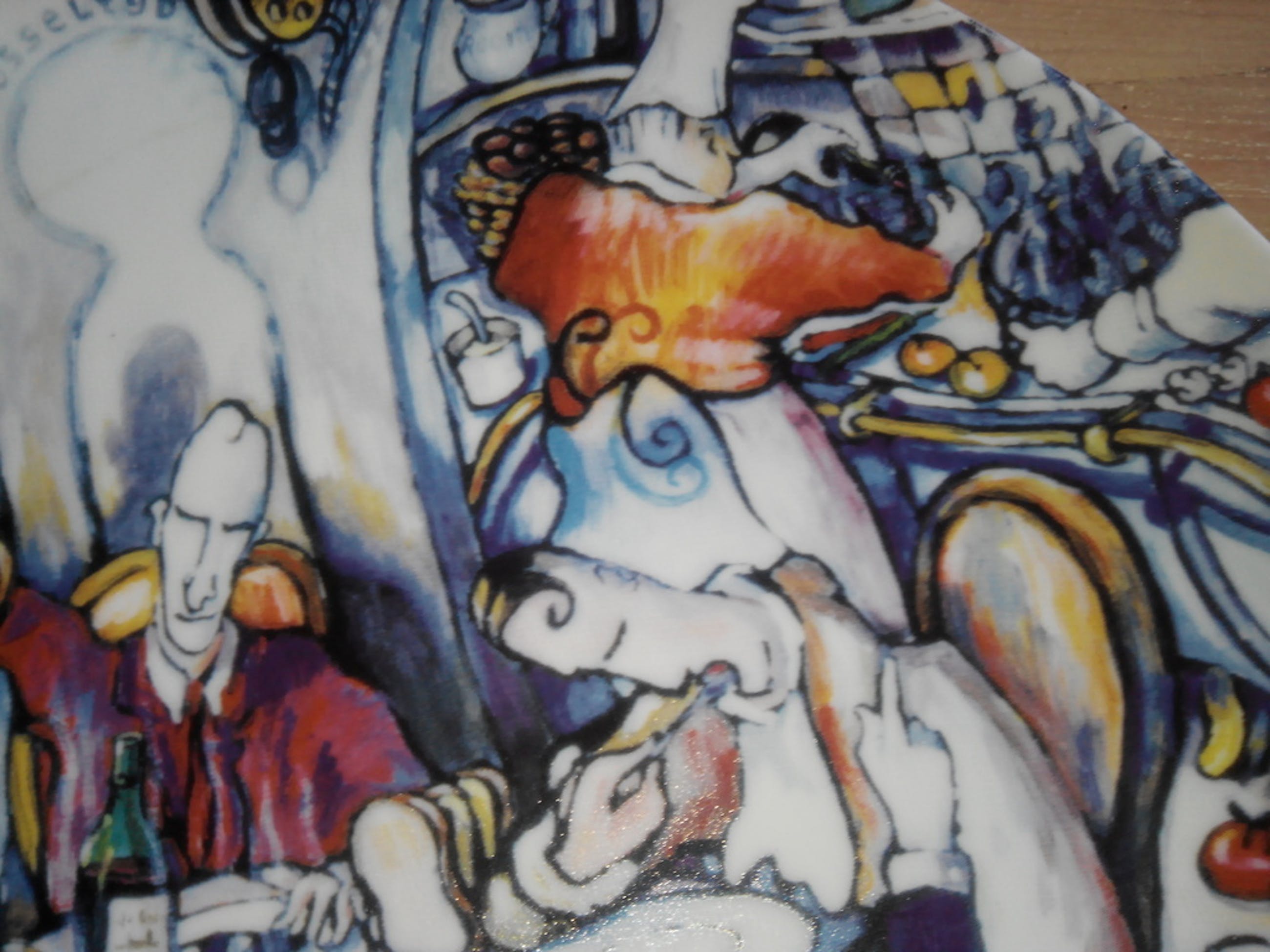 Prachtig gaaf bord met daarop een druk van deTilburgse kunstenaar Rob van Trier, Limited Edition, vervaardigd door Schoonhoven Keramiek. Titel: Mosseltijd Diameter 31 cm.