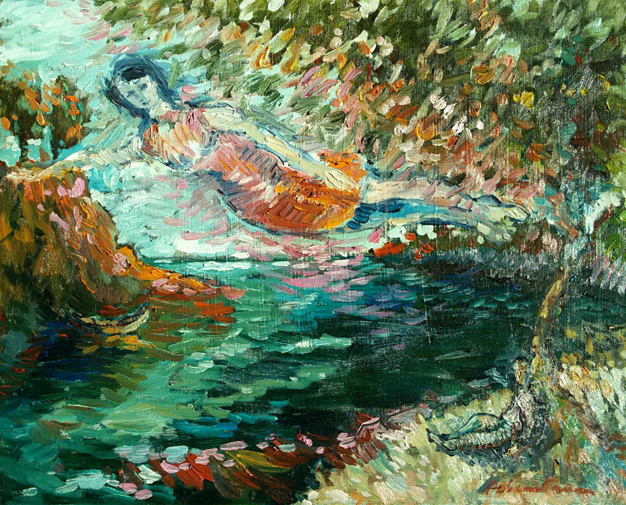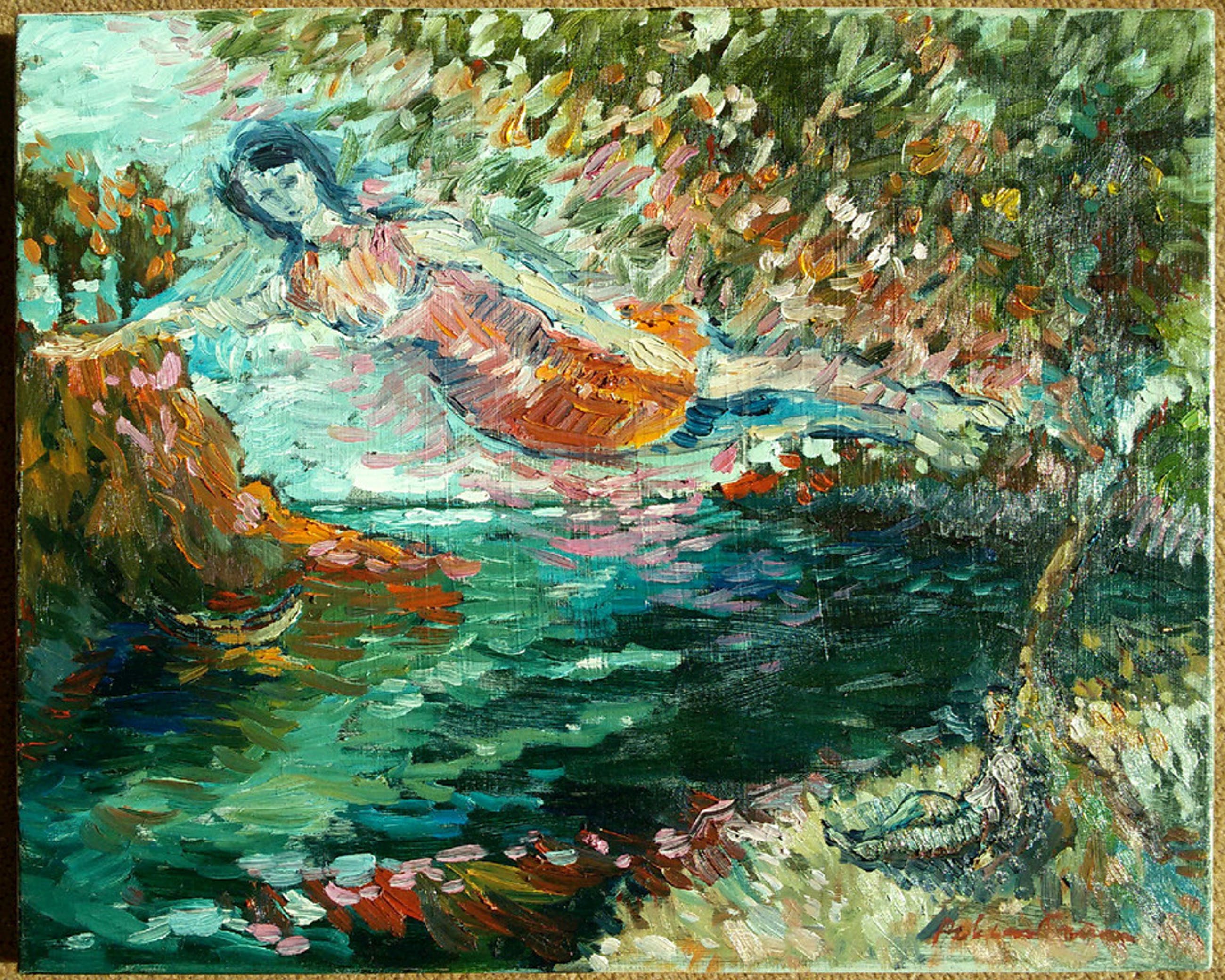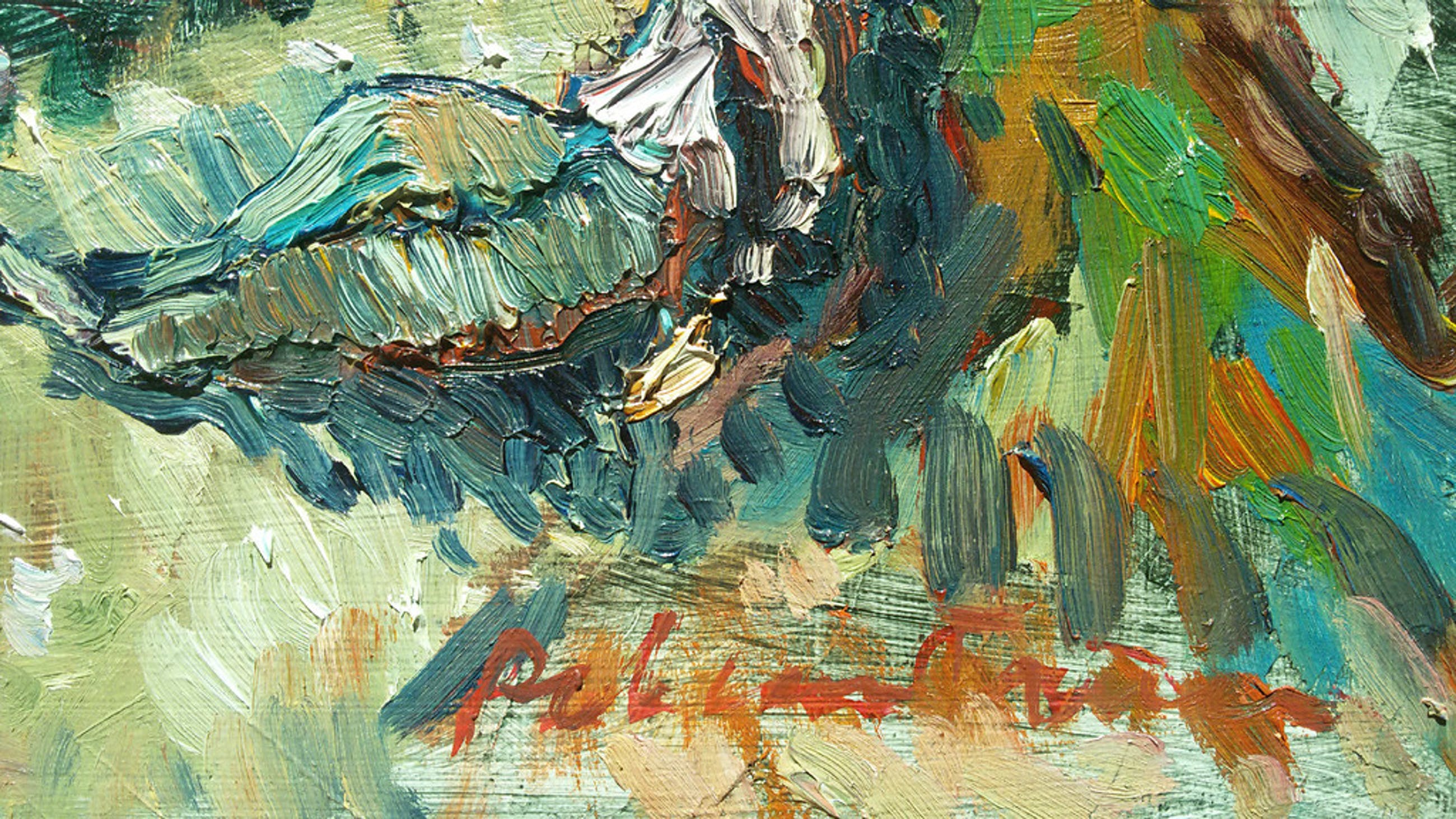 Karakteristiek werk van de bekende Tilburgse kunstenaar Rob van Trier. Olieverf op doek, gesigneerd rechtsonder, in uitstekende conditie.