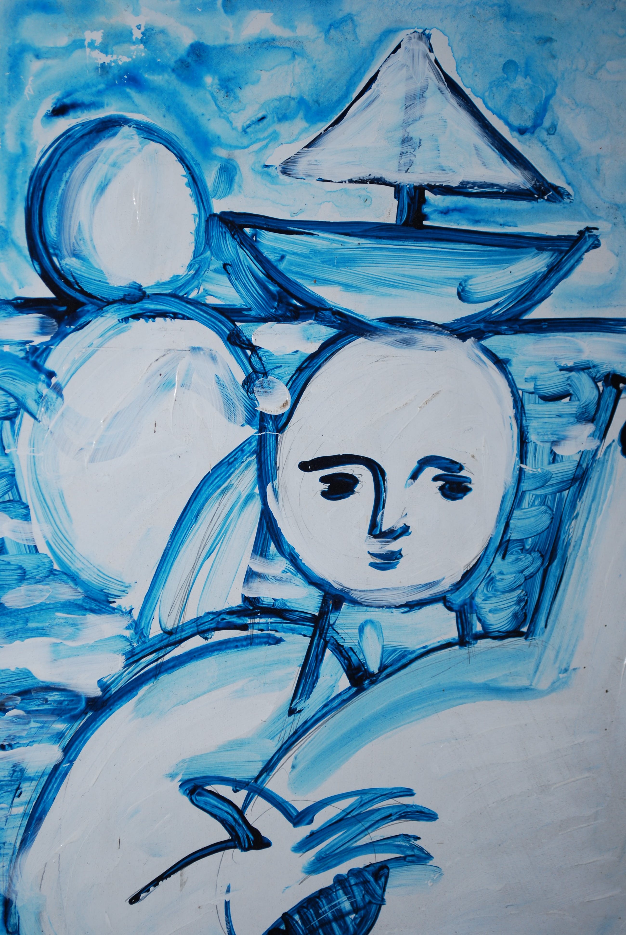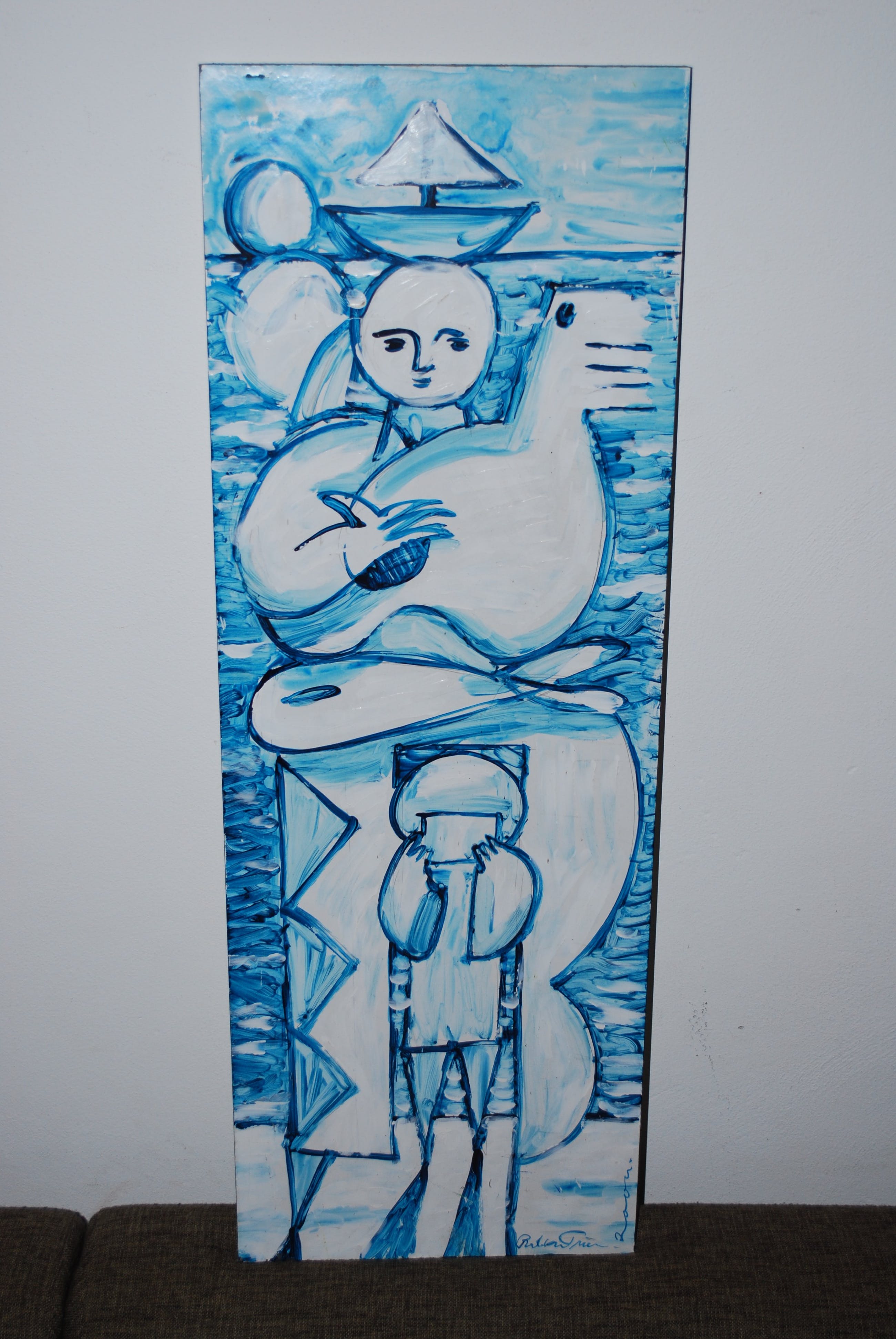 Dit lijkt op een strandscene. Olieverf op een 2 cm dikke gelamineerde plank (spaanplaat).De zijkanten zijn ook meegeschilderd. Gesigneerd en gedateerd rechtsonder.