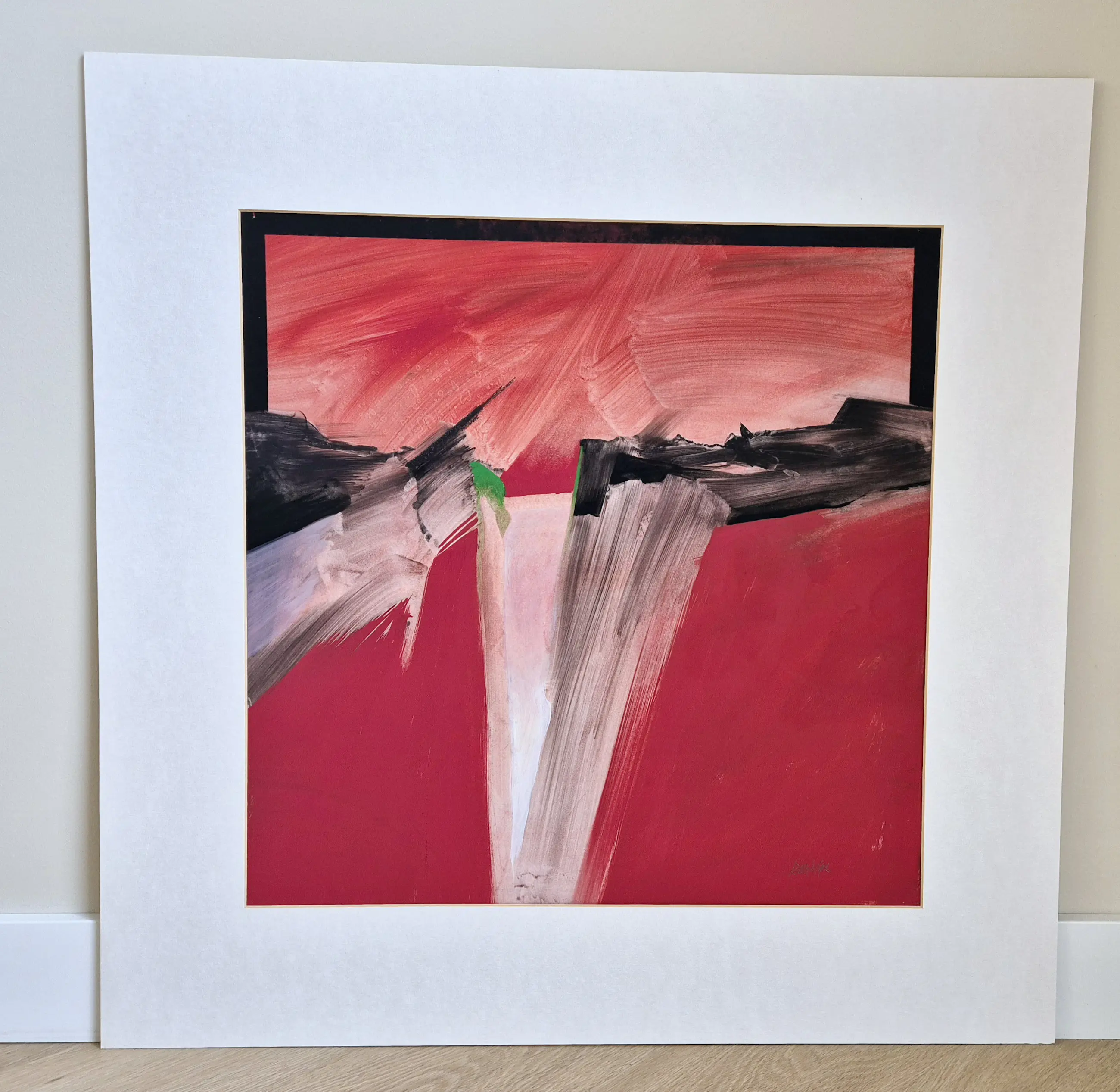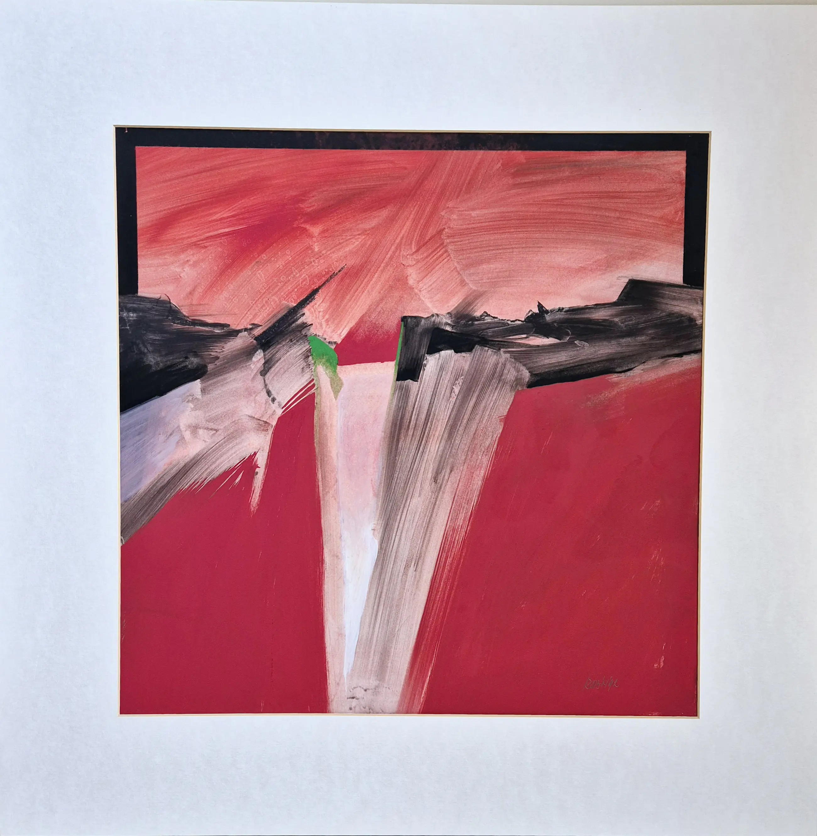 Abstract expressionistisch schilderij met krachtige penceelstreken en een opvallend kleurcontrast rood zwart wit en een vleugje groen.