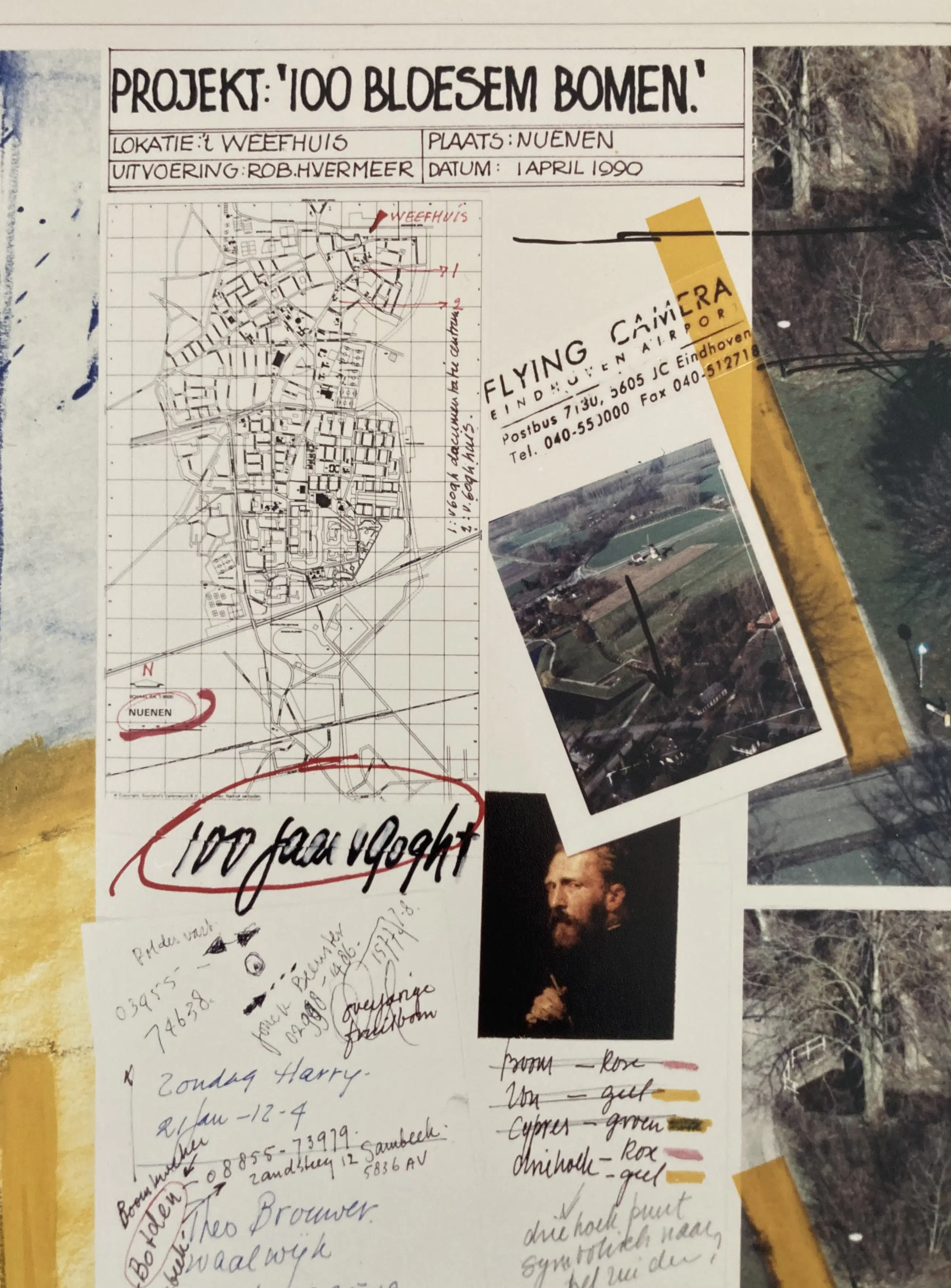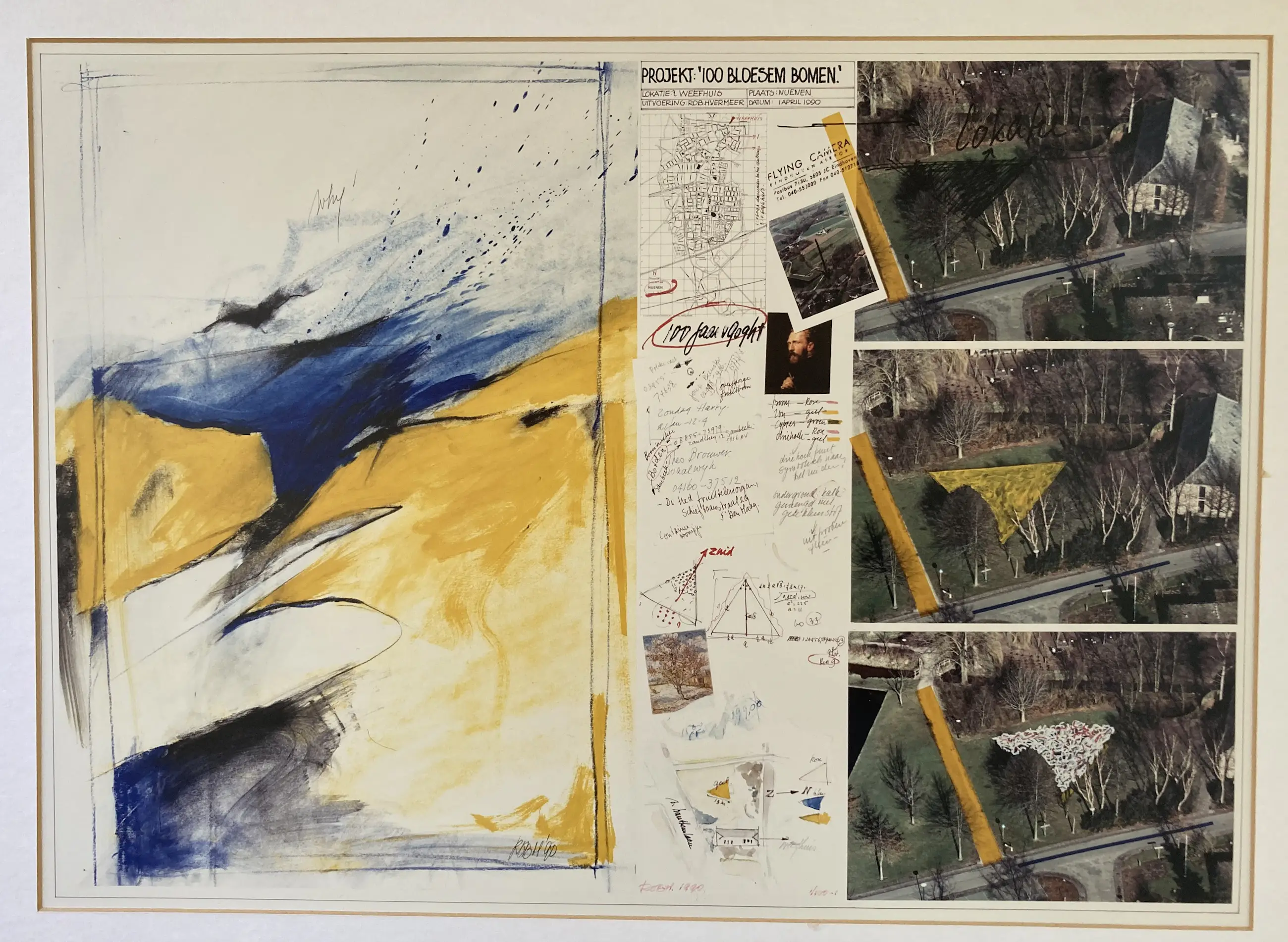 Karakteristiek werk met passe-partout (60 x 80 cm). De litho is op stevig karton geplakt. Opzet voor een mogelijk landart project in Nuenen (‘t Weefhuis) in het kader van 100 jaar Van Gogh. Het geheel verkeert in goede staat en is gesigneerd.