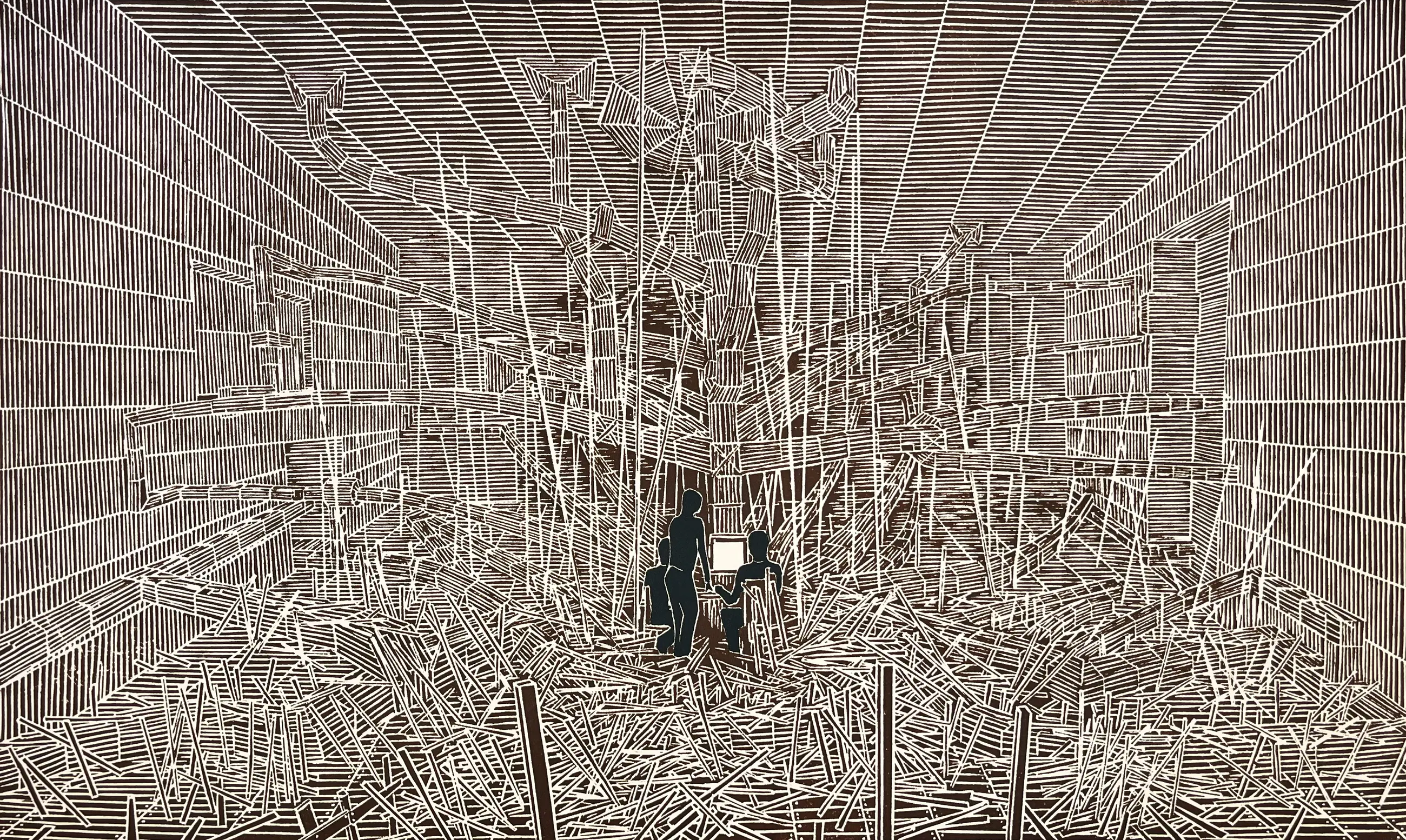Intrigerend werk van Rob Voerman. Mooi werk als voorloper op zijn kartonnen installaties. Gesigneerd met potlood.