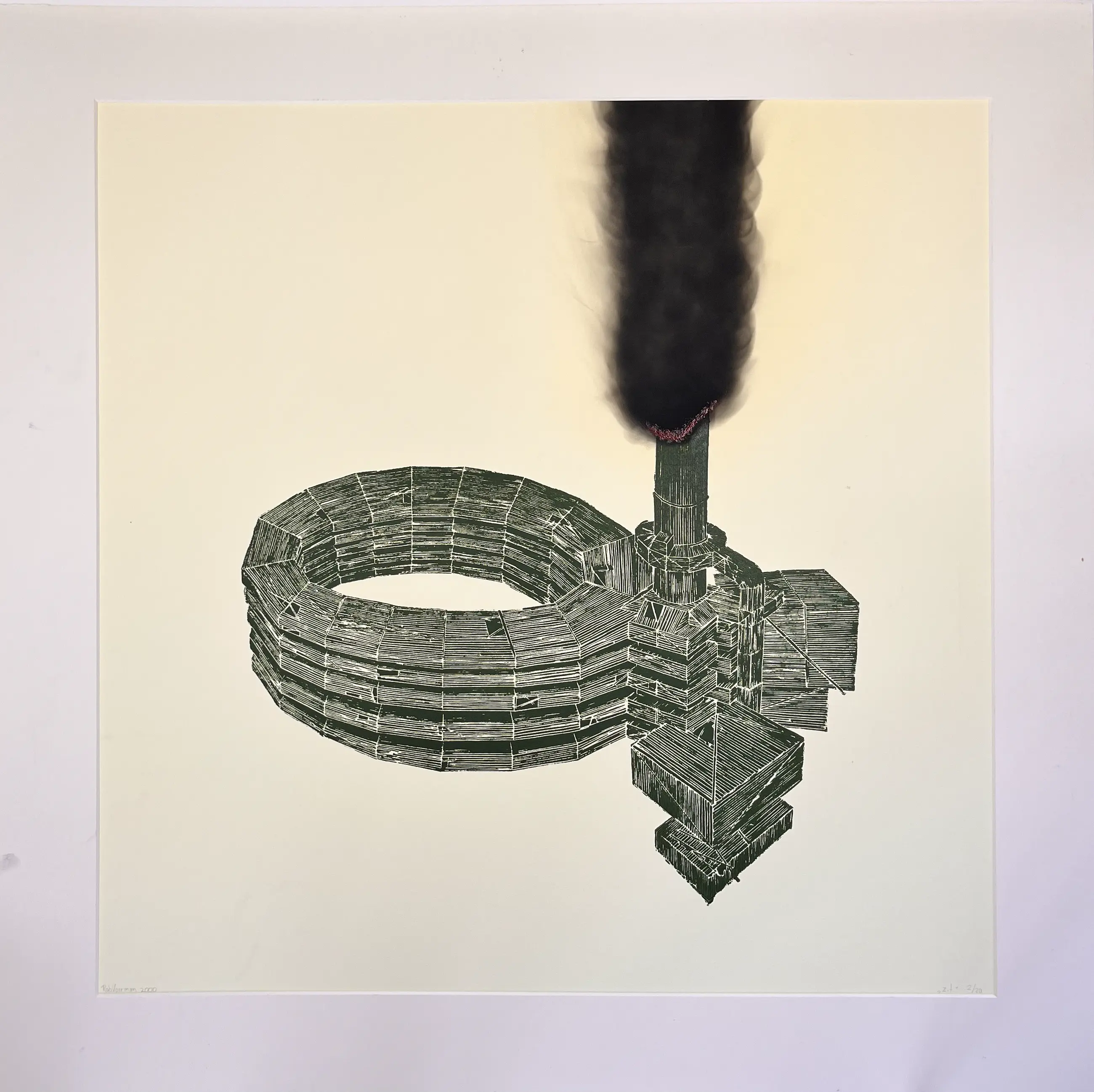 Intrigerend werk van Rob Voerman. Mooi werk als voorloper op zijn kartonnen installaties. Gesigneerd met potlood. Grafiek in gemengde technieken. Het werk is opgeplakt op karton en door het formaat (met passe Partout niet makkelijk verzonden worden dus liefst ophalen.