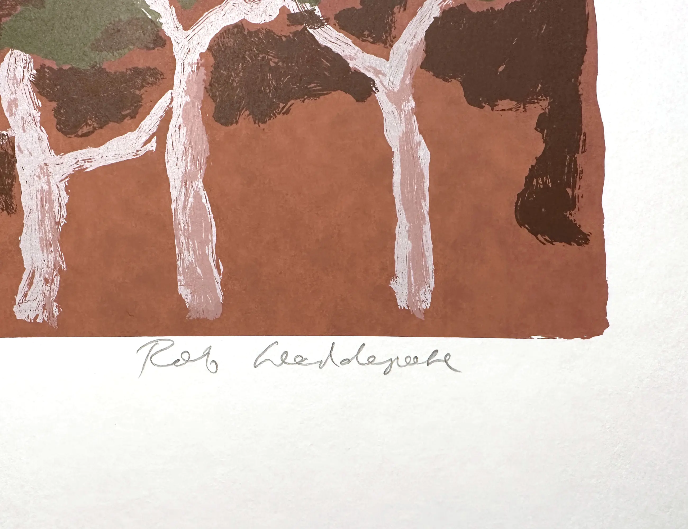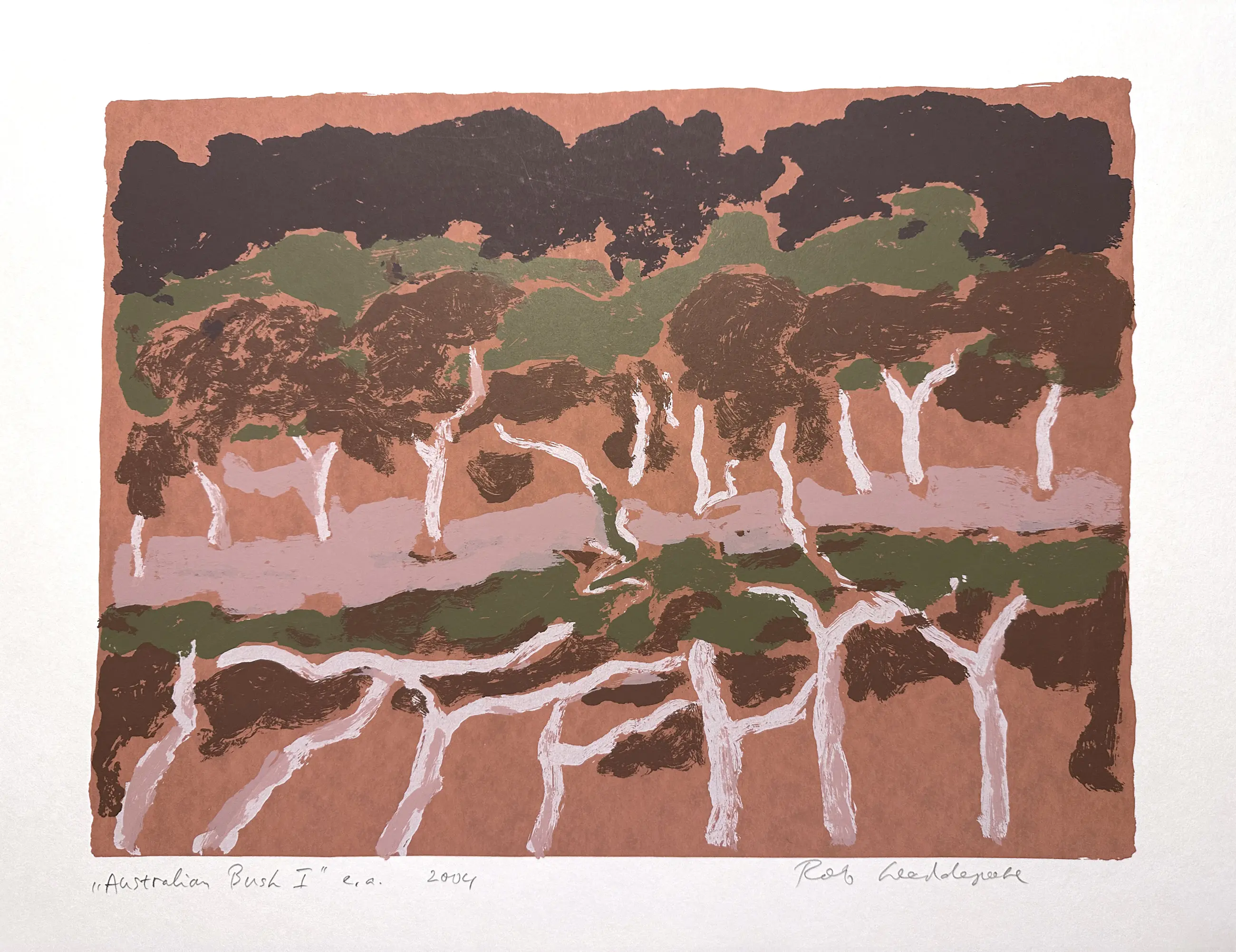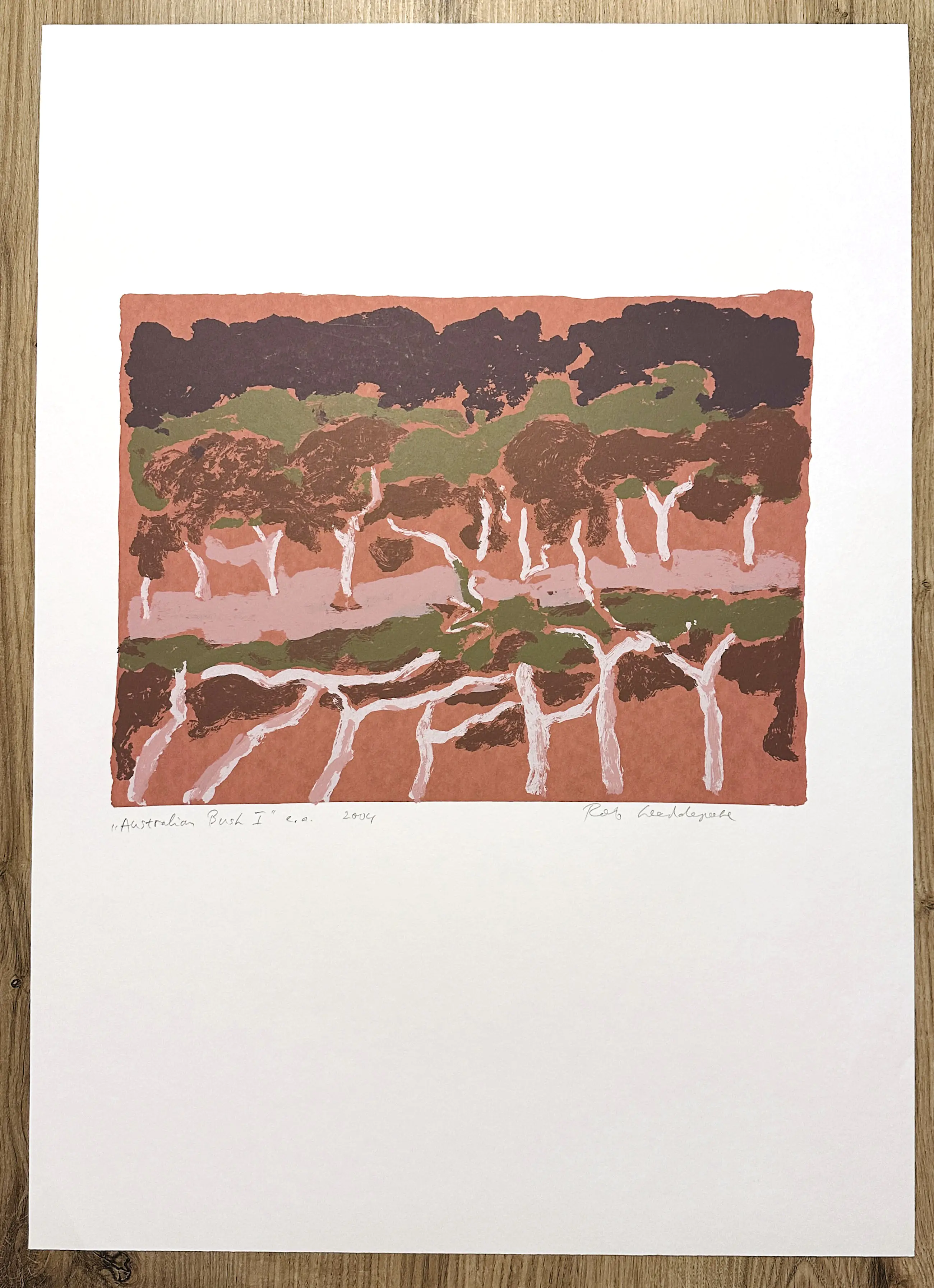 Zeefdruk van Rob Weddepohl uit 2004, gemaakt in een onbekende oplage. Het werk is gebaseerd op het verblijf en de reizen van Weddepohl in Australië. Gedrukt op zuurvrij papier, papierformaat 70 x 50 cm, afbeelding 30 x 40 cm. Handgesigneerd en genummerd 'e.a.' (Epreuve d'Artiste) door de kunstenaar. De zeefdruk is in uitstekende staat. Kan indien gewenst verzonden worden in een stevige kartonnen koker.