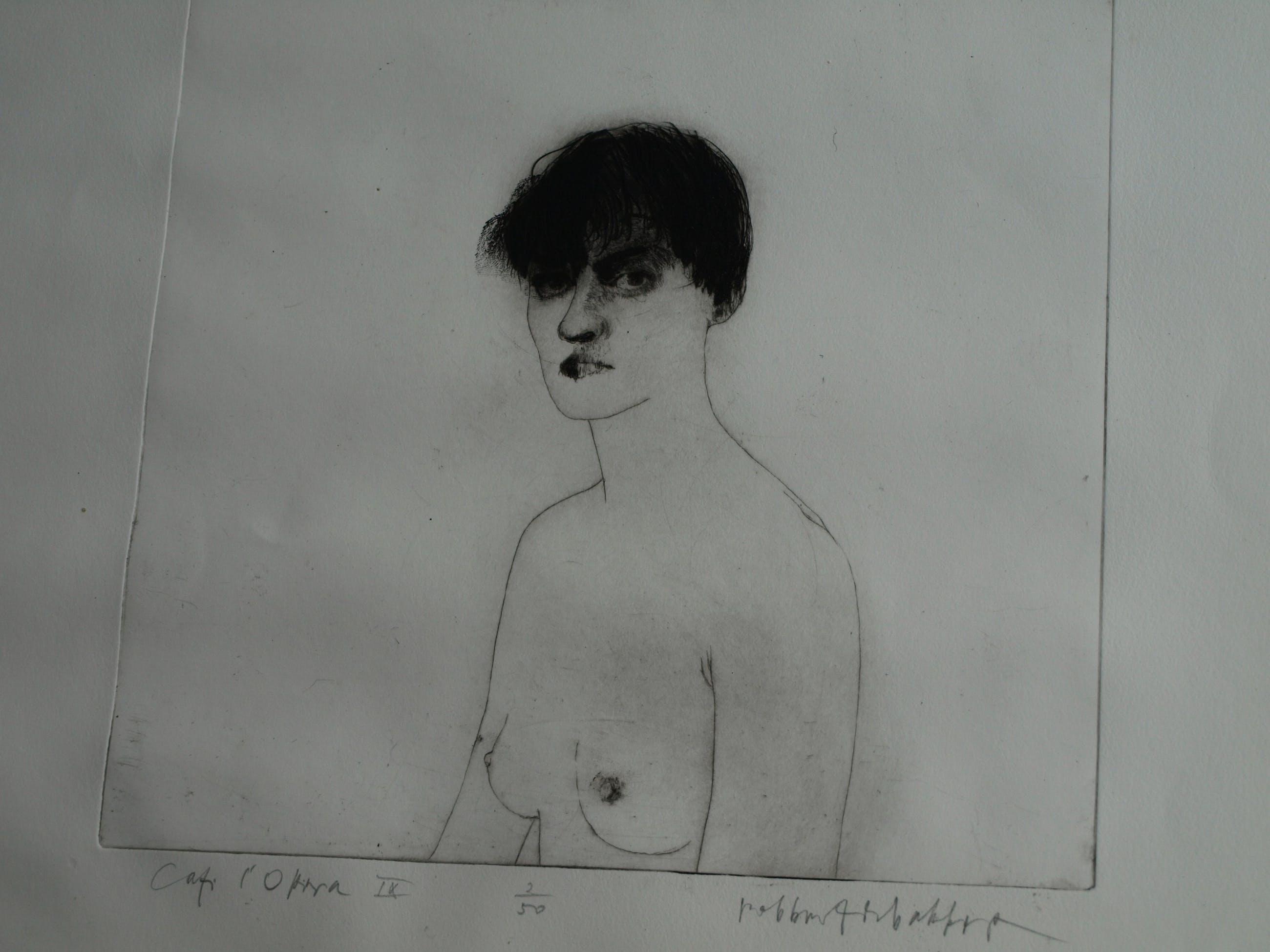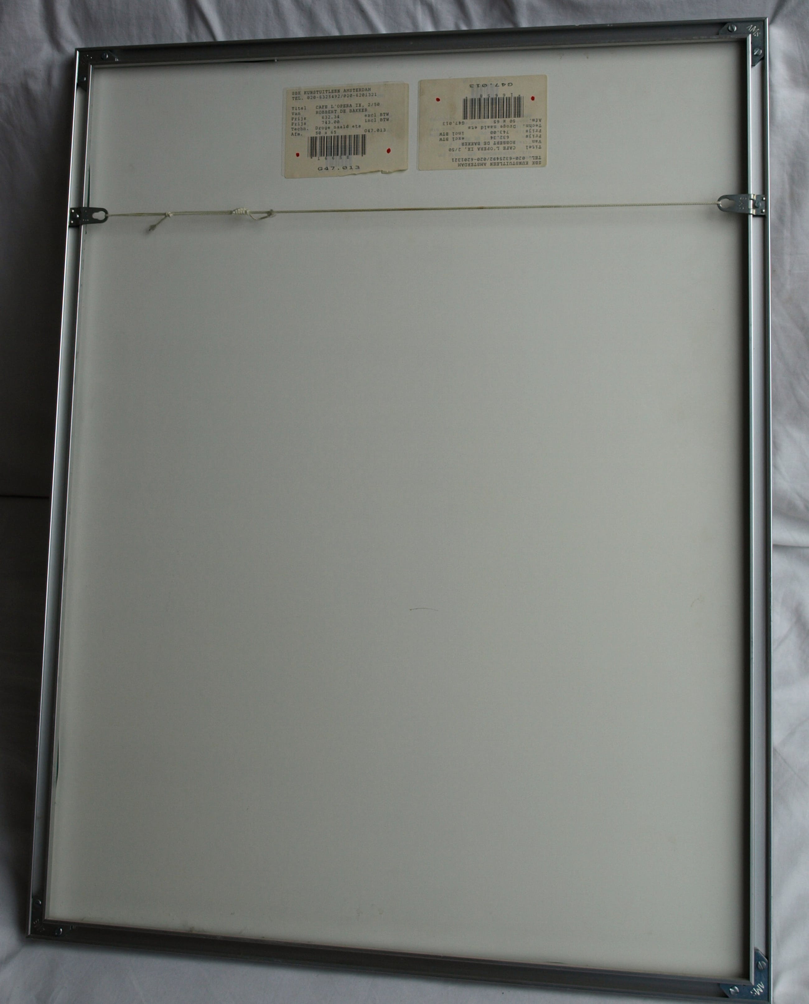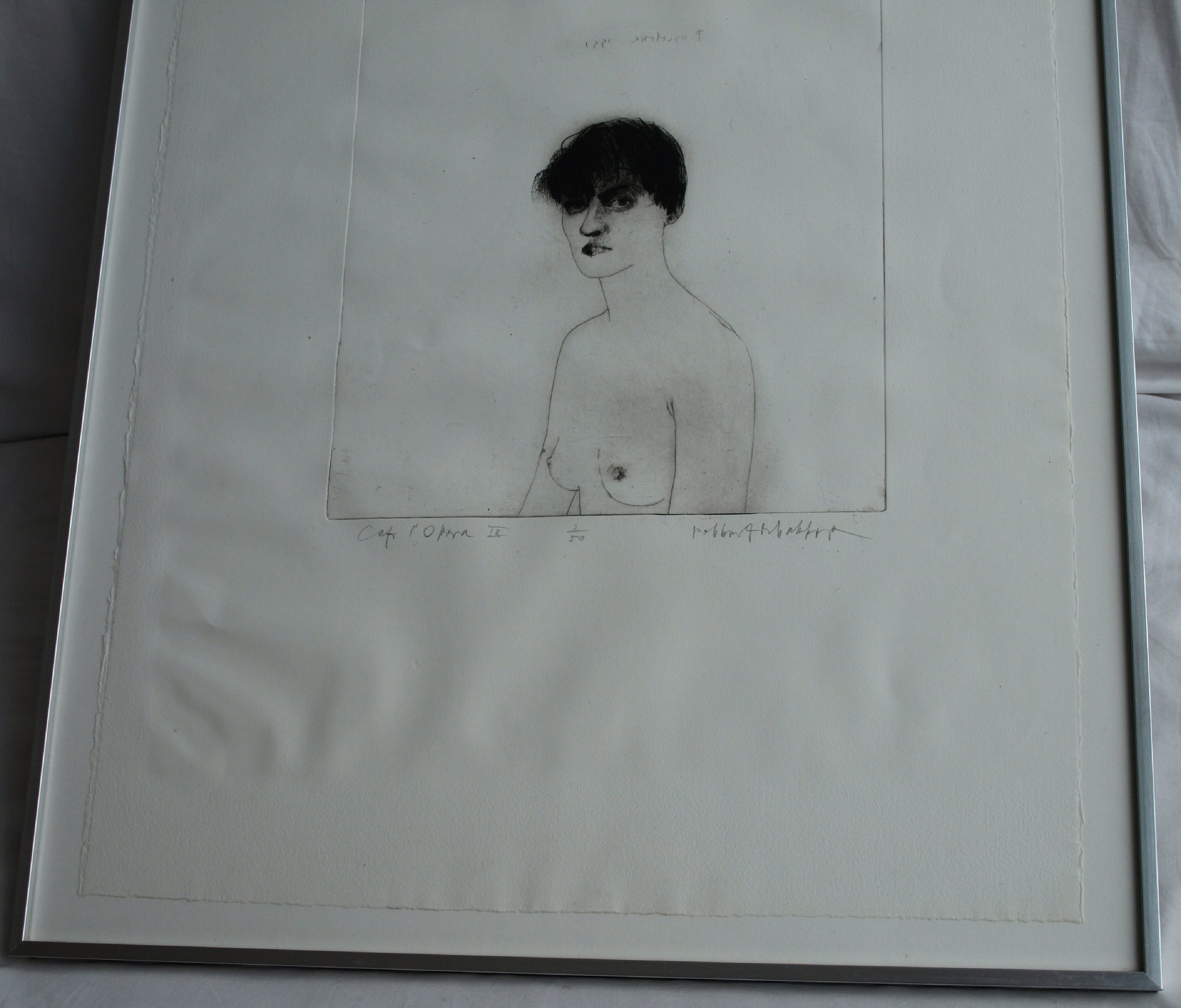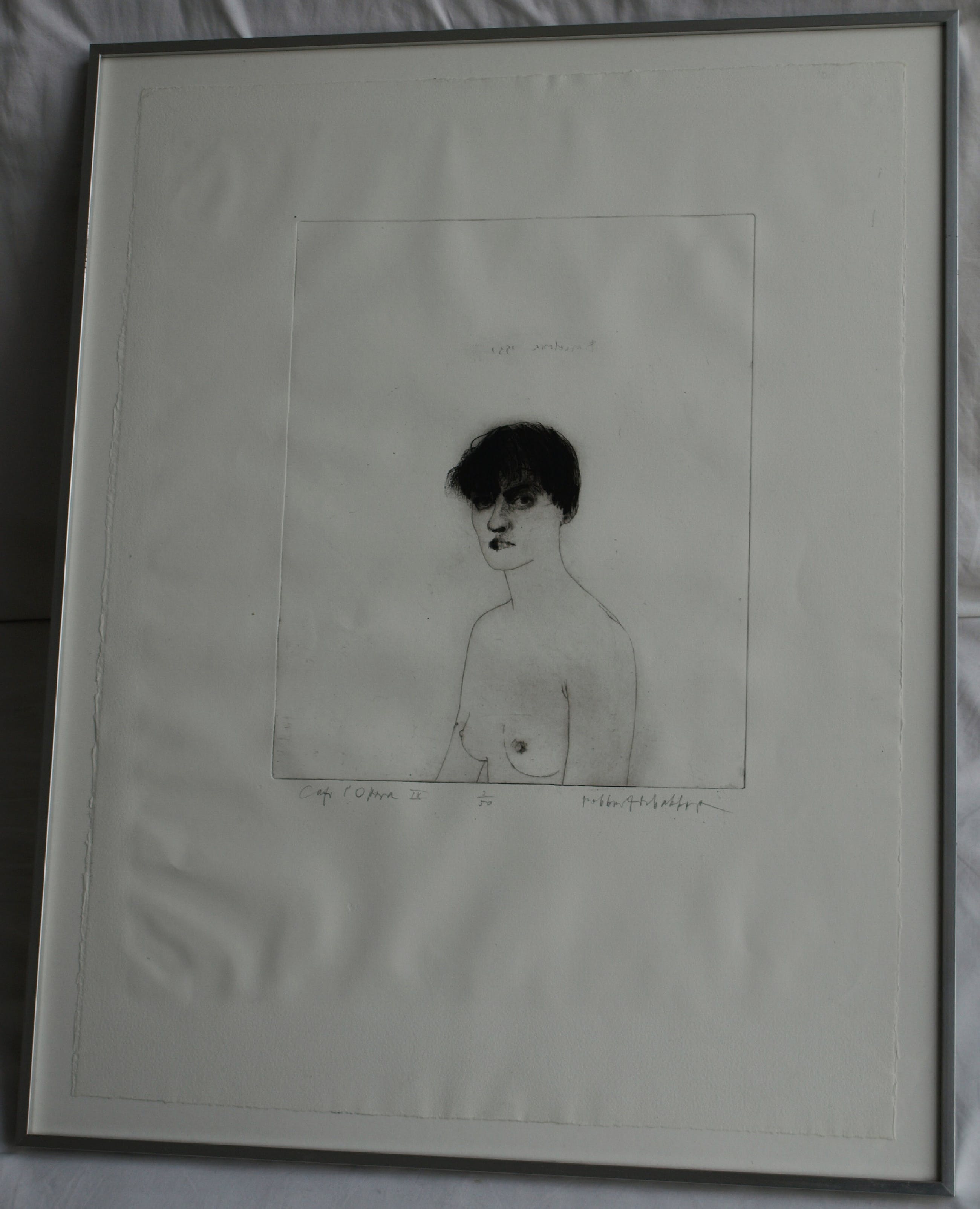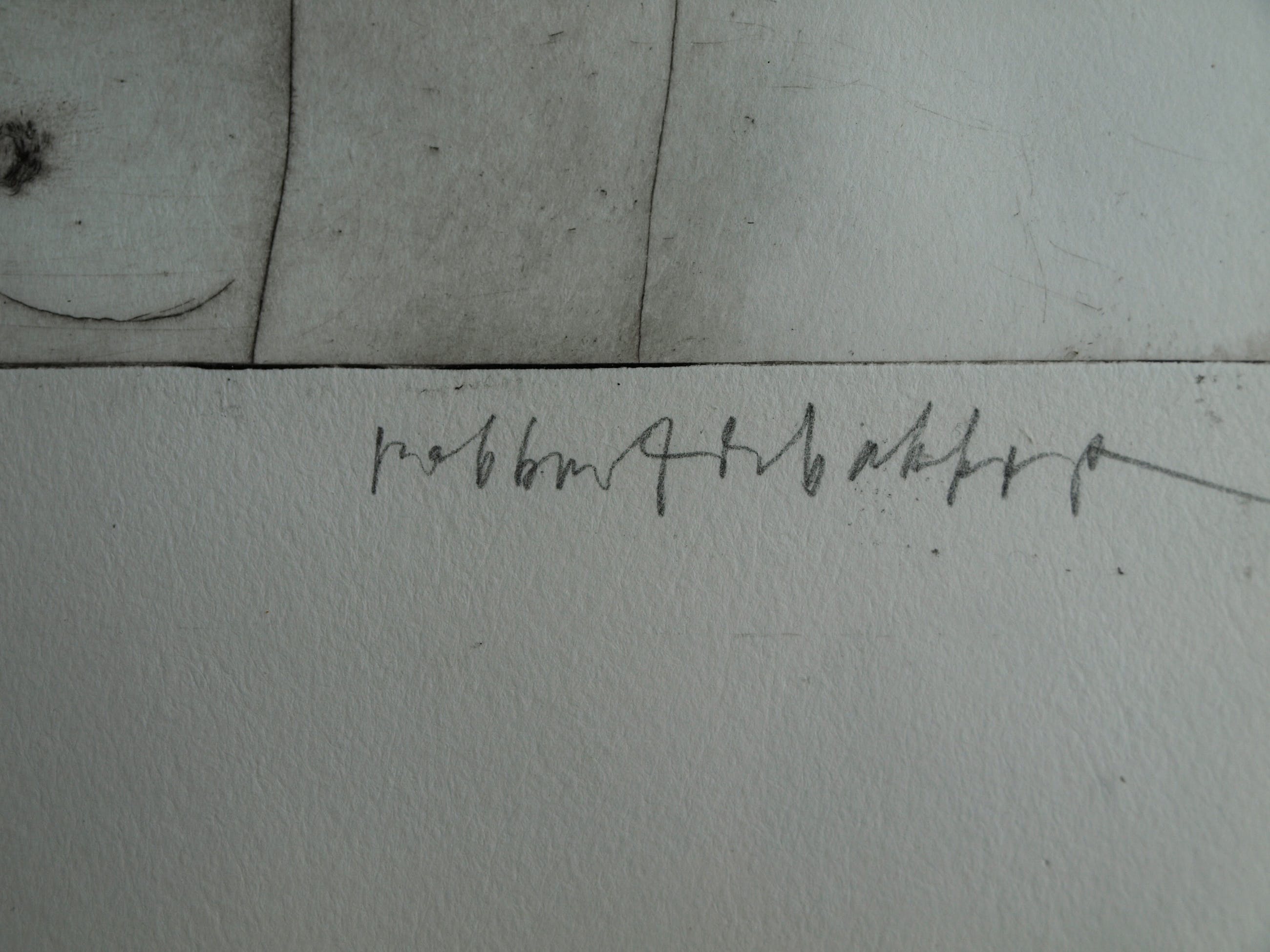 Een ingelijste droge naald ets uit 1991 van de Nederlandse kunstenaar (en meestervervalser?) Robbert de Bakker (1942).