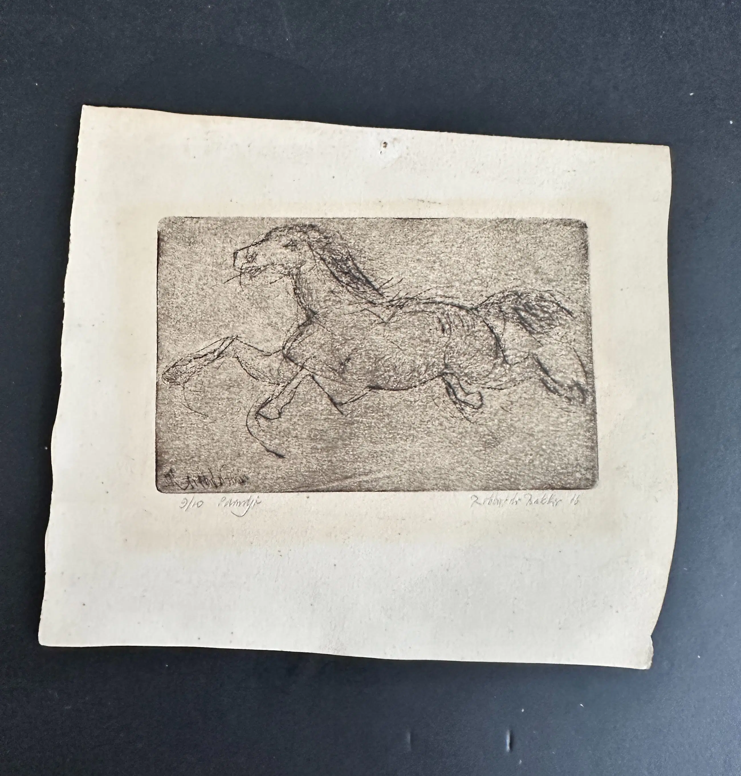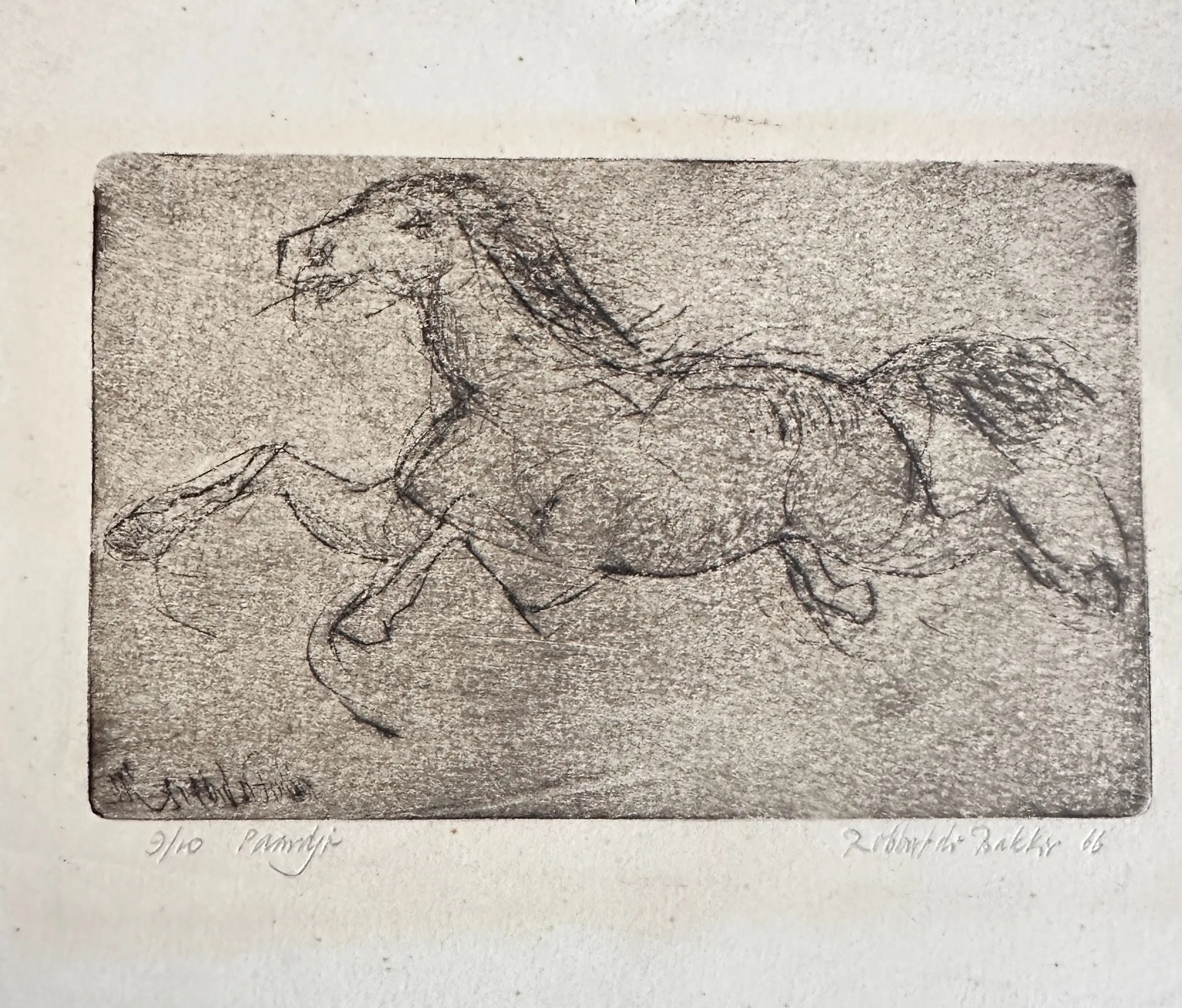 Afmetingen Plaat: 6.7 x 10.8 cm Papier maat 13 x 15 cm Rechtsonder gesigneerd: Robbert de Bakker '66 , Linksonder: 9/10. Paardje.