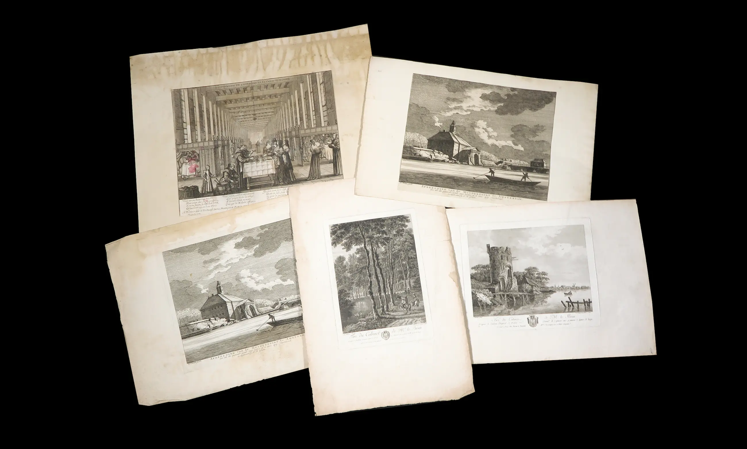 | Redelijk tot goede staat gezien de leeftijd. Alle werken hebben wel vochtschade, maar slechts bij twee loopt deze vochtschade over in de voorstelling. Tevens lichte beschadigingen aan de randen en hoeken van de bladen. De prent die als laatste in de foto's te zien is, is wel in slechtere staat: verkleuringen links, fragiel en verkleurd papier, nogal wat vochtschade. | |||||||||||