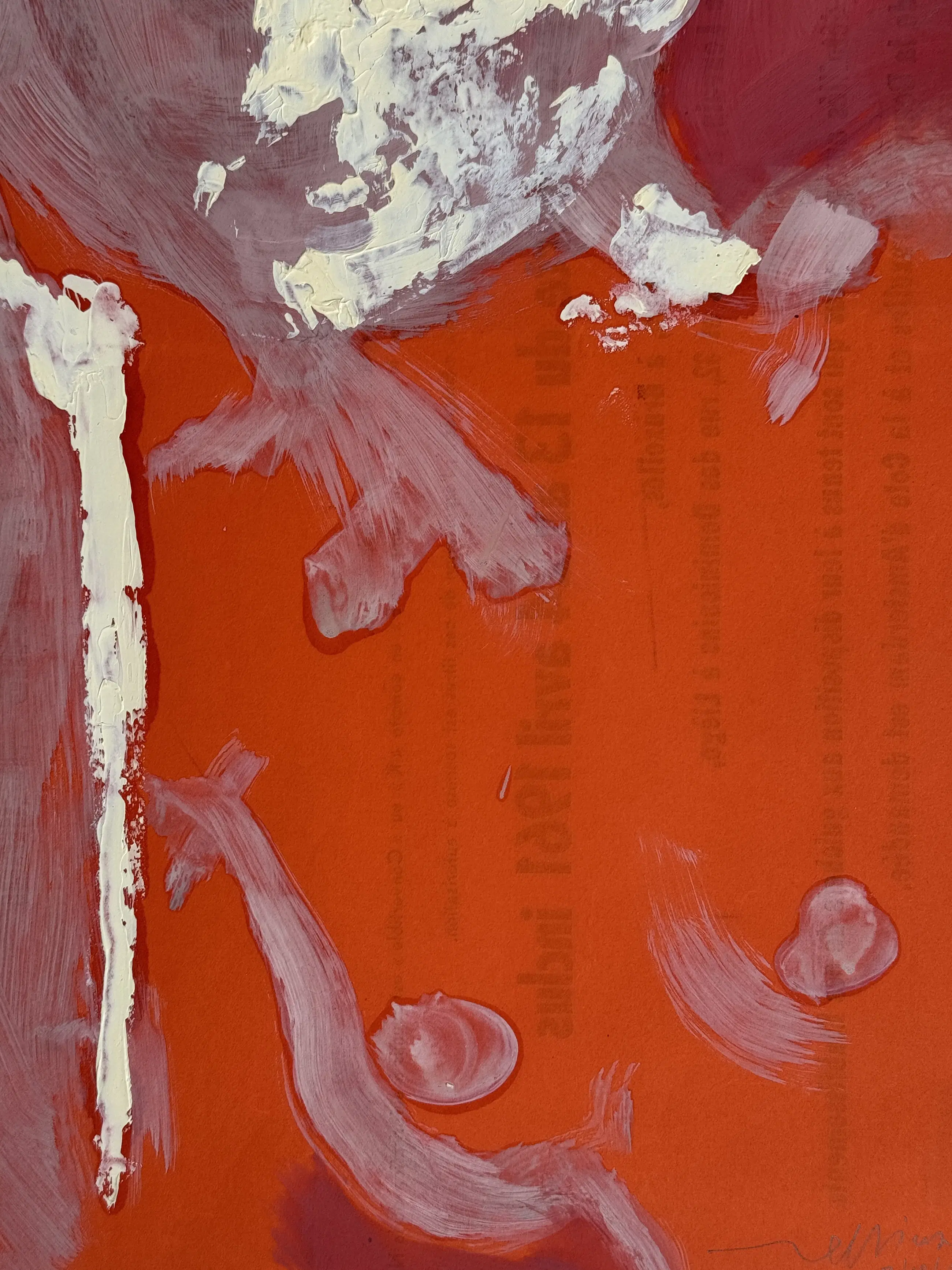 Het schilderij gebruikt rode en witte tinten die een opvallend contrast creëren. De penseelstreken zijn breed en gebarend, wat dynamiek en diepte aan het werk toevoegt.
