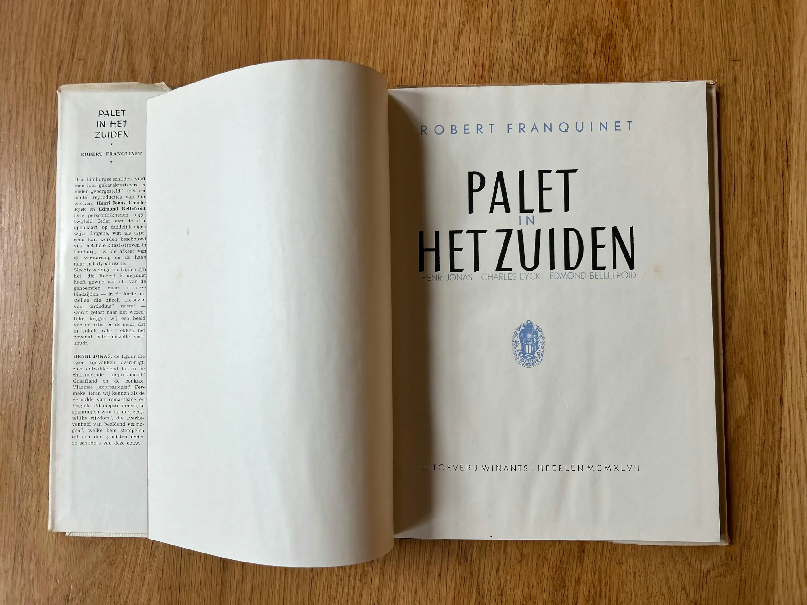 Hardcover uitgave van Palet in het Zuiden, geschreven door Robert Franquinet en uitgegeven in oktober 1947 door Uitgeverij Winants te Heerlen.