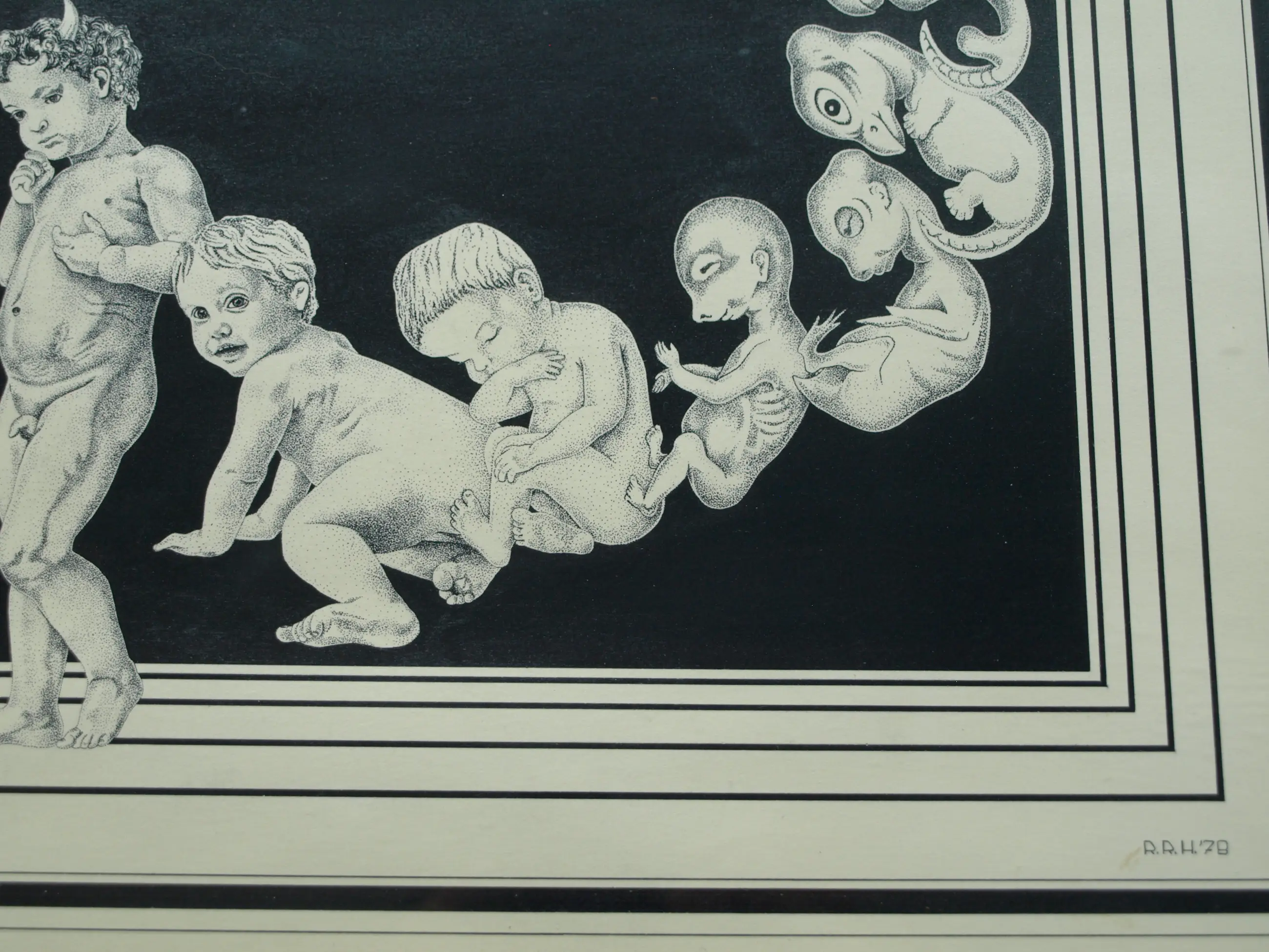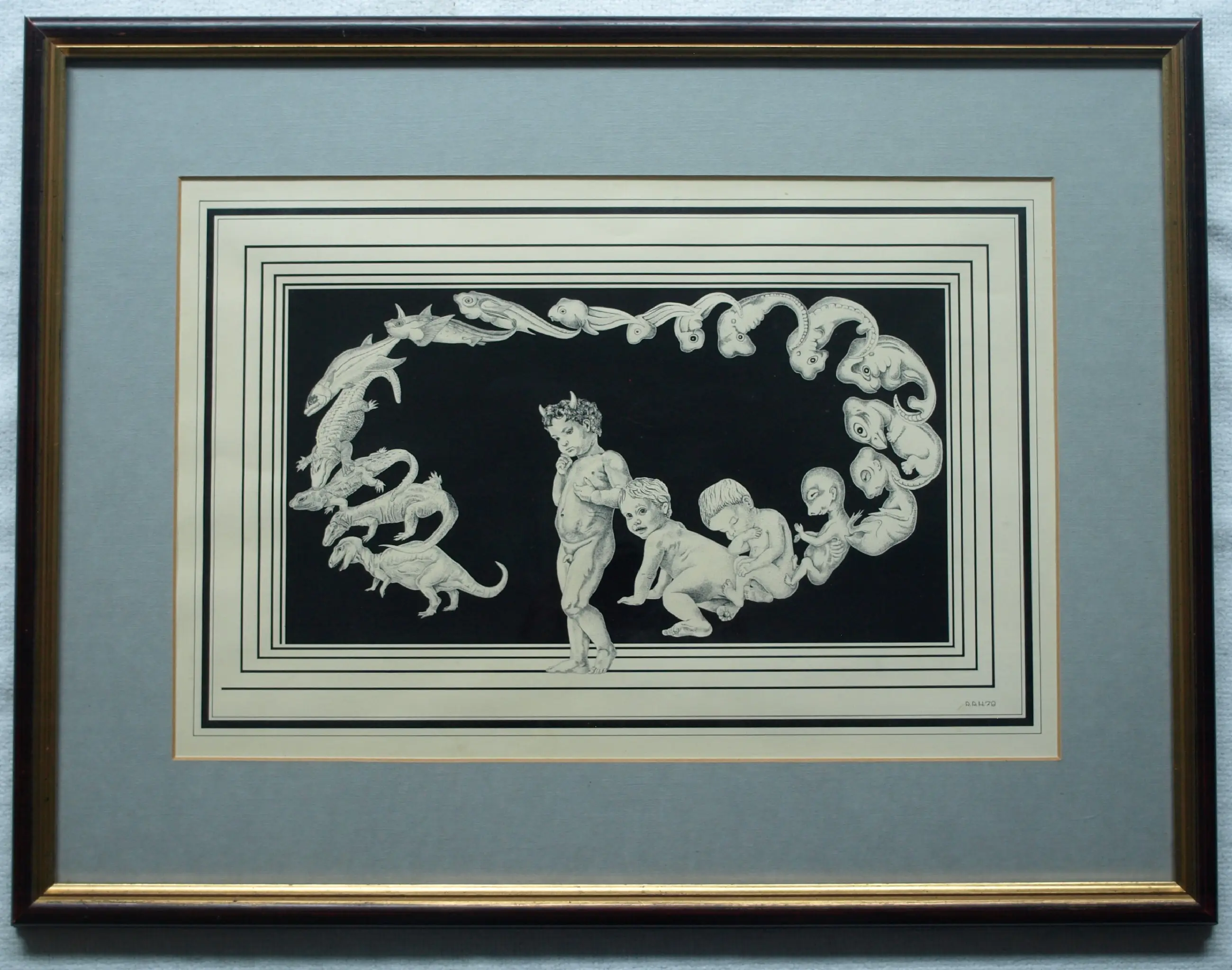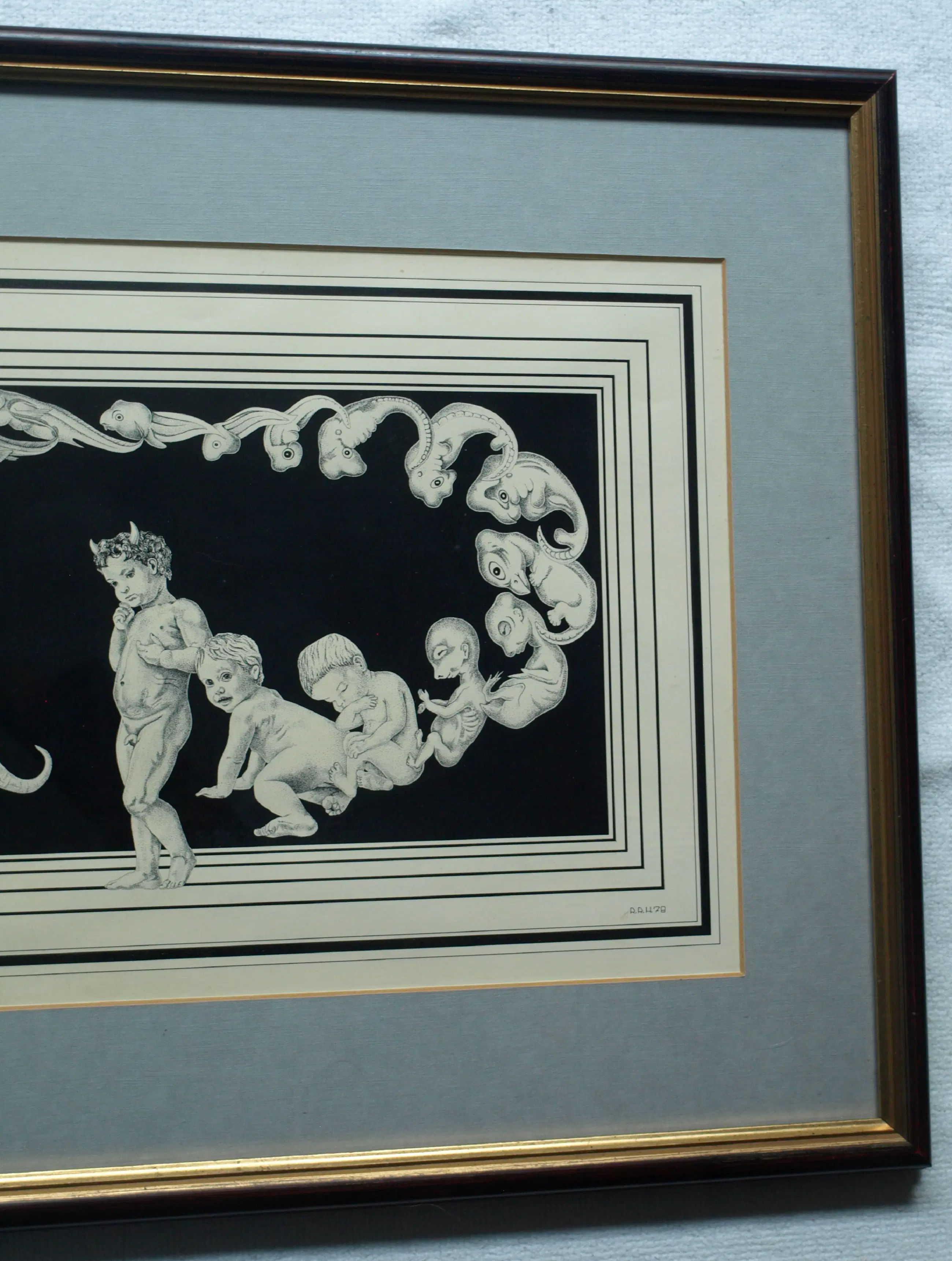 Robert Hallatu - Ingelijste inkttekening , ‘Kringloop…’ – 1978 – Lijst, 49 x 64 cm.