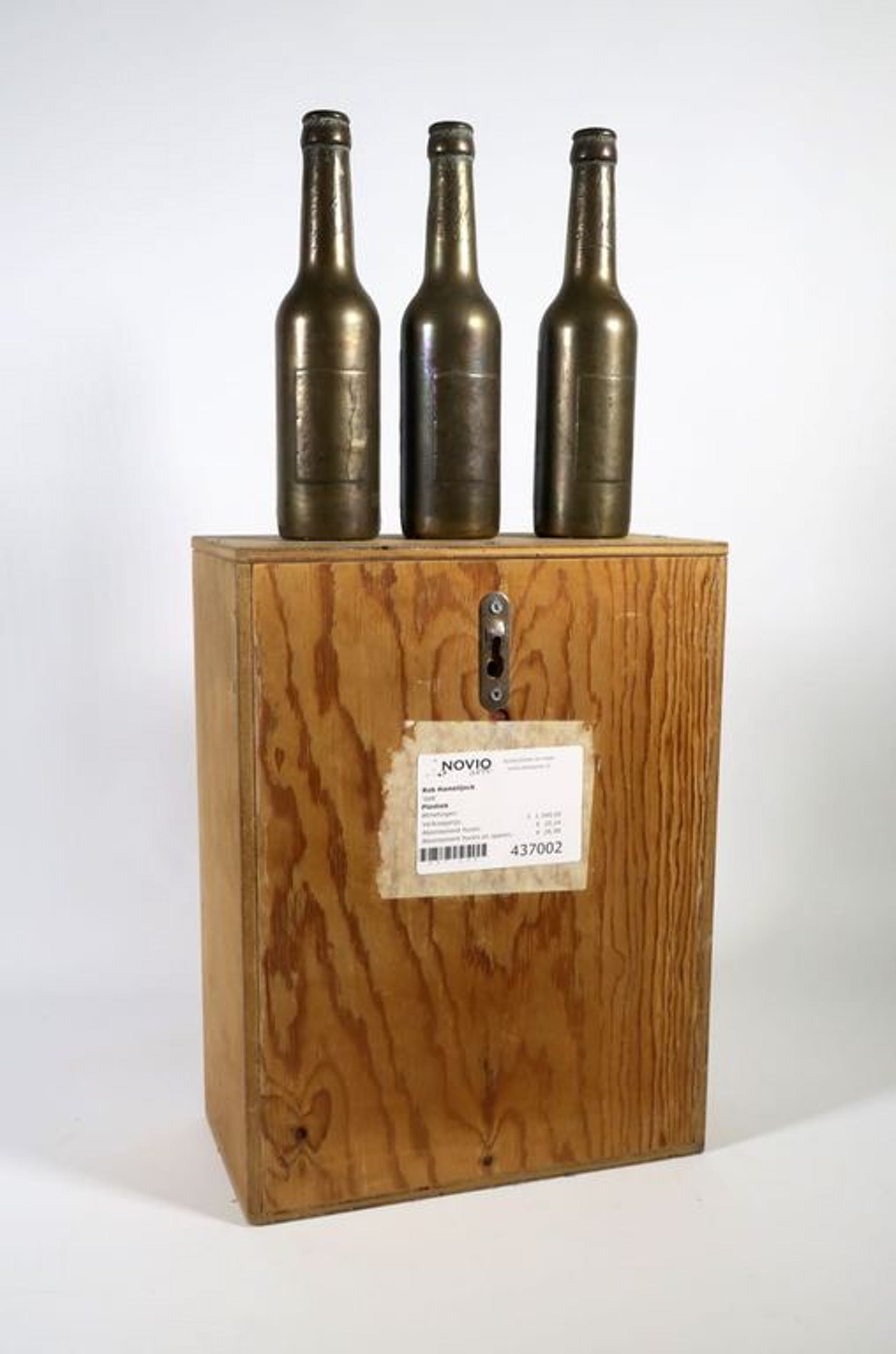 Materiaal: 3 Bronzen flesjes op een houten kist