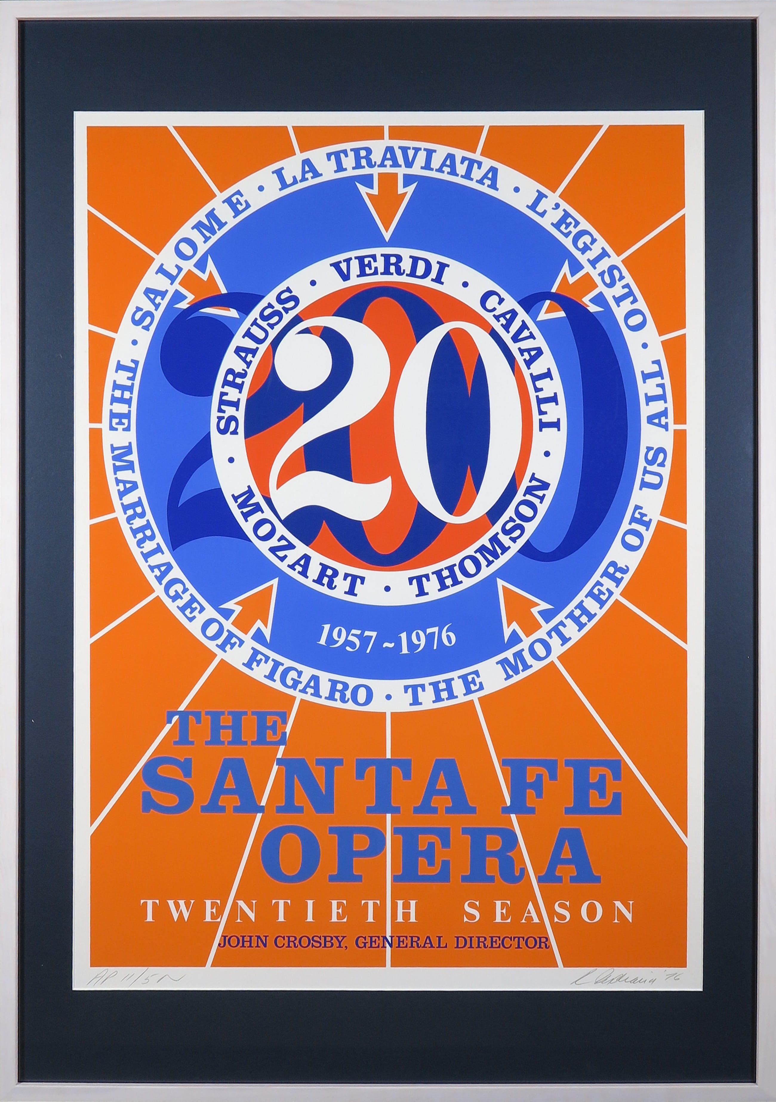 Grote helder gekleurde zeefdruk, door Robert Indiana ontworpen en met de hand gesigneerd en genummerd. Indiana heeft deze voorstelling ontworpen voor het 20-jarig bestaan van The Santa Fe Opera.