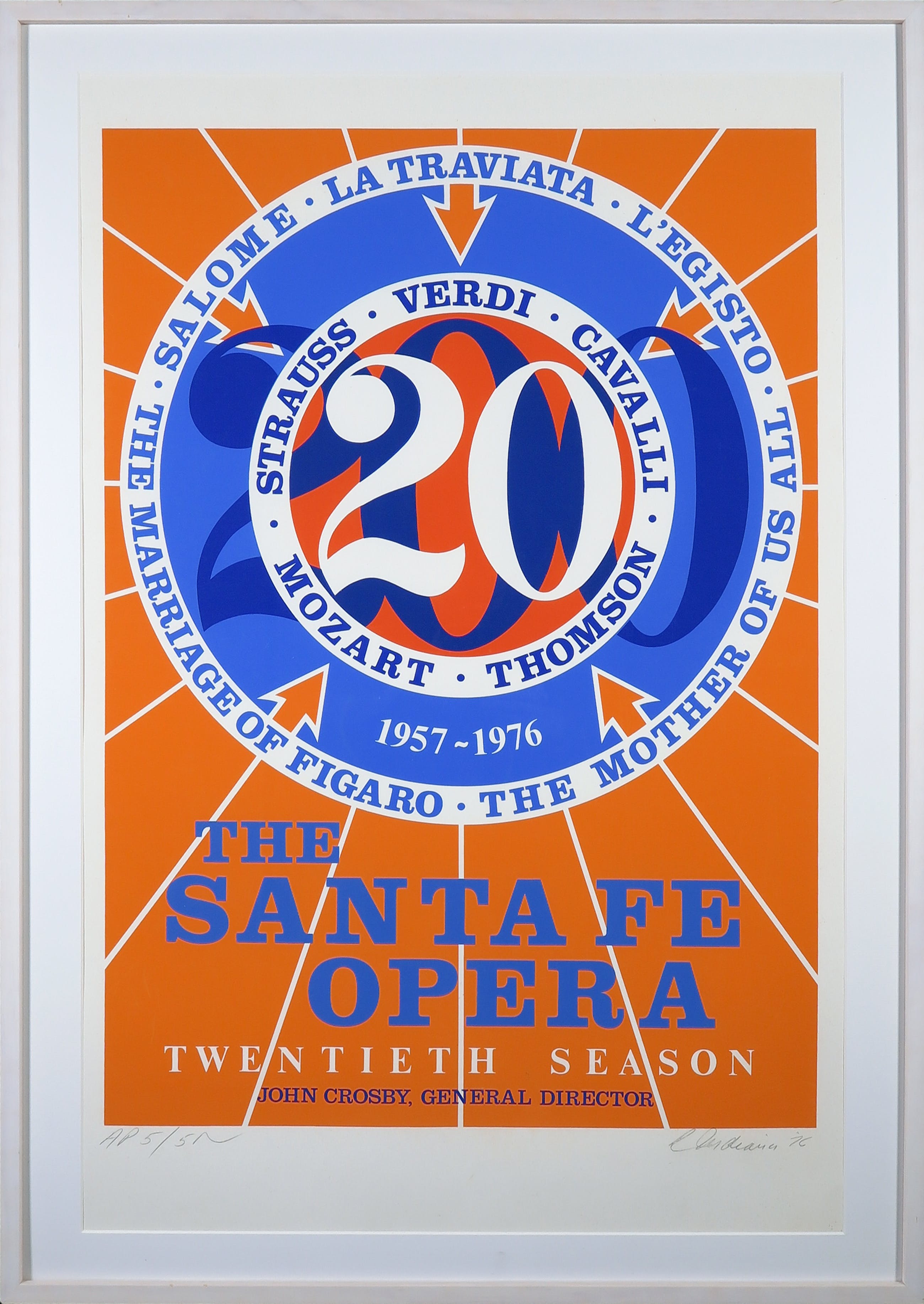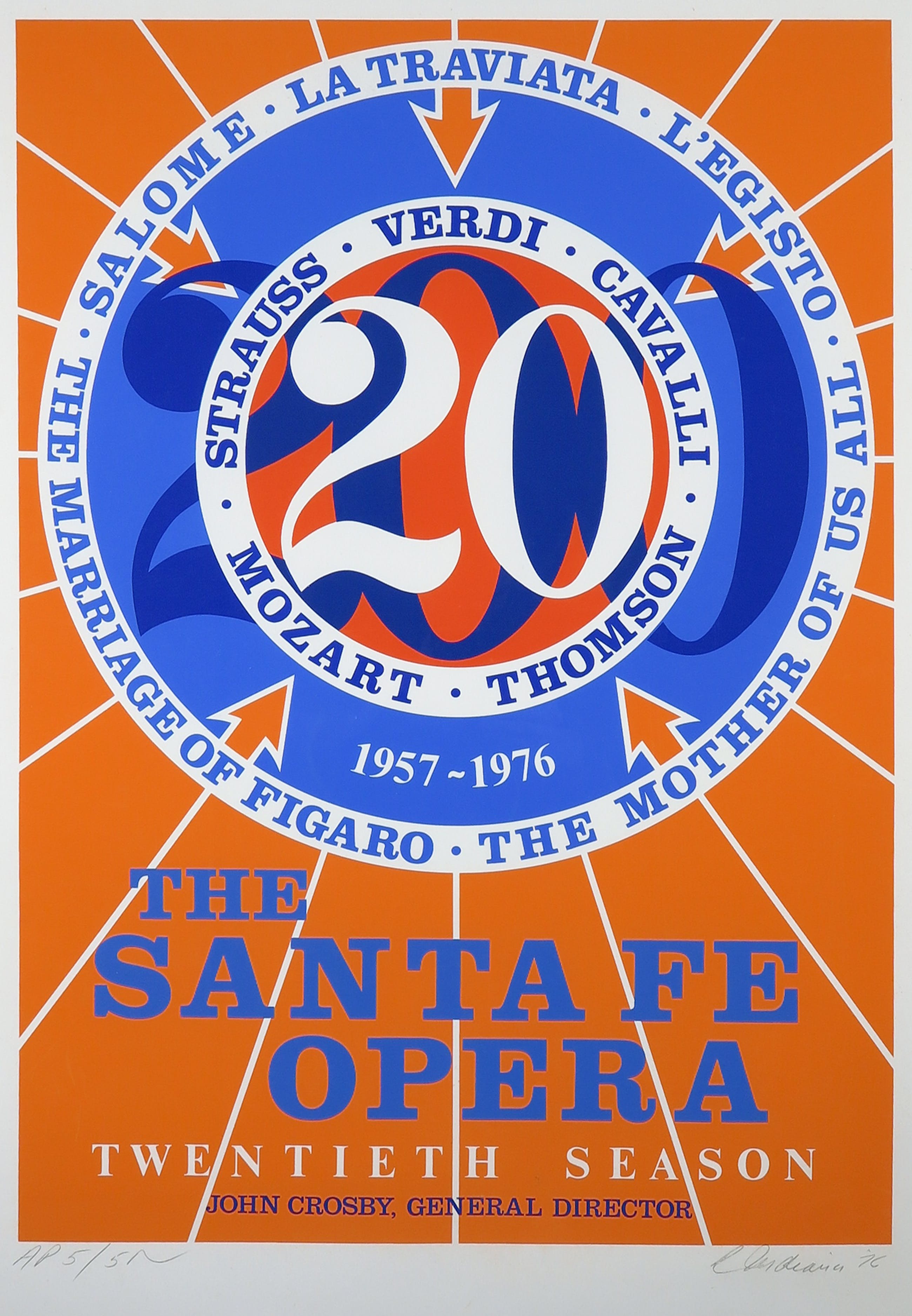 Grote helder gekleurde zeefdruk, door Robert Indiana ontworpen en met de hand gesigneerd en genummerd. Indiana heeft deze voorstelling ontworpen voor het 20-jarig bestaan van The Santa Fe Opera.