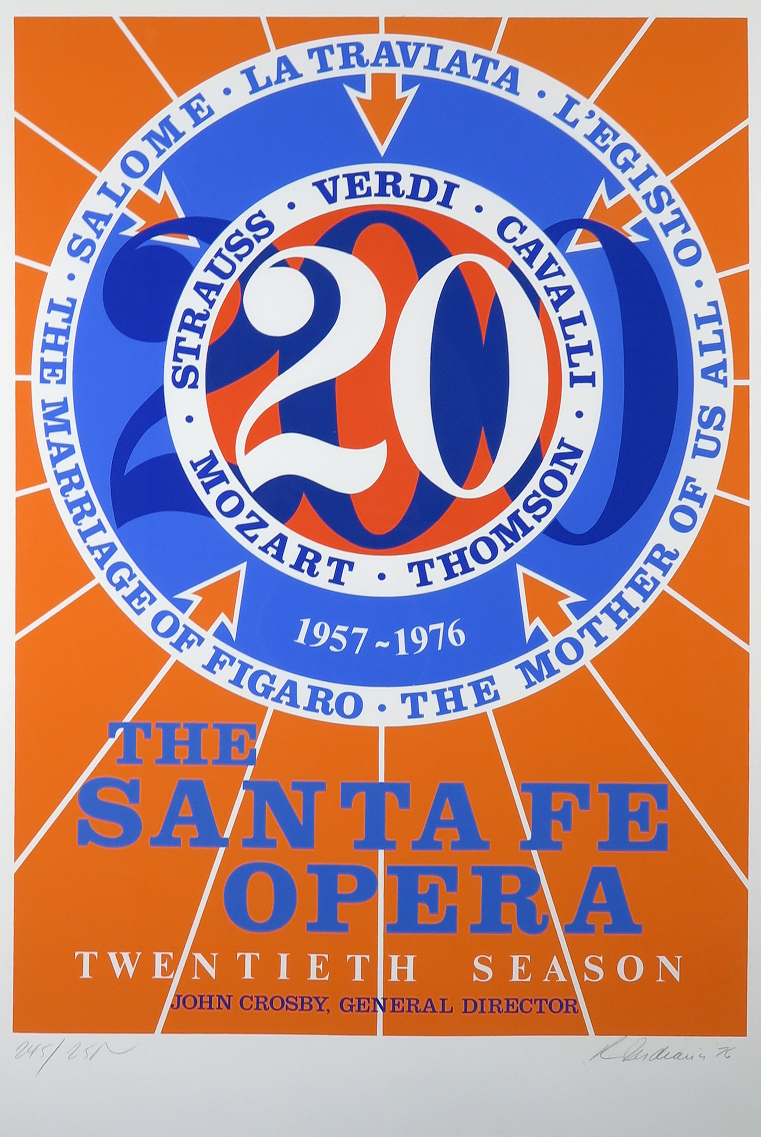 Grote helder gekleurde zeefdruk, door Robert Indiana ontworpen en met de hand gesigneerd en genummerd. Indiana heeft deze voorstelling ontworpen voor het 20-jarig bestaan van The Santa Fe Opera.