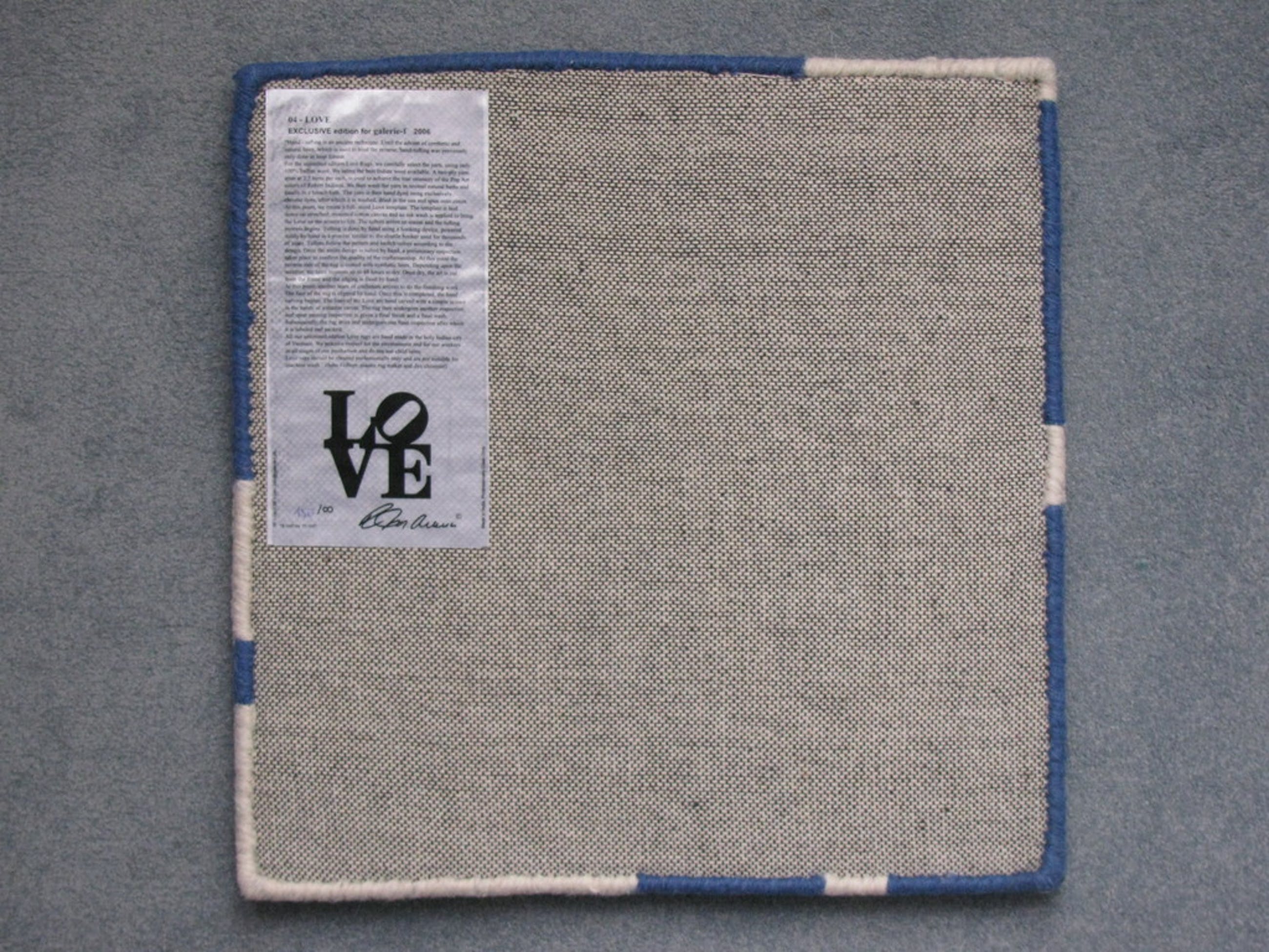 "Love", tapijtje van pop-art-kunstenaar Robert Indiana, met de hand geweven in 100 % Indische wol.